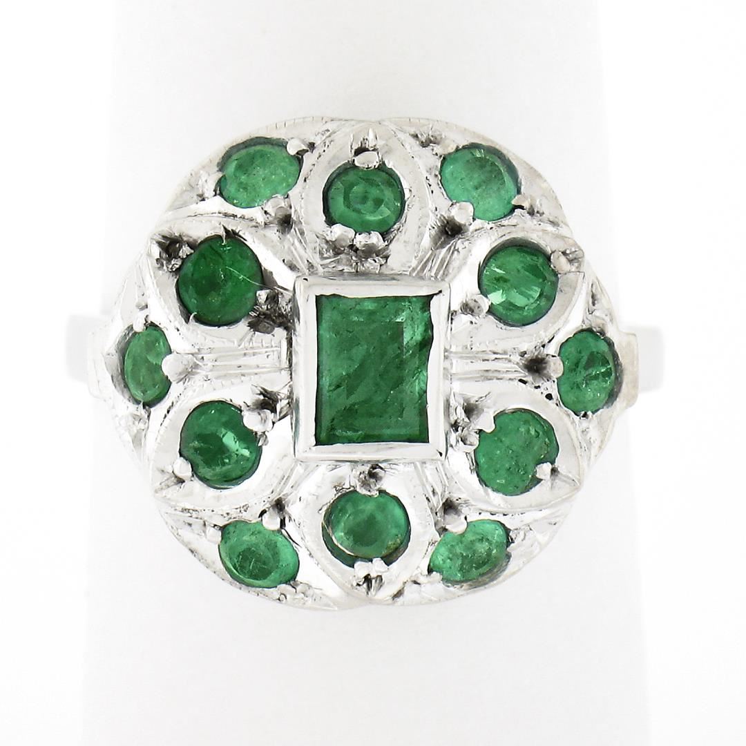 A vintage solid 14k white gold ring, with 12 round brilliant cut natural emeralds (0.70ctw), and 1 rectangular cut natural emerald (0.30ct). The ring is size 7.0, weighs a total of 3.93 grams, and measures 15.15mm wide.