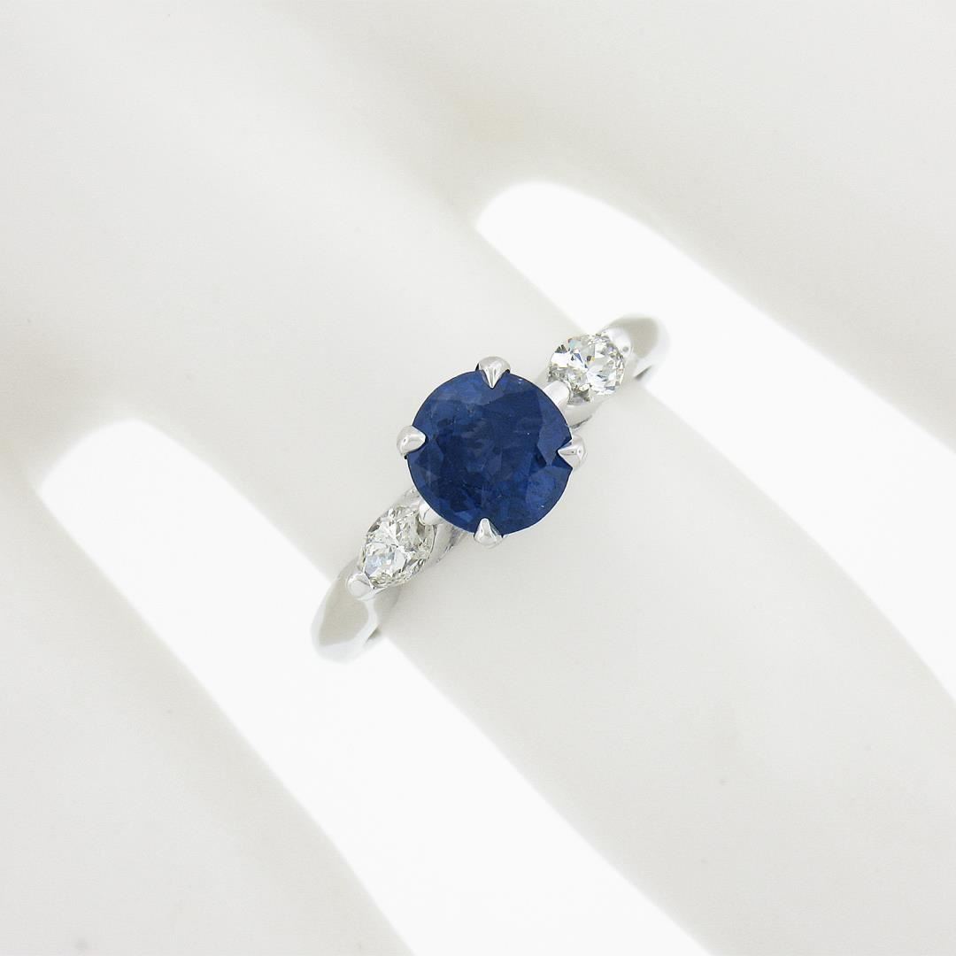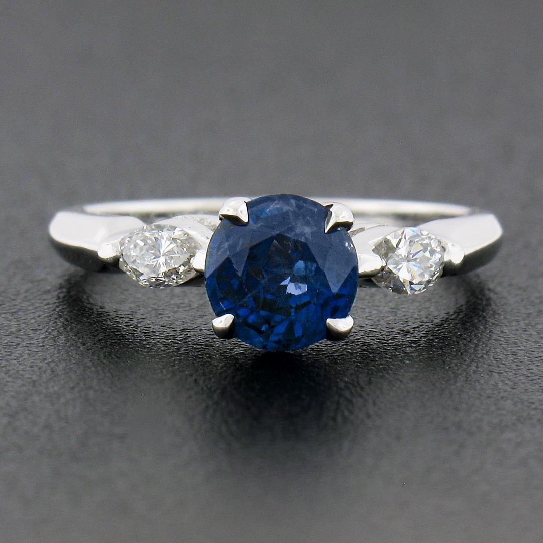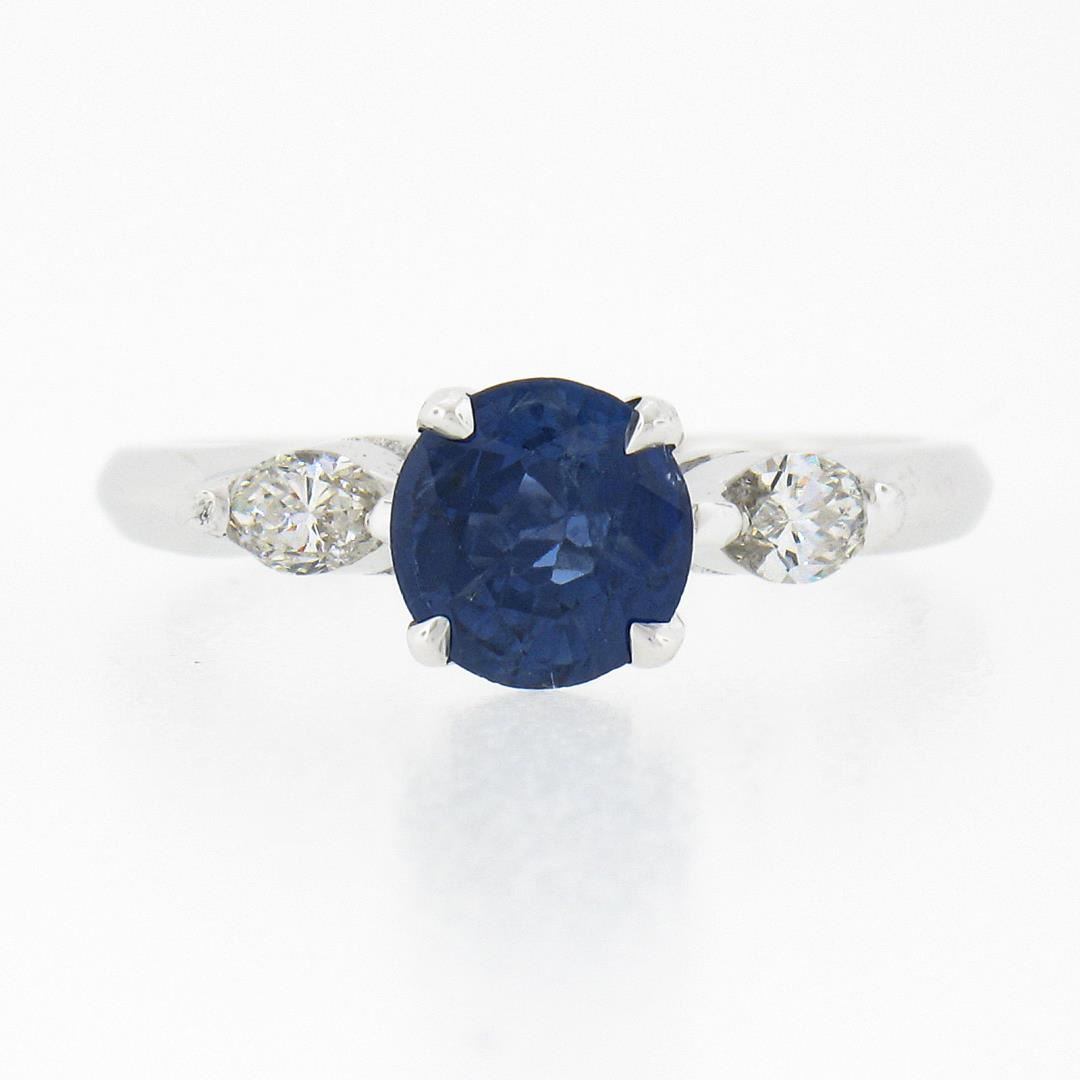 A vintage solid 14k white gold ring, with 1 GIA certified round brilliant cut natural sapphire (0.98ct ), and 2 marquise cut natural diamonds (G/H - VS1/VS2 ; 0.30ctw). The ring is size 4.5, weighs a total of 2.45 grams, and measures 6.12mm wide. Comes with all original relevant certifications.