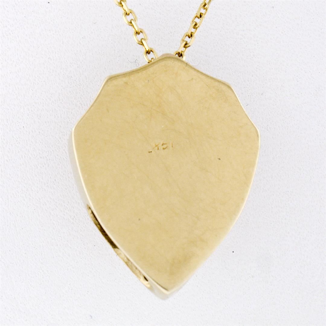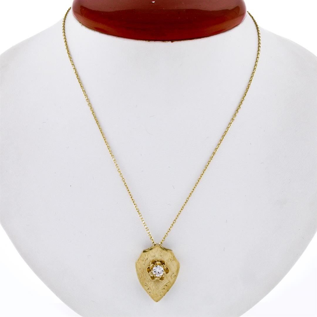 A vintage 14k yellow gold necklace featuring a hand-etched reversible shield pendant that is topped with a 0.40ct round transitional cut diamond (F - SI1) 6-prong set above a dual flower motif. 18 inch cable link chain, 7.76 grams total weight, pendant measures 12.15x9.50mm.