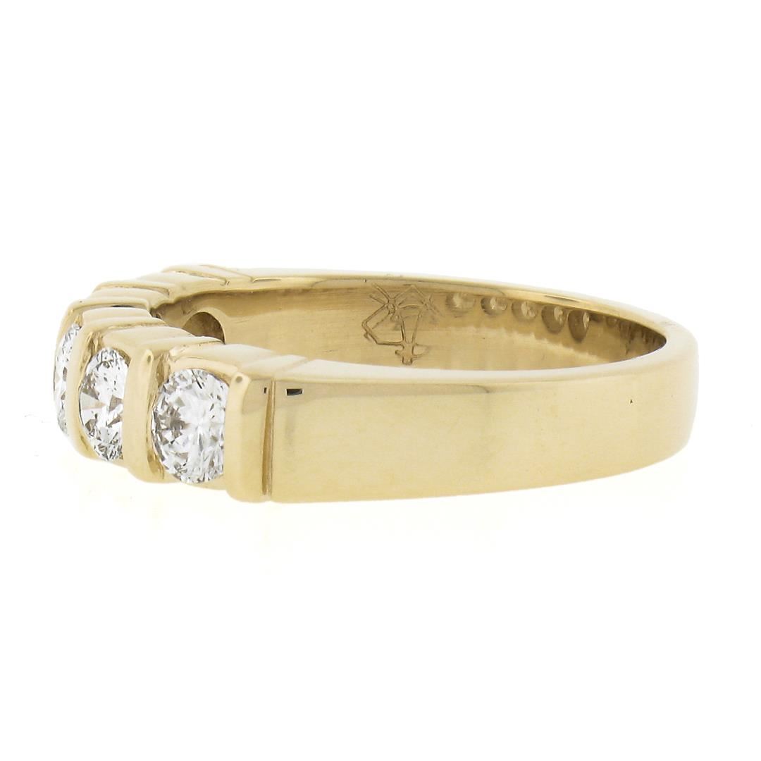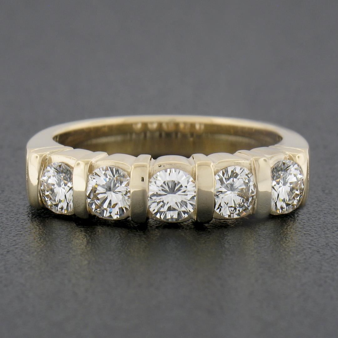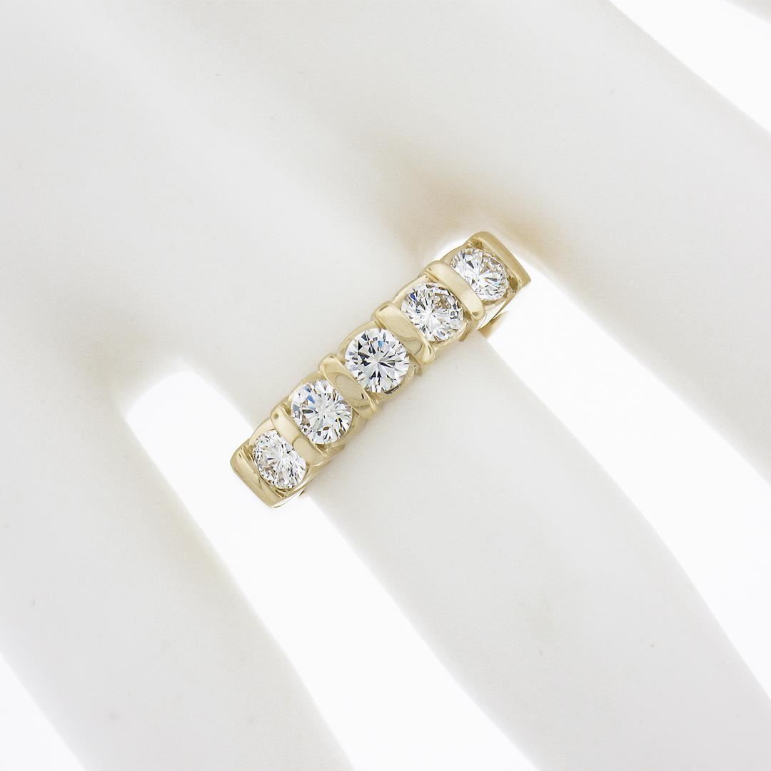 A vintage solid 14k yellow gold band ring, with 5 round cut natural diamonds (G/H - VVS2-VS2 ; 0.85ctw). The ring is size 5.25, weighs a total of 4.73 grams, and measures 4.4mm wide.