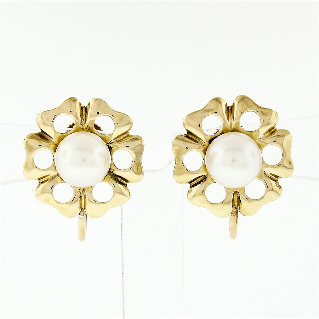 A vintage solid 14k yellow gold earrings, with 2 round shape natural cultured pearls (6.8mm). The earrings measure approximately 14.70mm in diameter and weigh a total of 3.66 grams.