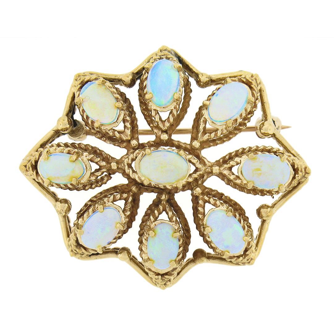 A vintage solid 14k yellow gold brooch pendant, with 9 oval cabochon cut natural opals (6x4mm each). Measures 30x36.3mm and weighs a total of 8.54 grams.