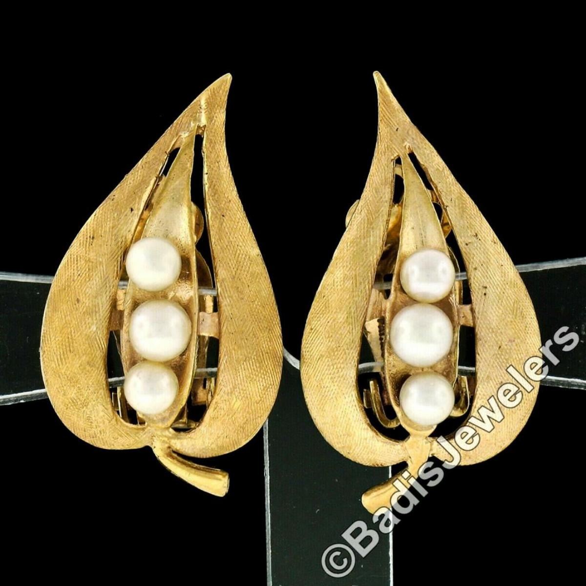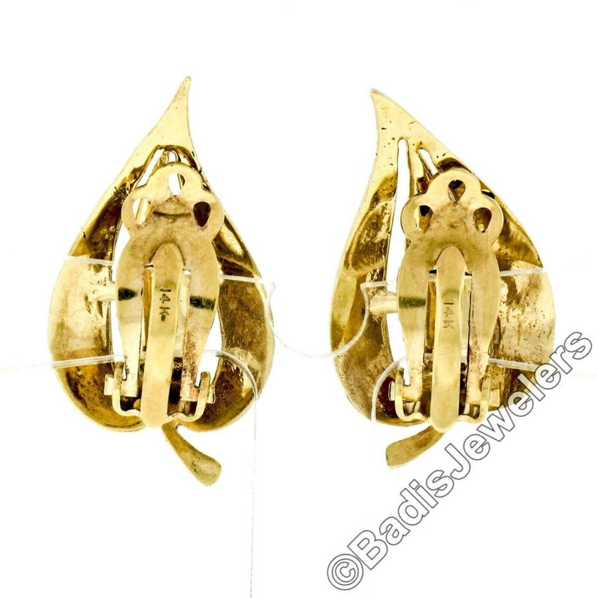 Vintage 14kt Yellow Gold Pearl Florentine Open Leaf Clip On Earrings