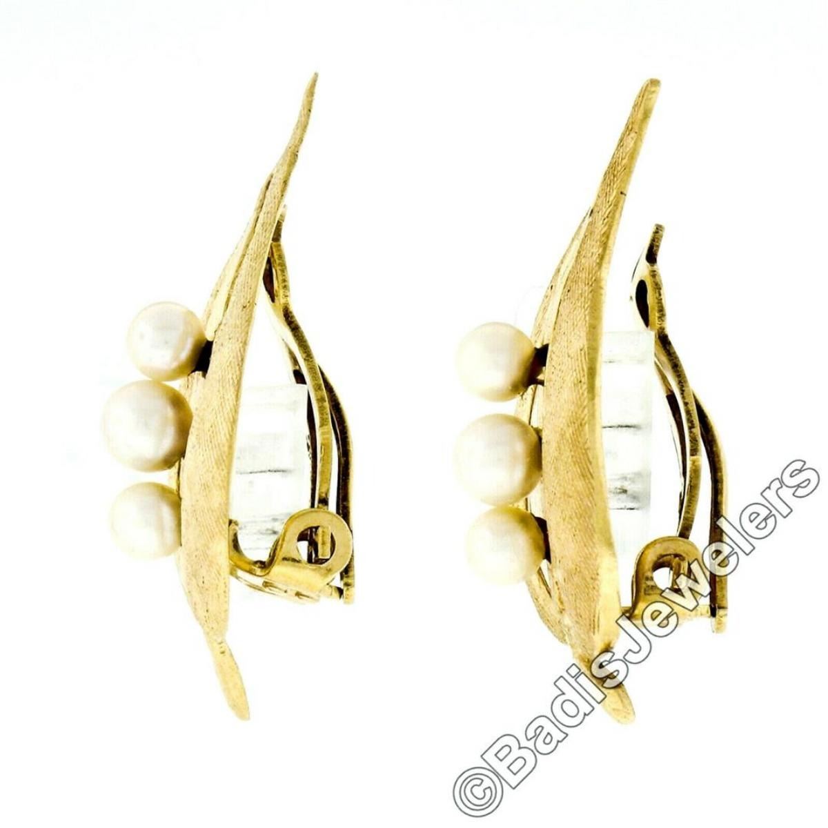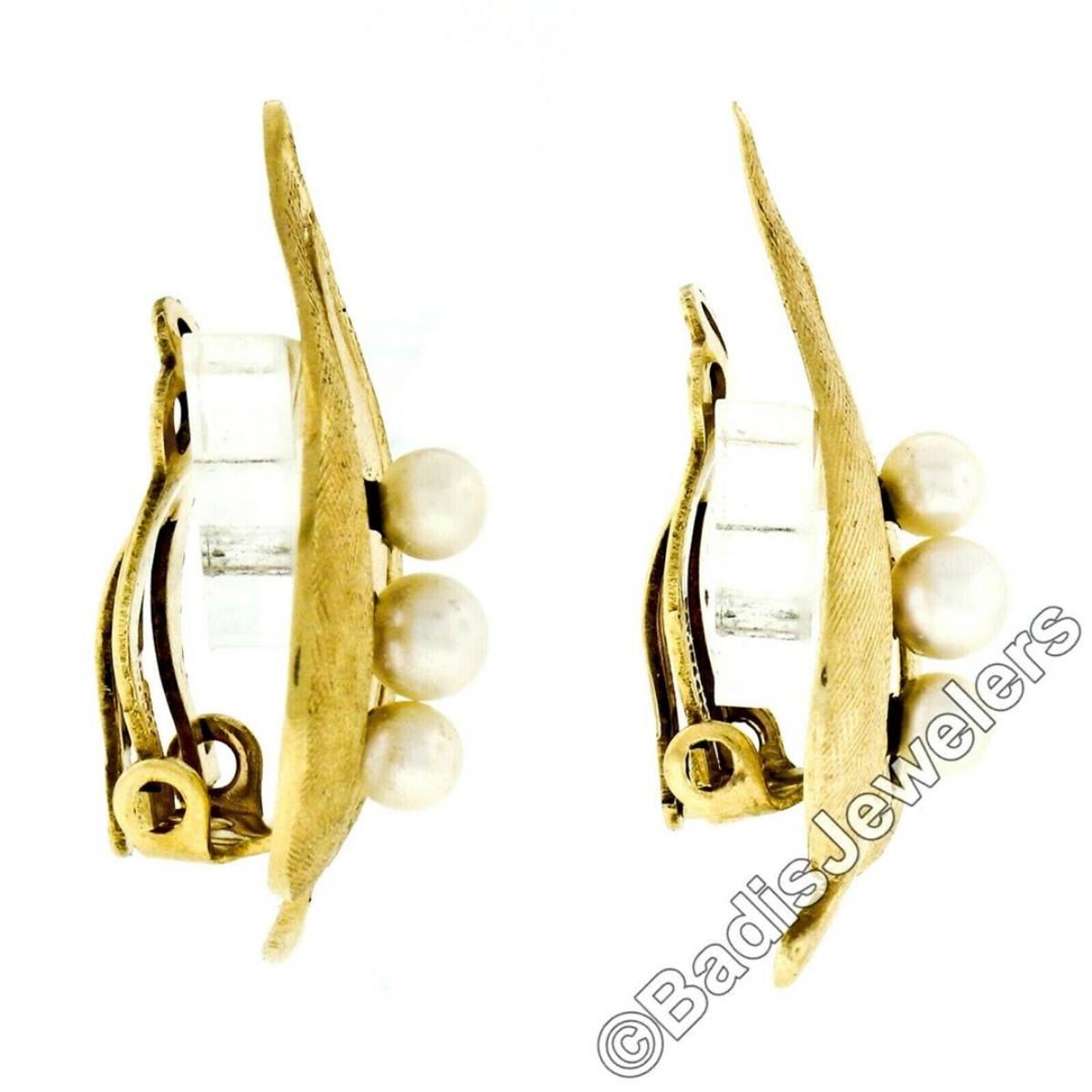 A vintage pair of 14kt yellow gold clip on earrings featuring 6 round cultured pearls measuring from 3.3 to 3.8mm in diameter. The earrings measure approximately 25.85x14.75mm and weigh a total of 5.60 grams.