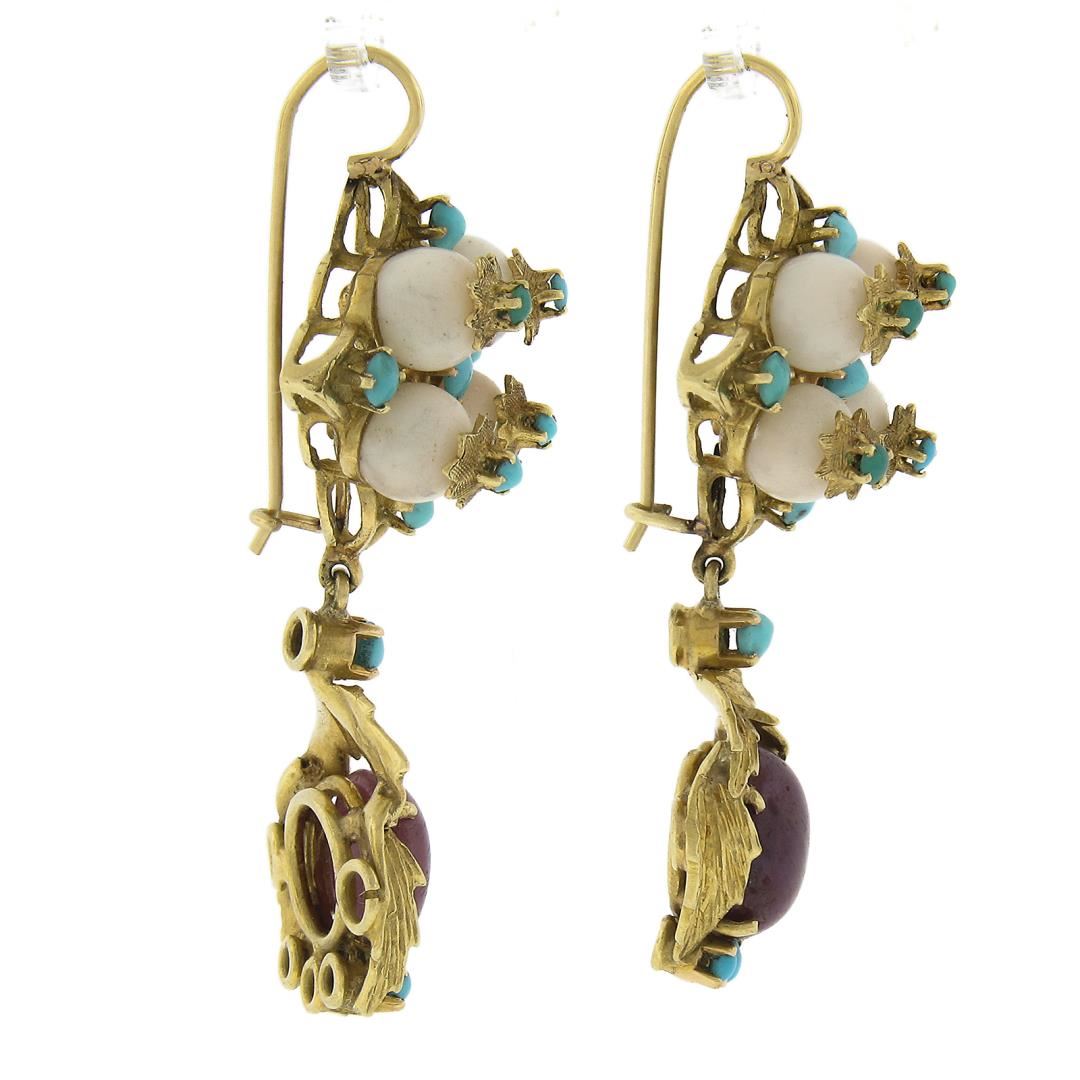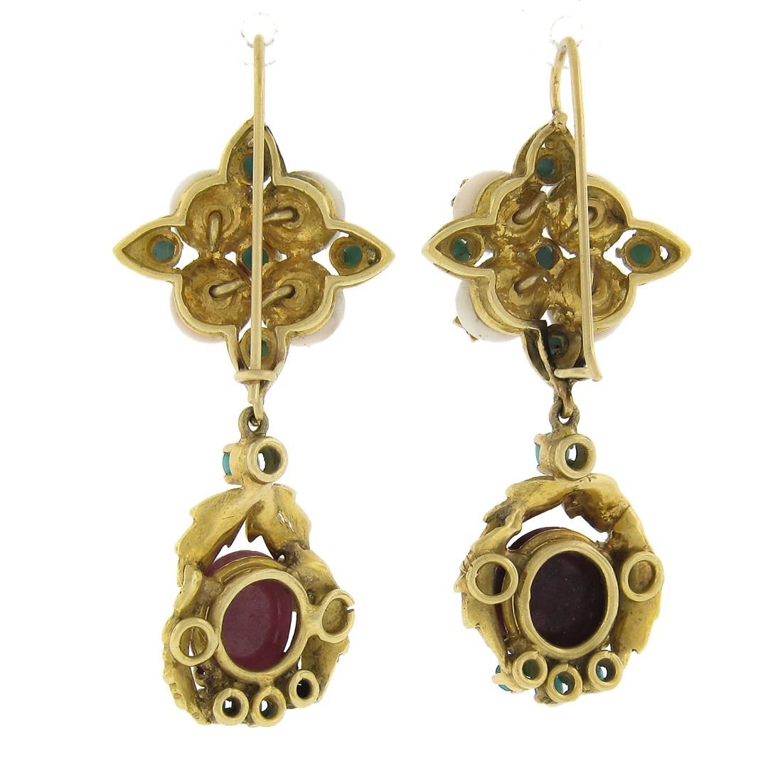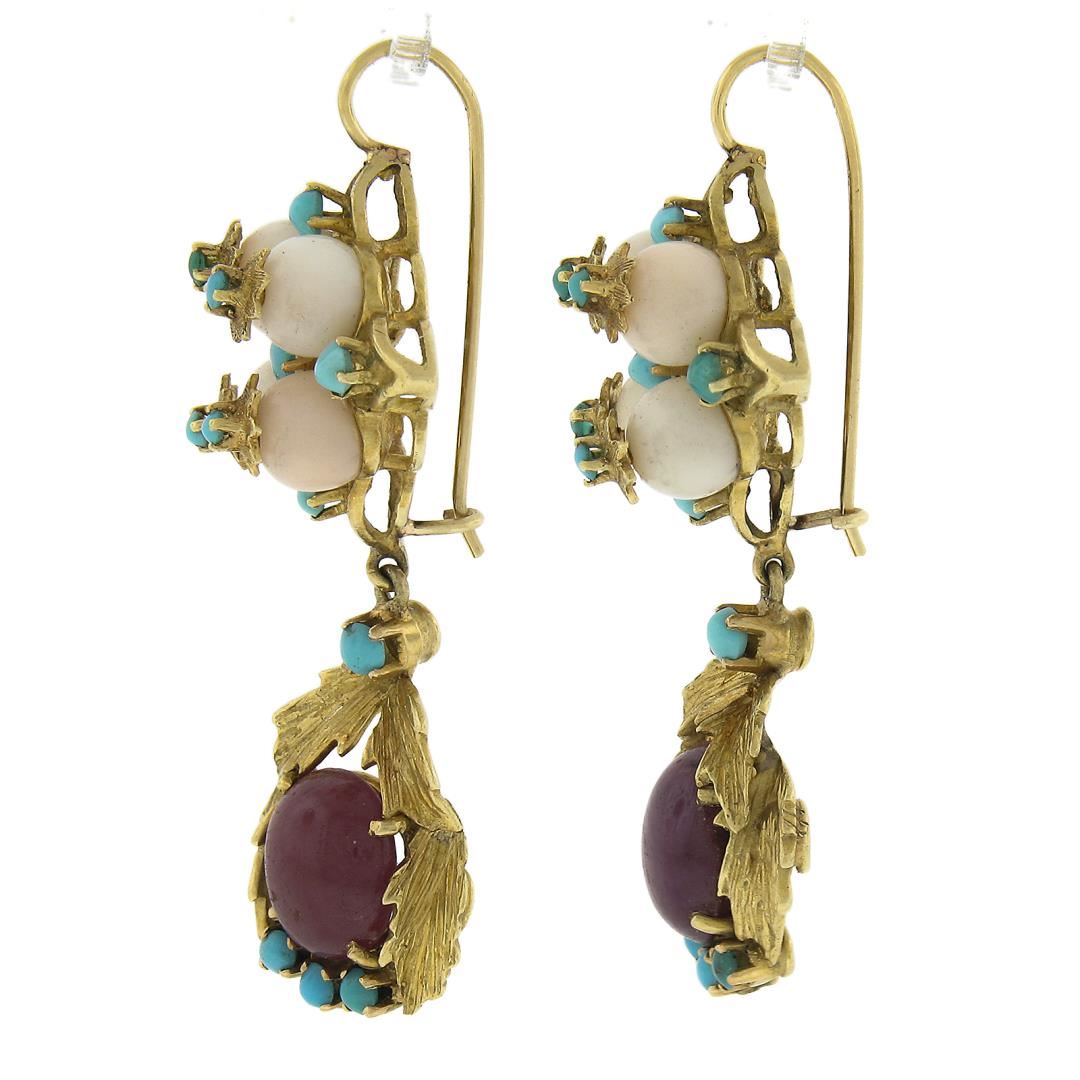 A vintage solid 18k yellow gold drop dangle earrings, with 2 oval cabochon cut natural rubies (9.9x8.4mm ), 8 bead shape natrual corals (6.1mm), and 26 round bead shape natural turquoise (1.9mm to 2.8mm). The earrings measure approximately 50.1x20.1mm and weigh a total of 19.40 grams.