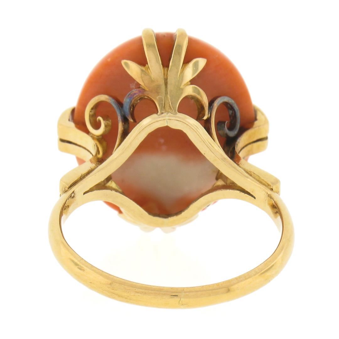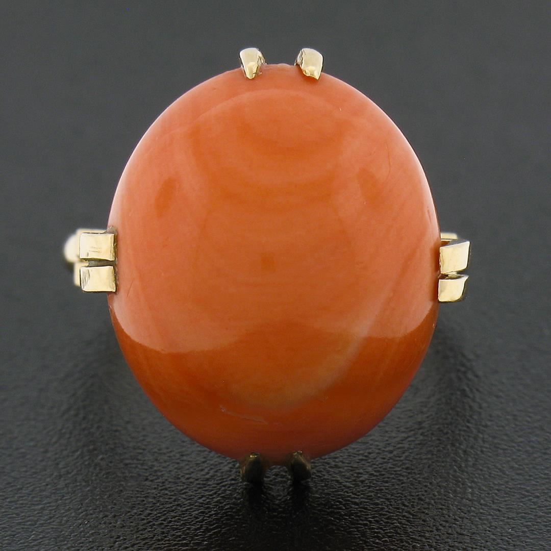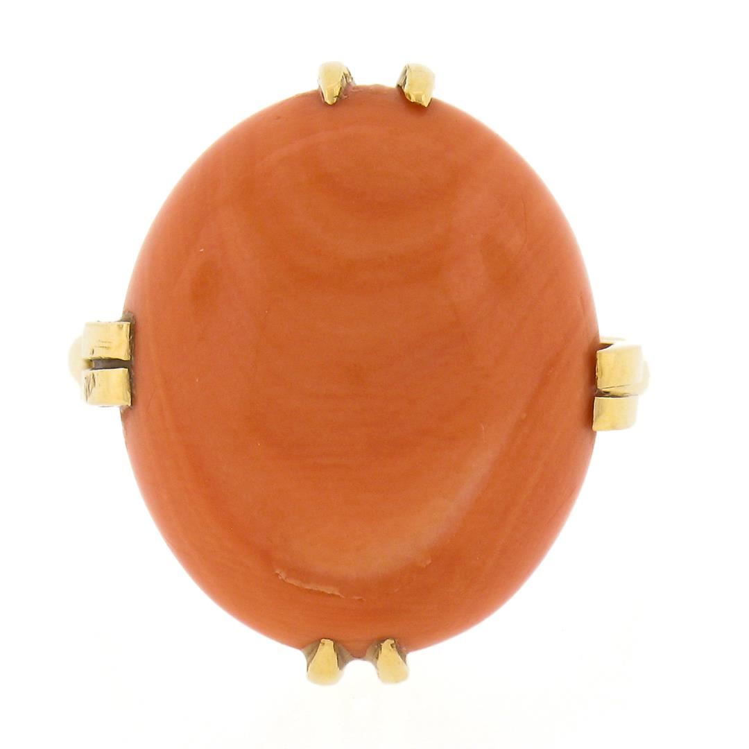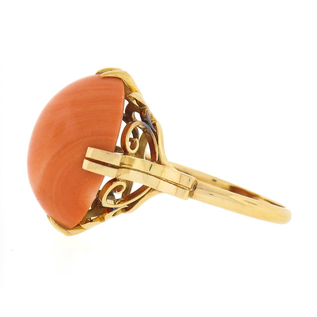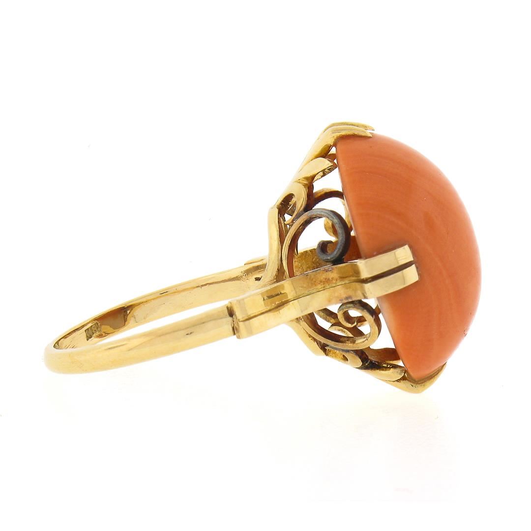 A vintage solid 18k yellow gold ring, with 1 oval cabochon cut natural coral (16.2x13.9mm). The ring is size 5.0, weighs a total of 5.52 grams, and measures 18.1mm wide.