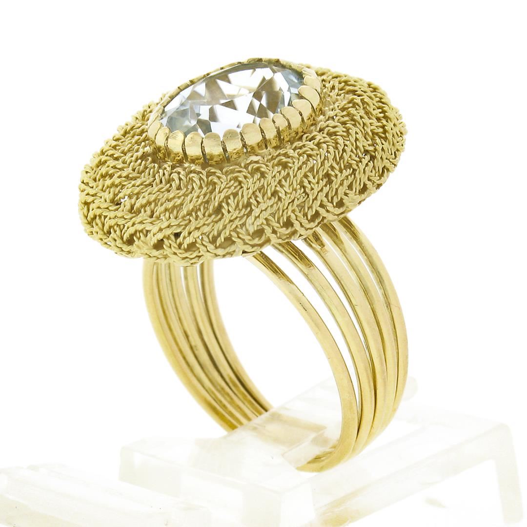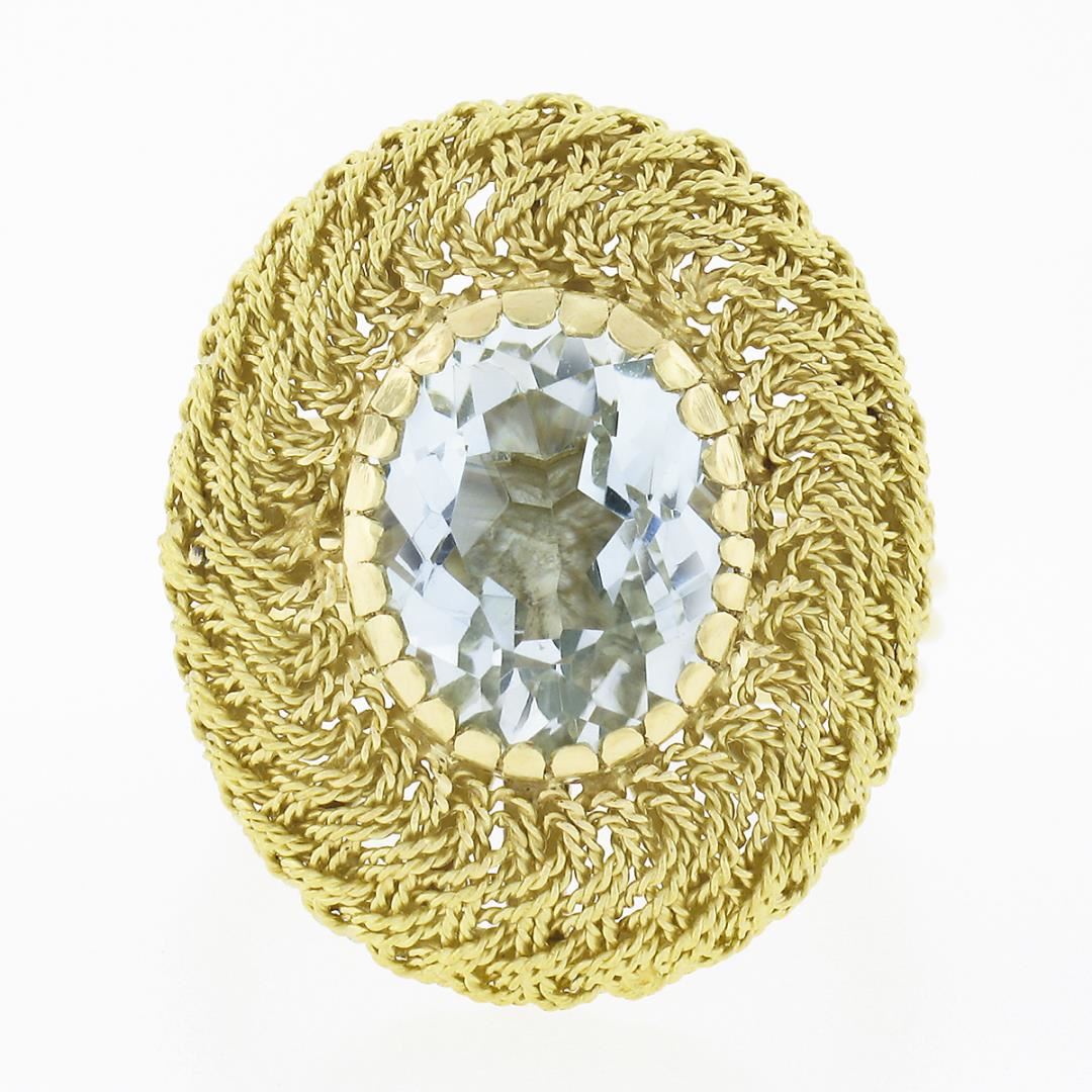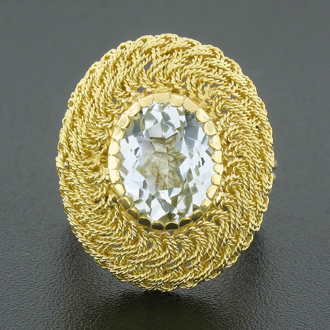 A vintage solid 18k yellow gold wire work ring, with 1 oval cut natural aquamarine (11.50x8.80mm - 3ct). The ring is size 6.5, weighs a total of 9.55 grams, and measures 23.0mm wide.