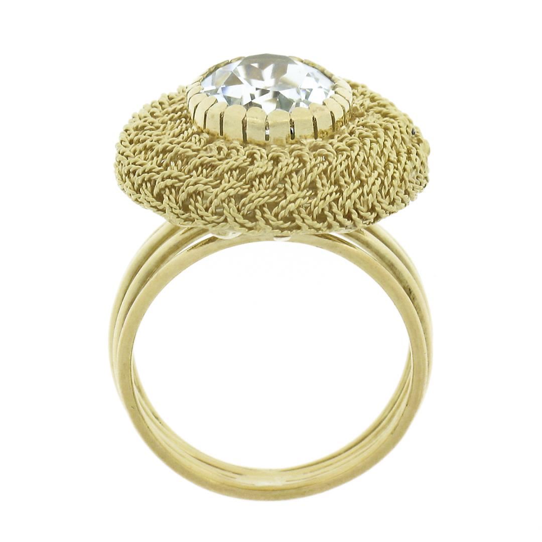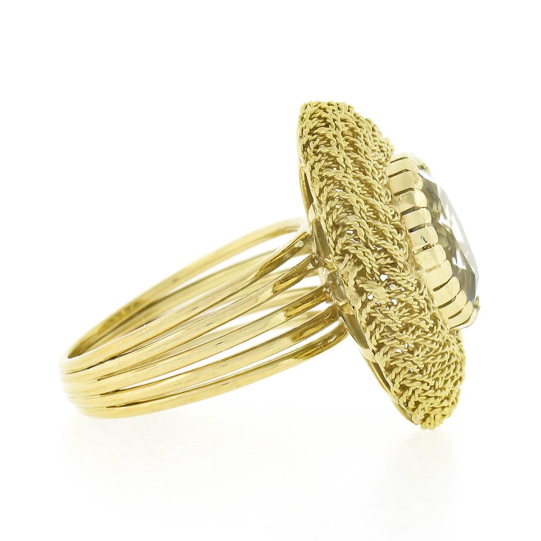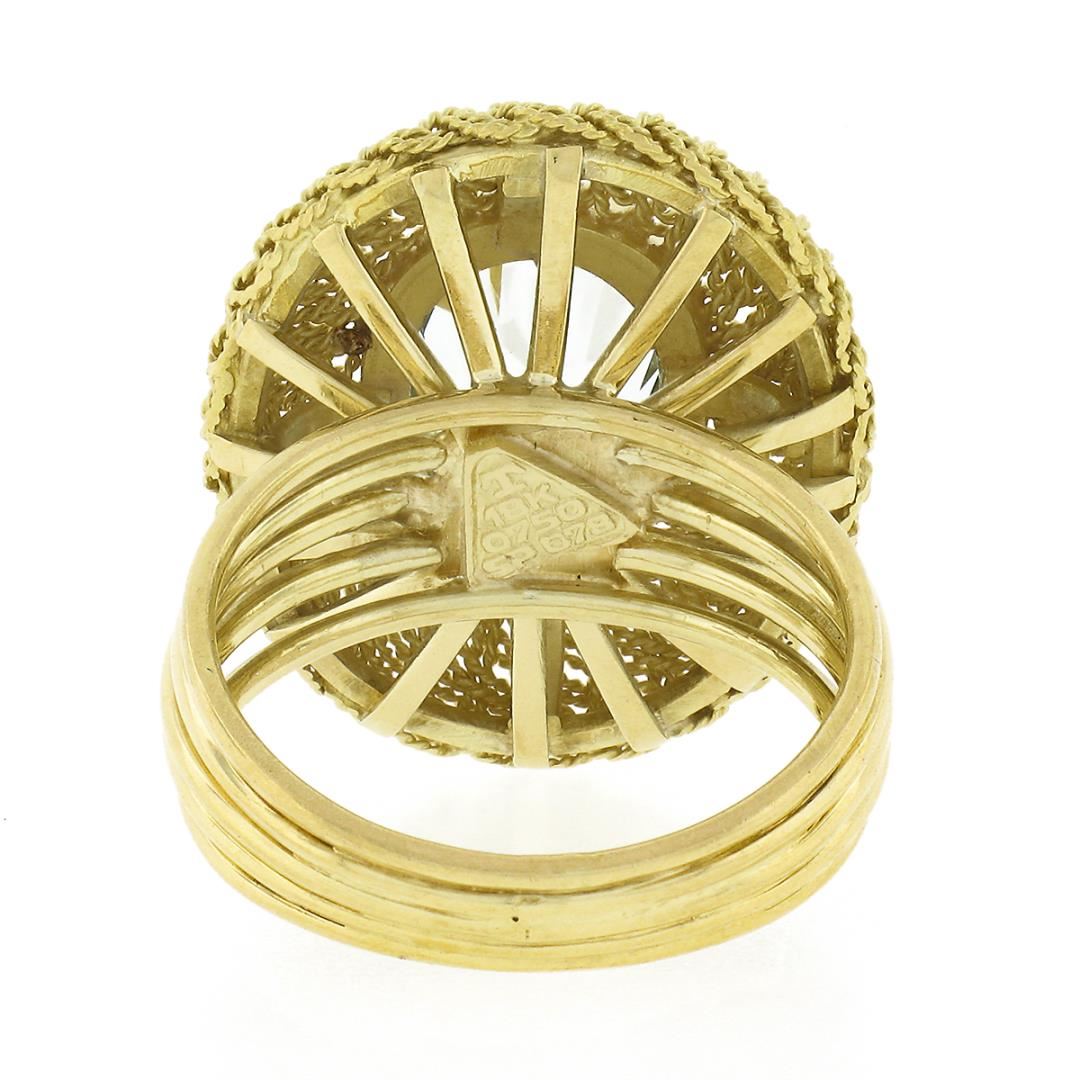A vintage solid 18k yellow gold wire work ring, with 1 oval cut natural aquamarine (11.50x8.80mm - 3ct). The ring is size 6.5, weighs a total of 9.55 grams, and measures 23.0mm wide.