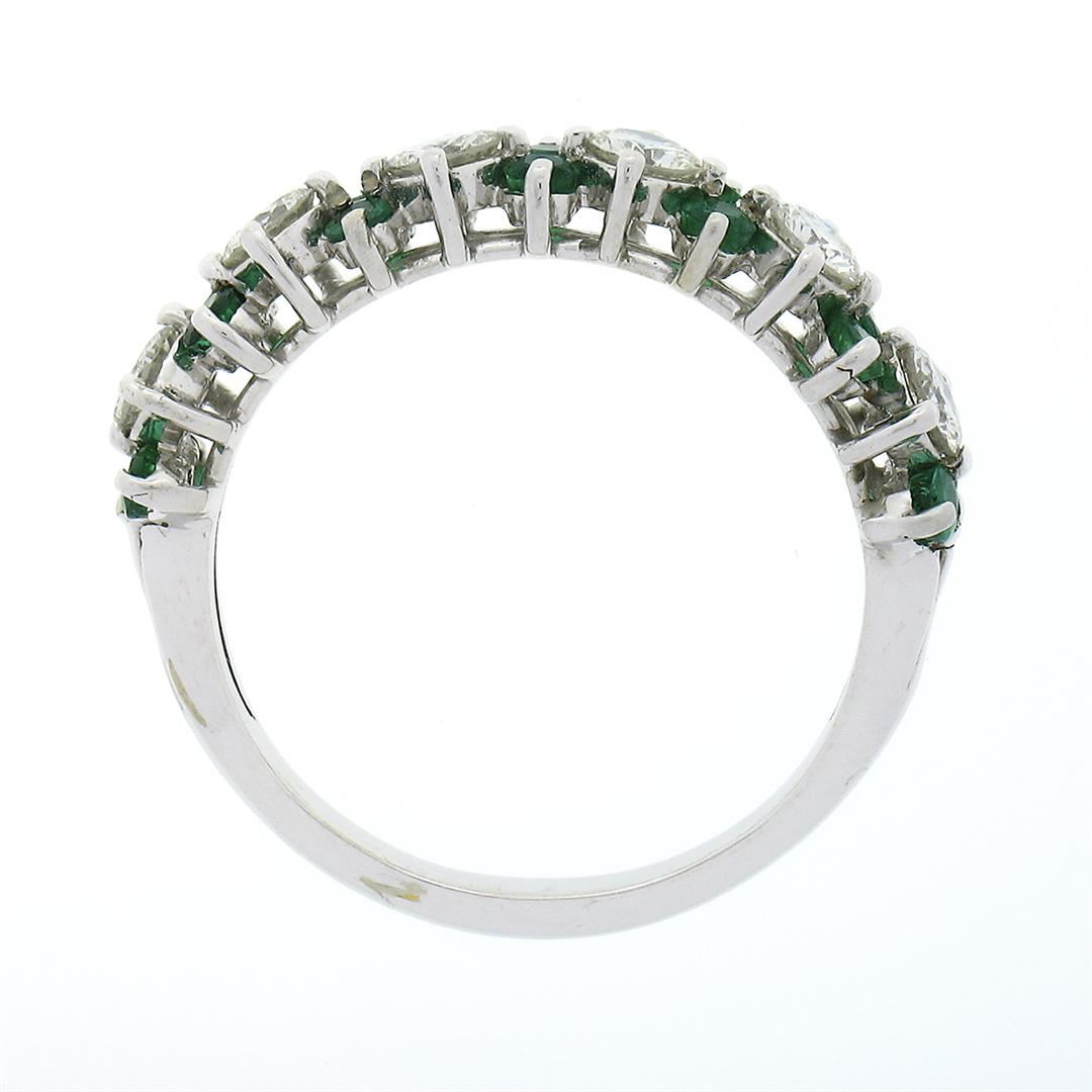 A solid 18k white gold band ring, with 14 round brilliant cut natural emeralds (0.60ctw), and 6 round brilliant cut natural diamonds (G/H - VS1/VS2 ; 1.10ctw). The ring is size 9.5, weighs a total of 3.78 grams, and measures 5.95mm wide.