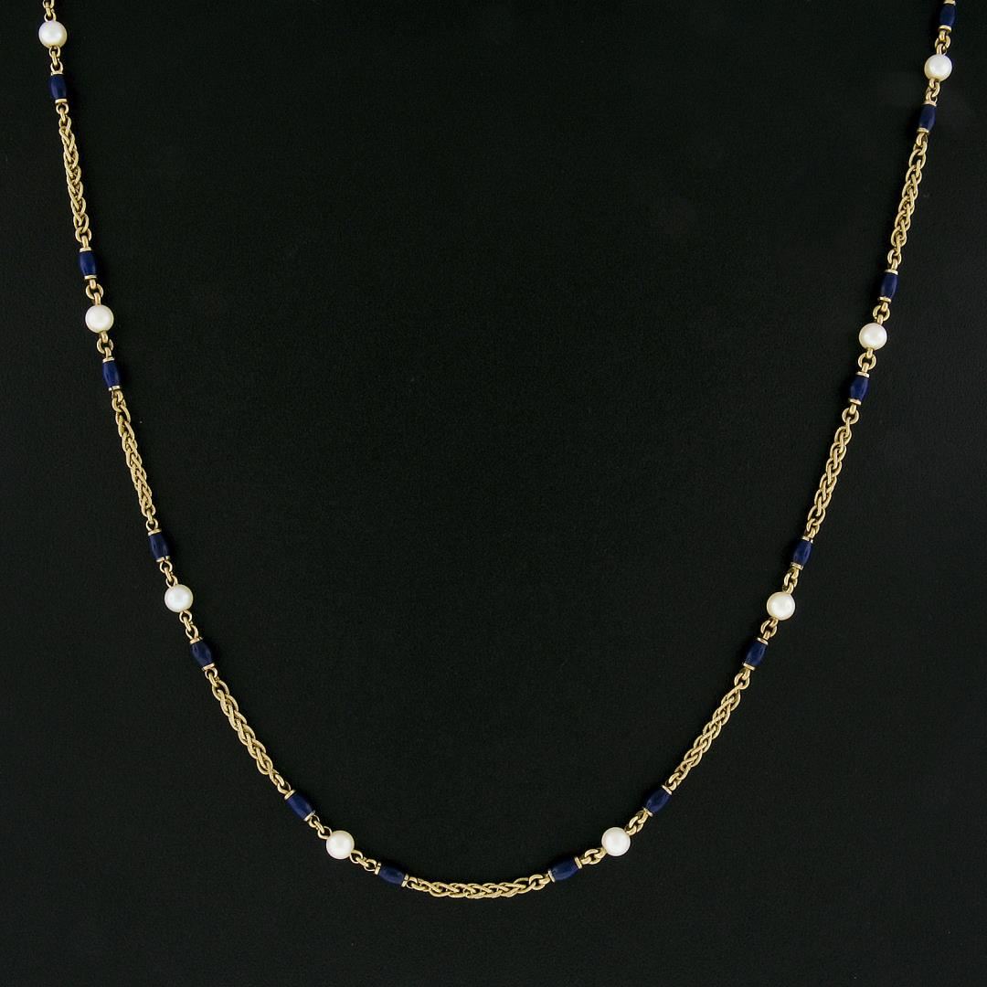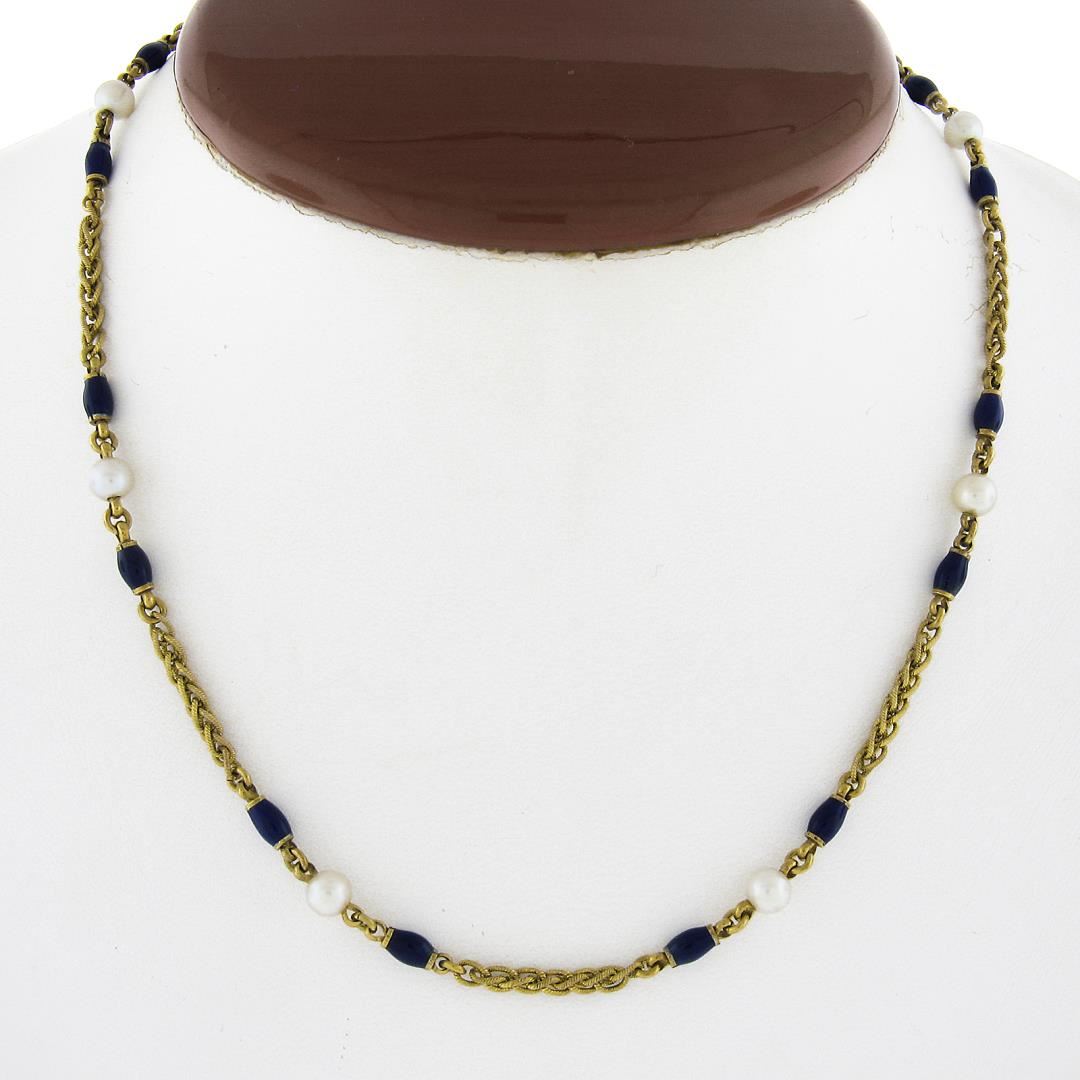 A vintage solid 18k yellow gold wheat link necklace, with blue enamel & 8 round cultured pearls (4.8mm). It weighs a total of 12.59 grams, measures 4.8mm wide, and measures 15.5 inches in length.