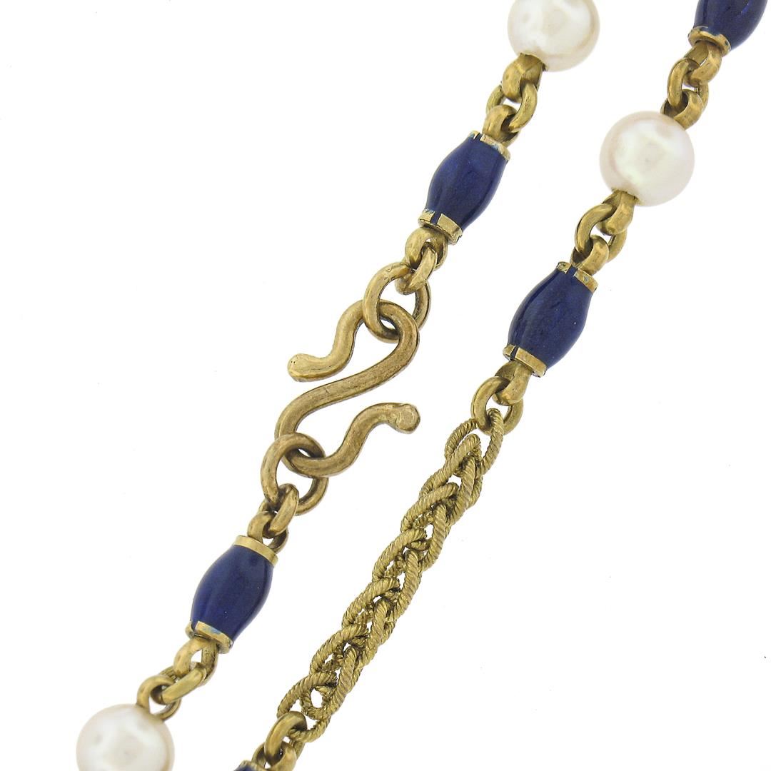 A vintage solid 18k yellow gold wheat link necklace, with blue enamel & 8 round cultured pearls (4.8mm). It weighs a total of 12.59 grams, measures 4.8mm wide, and measures 15.5 inches in length.