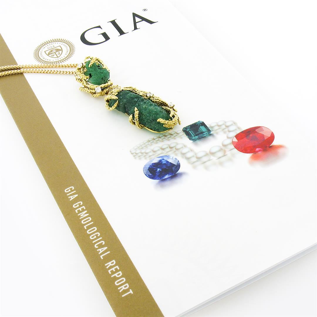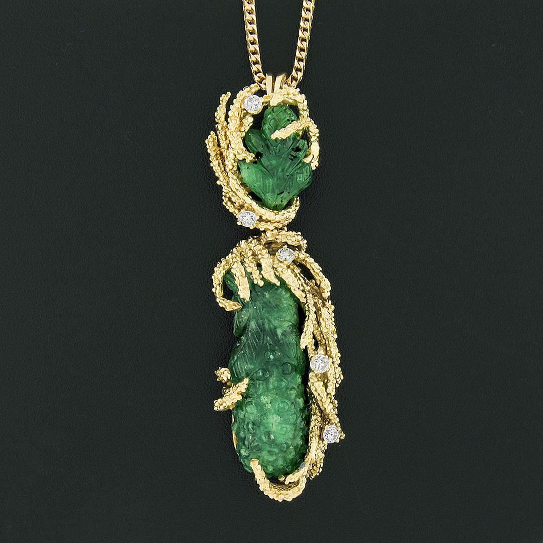 A vintage solid 18k yellow gold pendant necklace. with 1 gia certified carved natural emerald (28.85x9.95x7.85mm), 1 leaf carving natural emerald (13.6x10.0mm). with 5 round brilliant cut natural diamonds (F/G - VS1 ; 0.25ctw). 18 inch franco link chain, 21.56 grams total weight, pendant measures 57.60x15.2mm. Comes with all original relevant certifications.