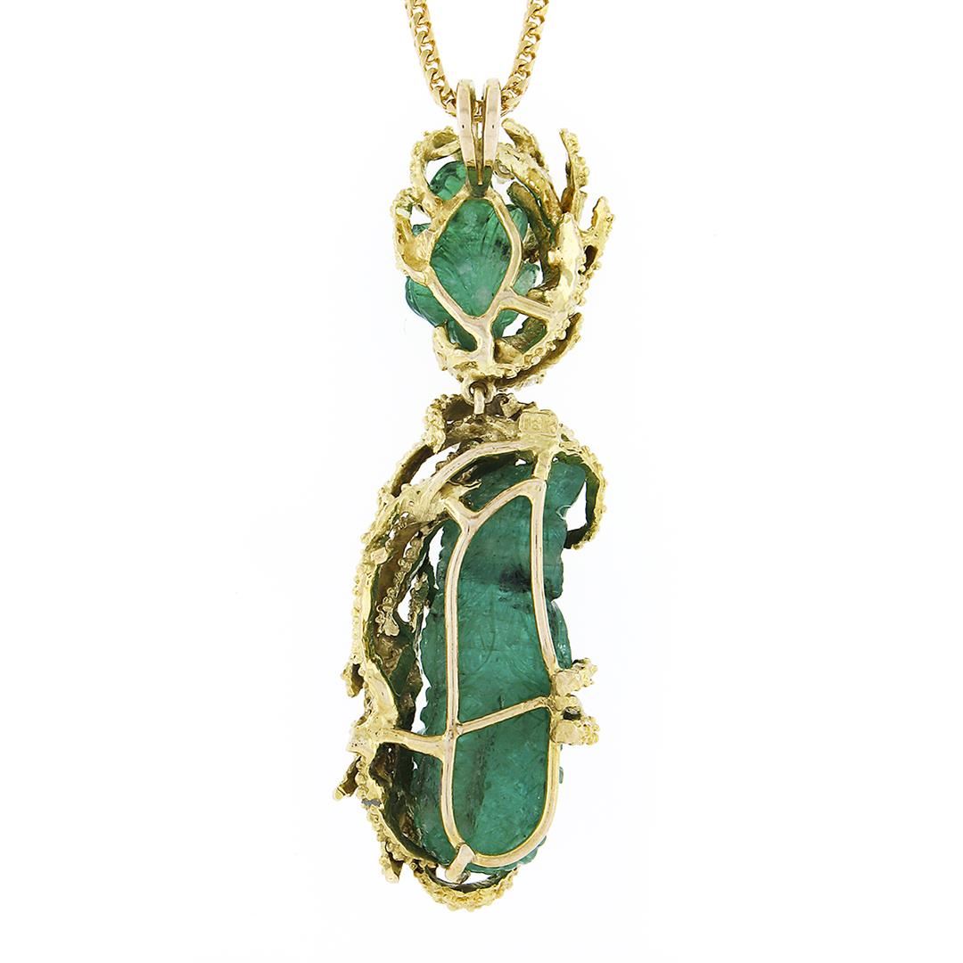A vintage solid 18k yellow gold pendant necklace. with 1 gia certified carved natural emerald (28.85x9.95x7.85mm), 1 leaf carving natural emerald (13.6x10.0mm). with 5 round brilliant cut natural diamonds (F/G - VS1 ; 0.25ctw). 18 inch franco link chain, 21.56 grams total weight, pendant measures 57.60x15.2mm. Comes with all original relevant certifications.