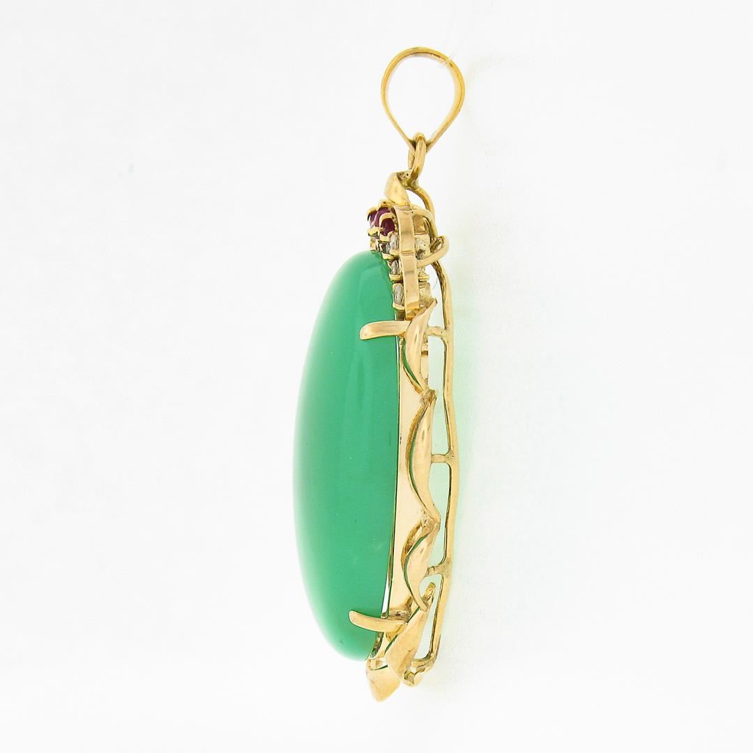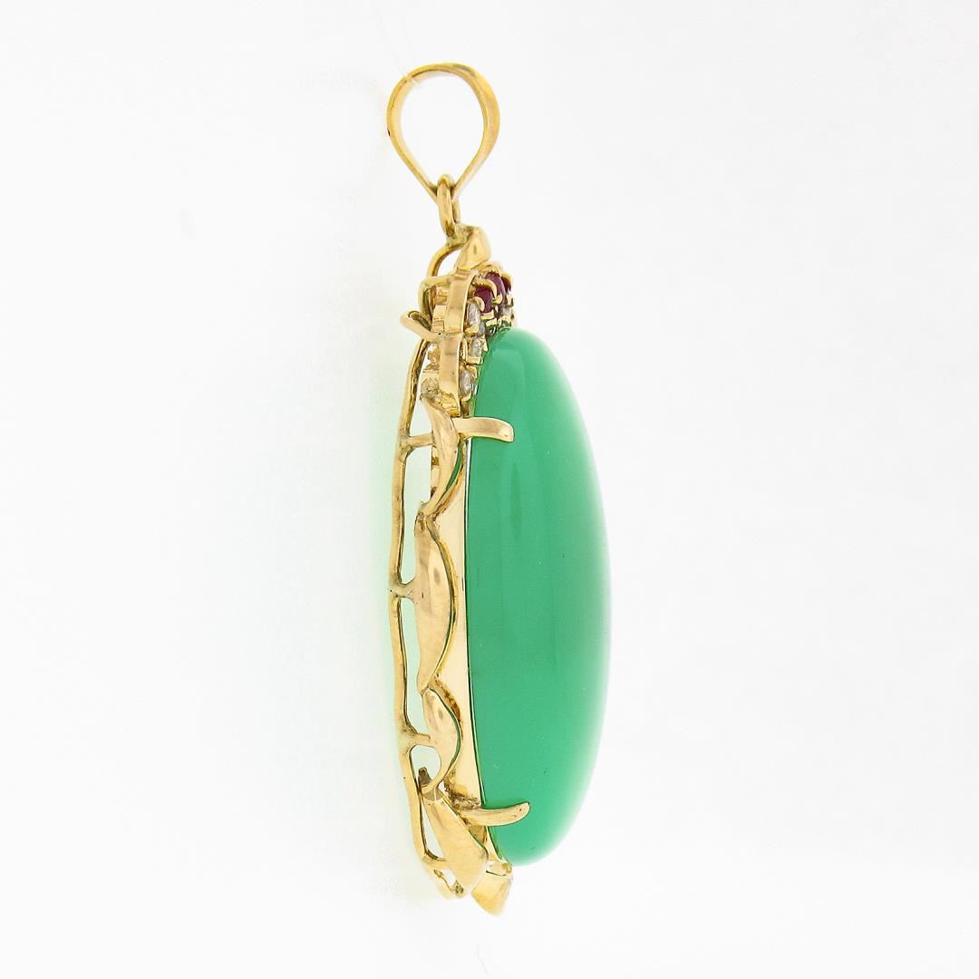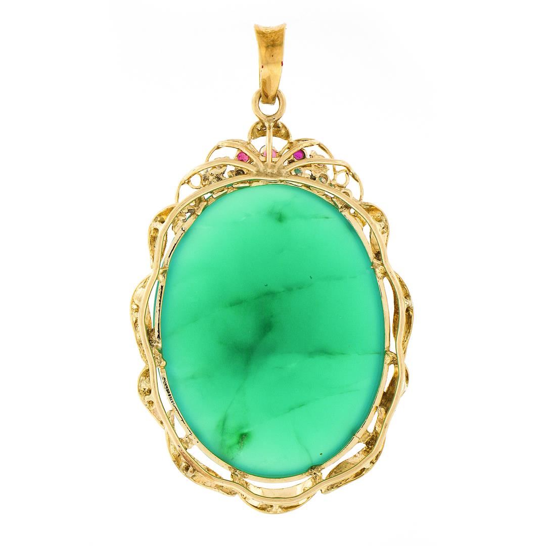 A vintage solid 18k yellow gold pendant, with 1 GIA graded oval cabochon cut natural chrysoprase (28.28x21.86x5.40mm), and 9 round brilliant cut natural diamonds (F/G - SI1/SI2 ; 0.12ctw). with 3 round brilliant cut natural rubies (0.05ctw). The pendant weighs a total of 8.05 grams, measures 44.7x26.1mm including the bail. Comes with all original relevant certifications.