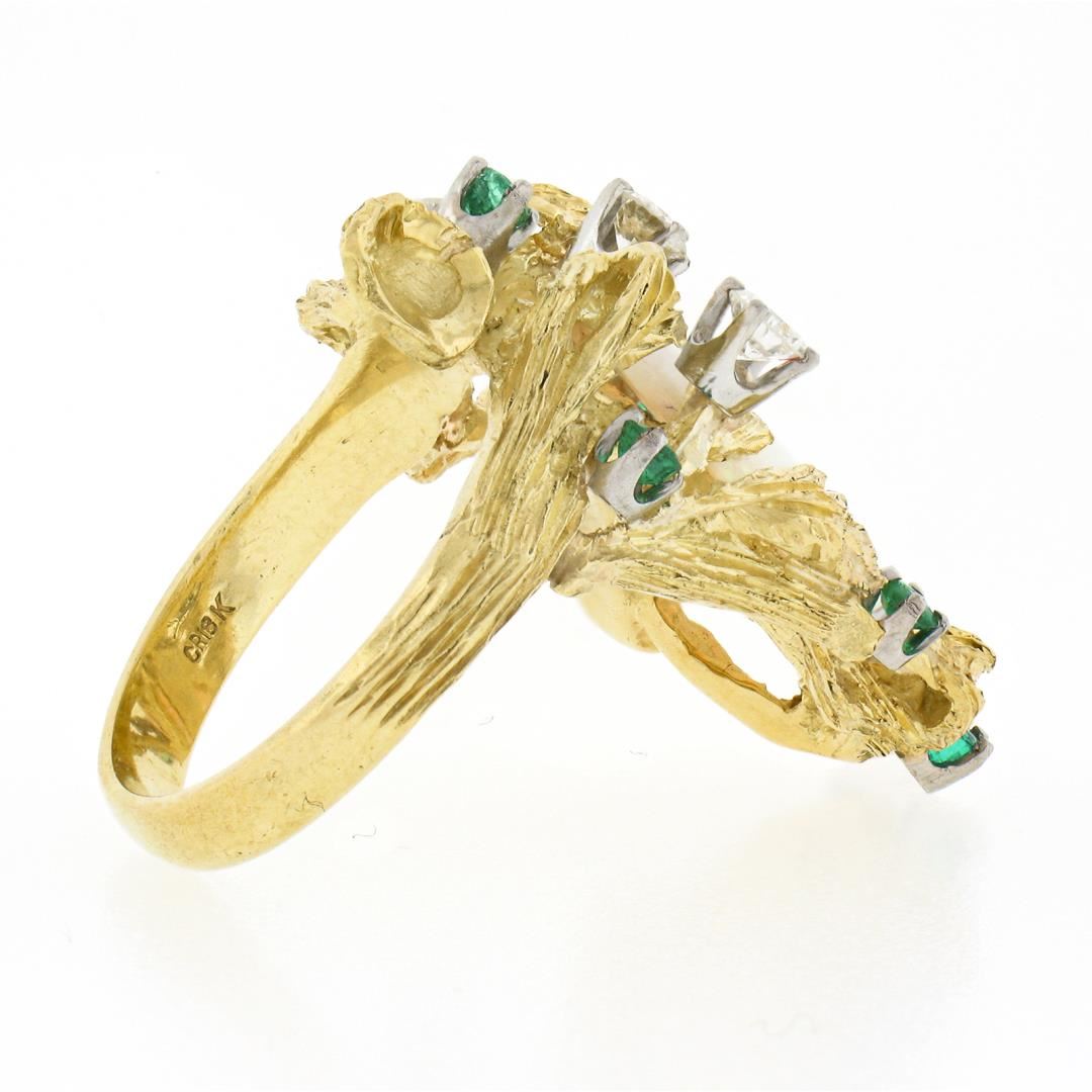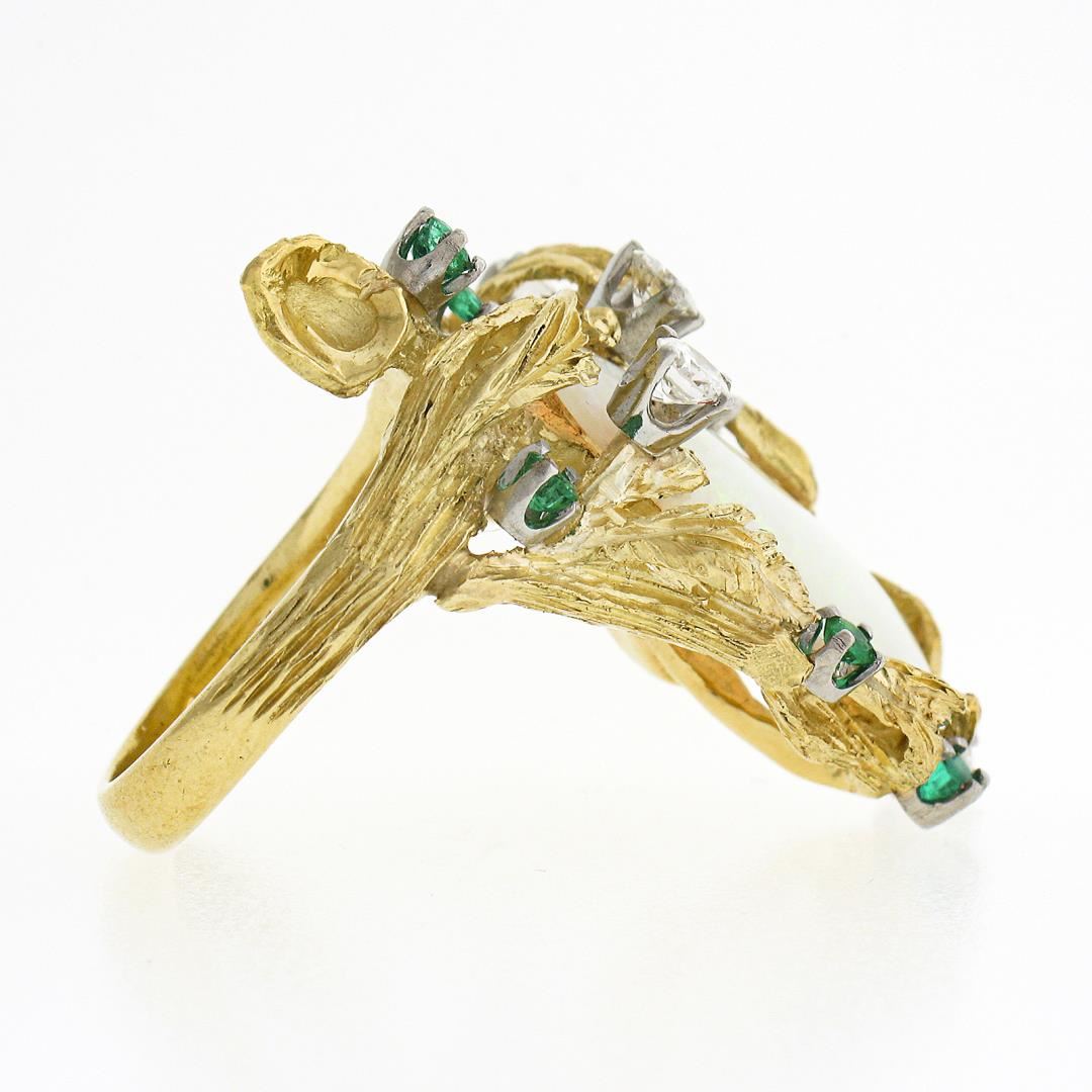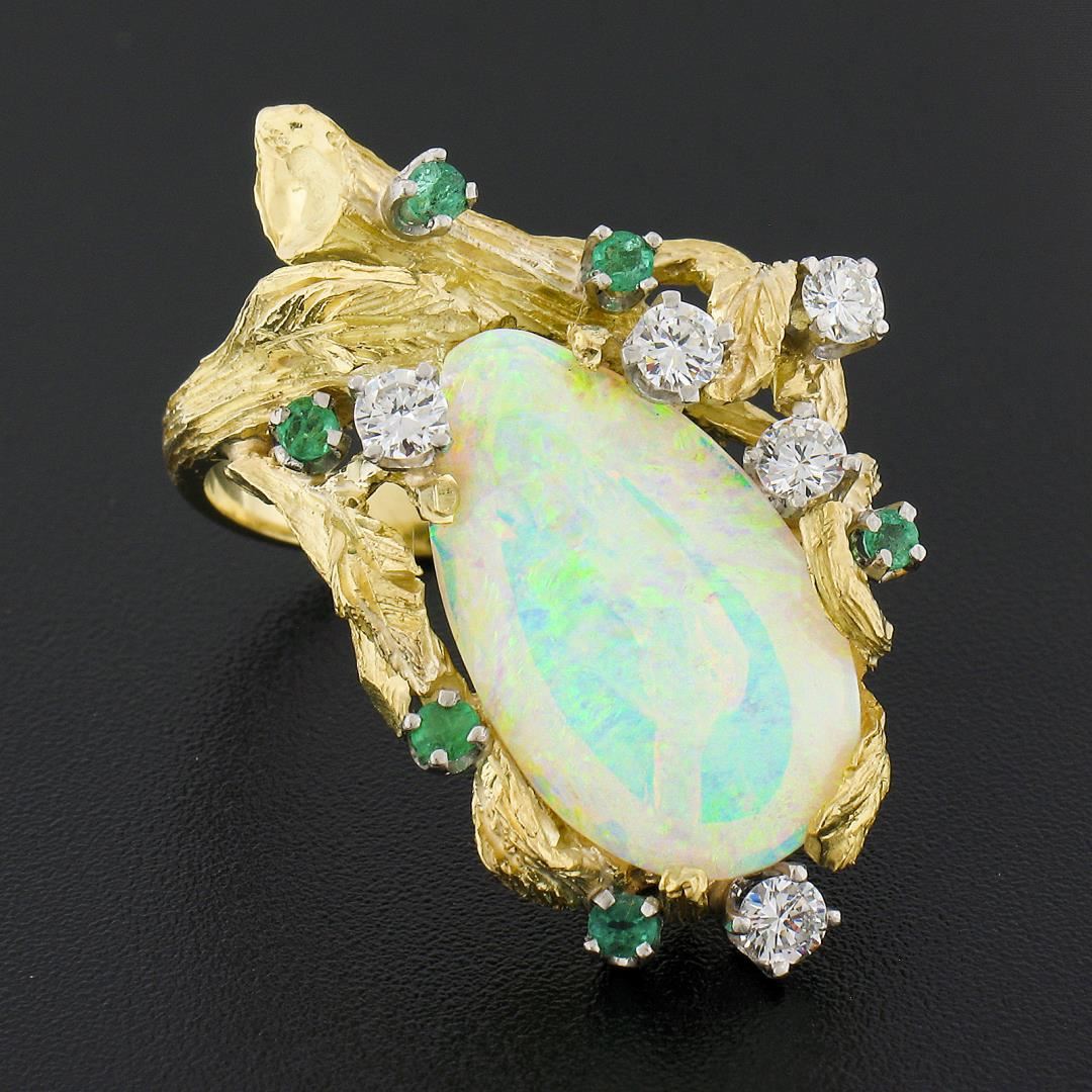 A vintage 18k yellow gold cocktail ring, with 1 GIA graded pear cabochon cut natural opal ( 20.03x11.4mm ), and 5 round brilliant cut natural diamonds (E/F - VS1 ; 0.60ctw), with 5 round brilliant cut natural emeralds (0.22ctw). The ring is size 6.0, weighs a total of 12.76 grams, and measures 34.30mm wide.Comes with all original relevant certifications.