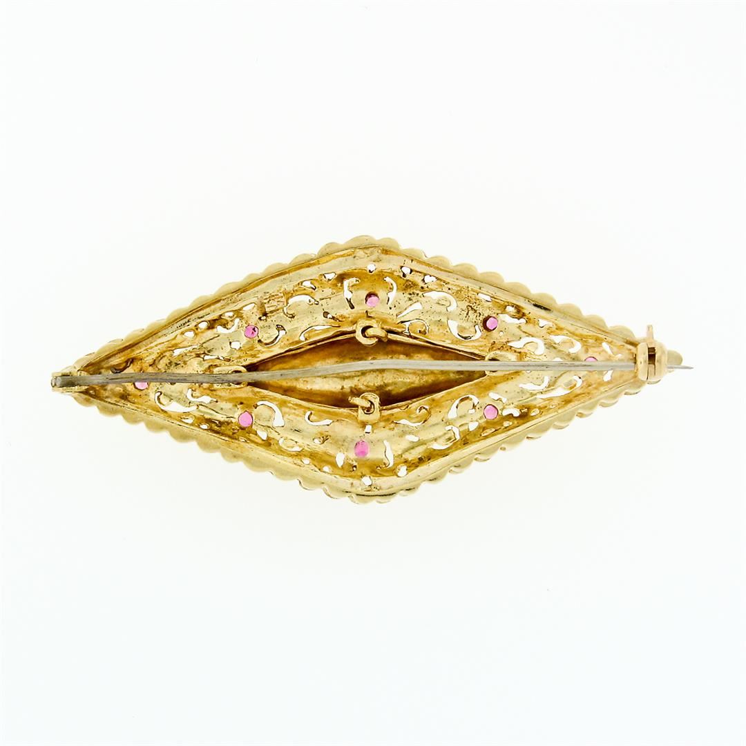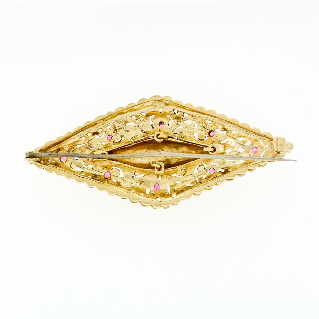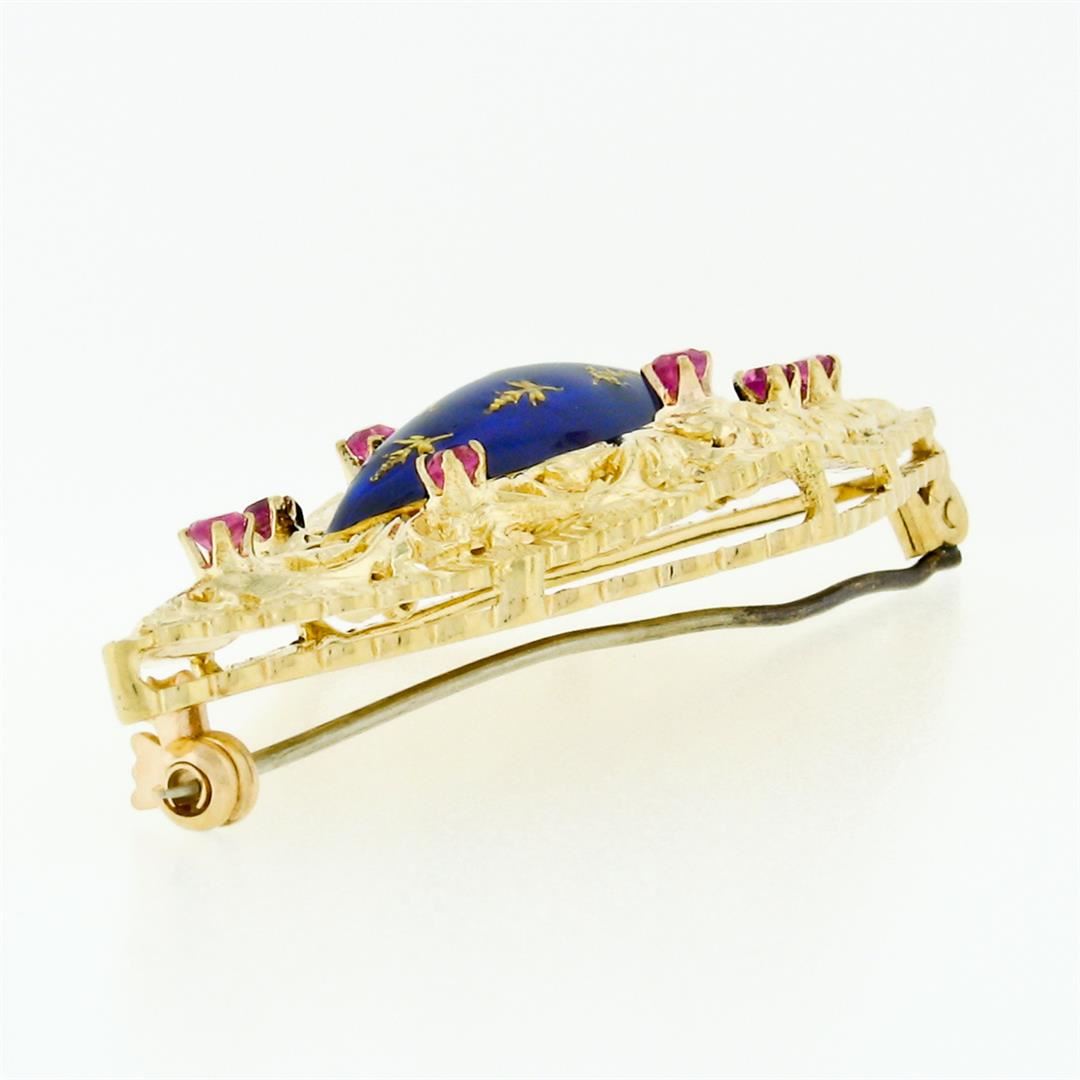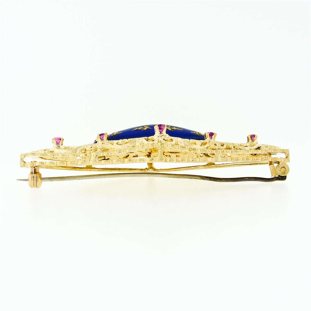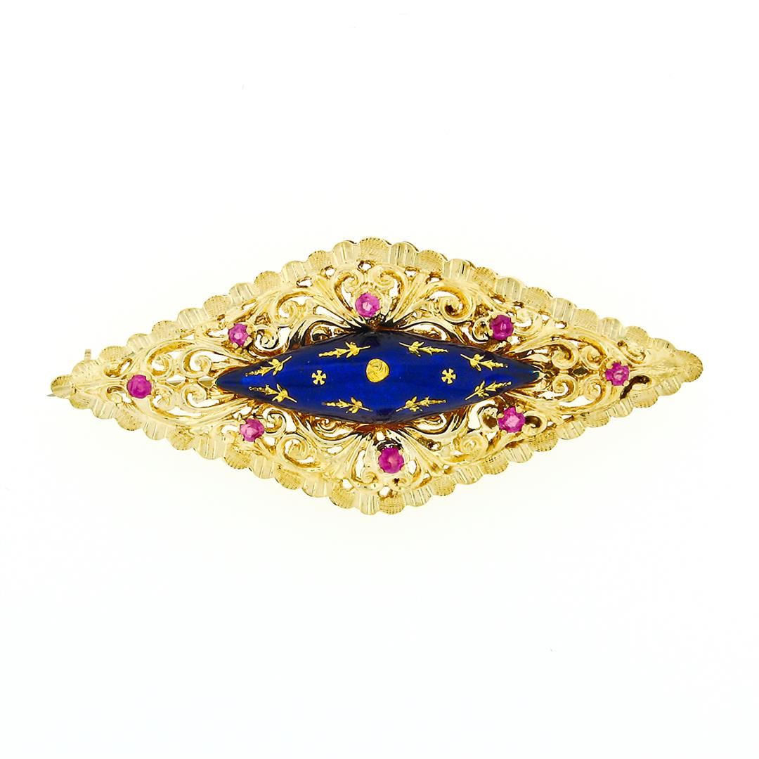 A vintage 18k yellow gold filigree brooch with a blue enamel center surrounded by 8 round cut natural rubies (0.29ctw). Measures 24.32x56.37mm and weighs a total of 13.95 grams.