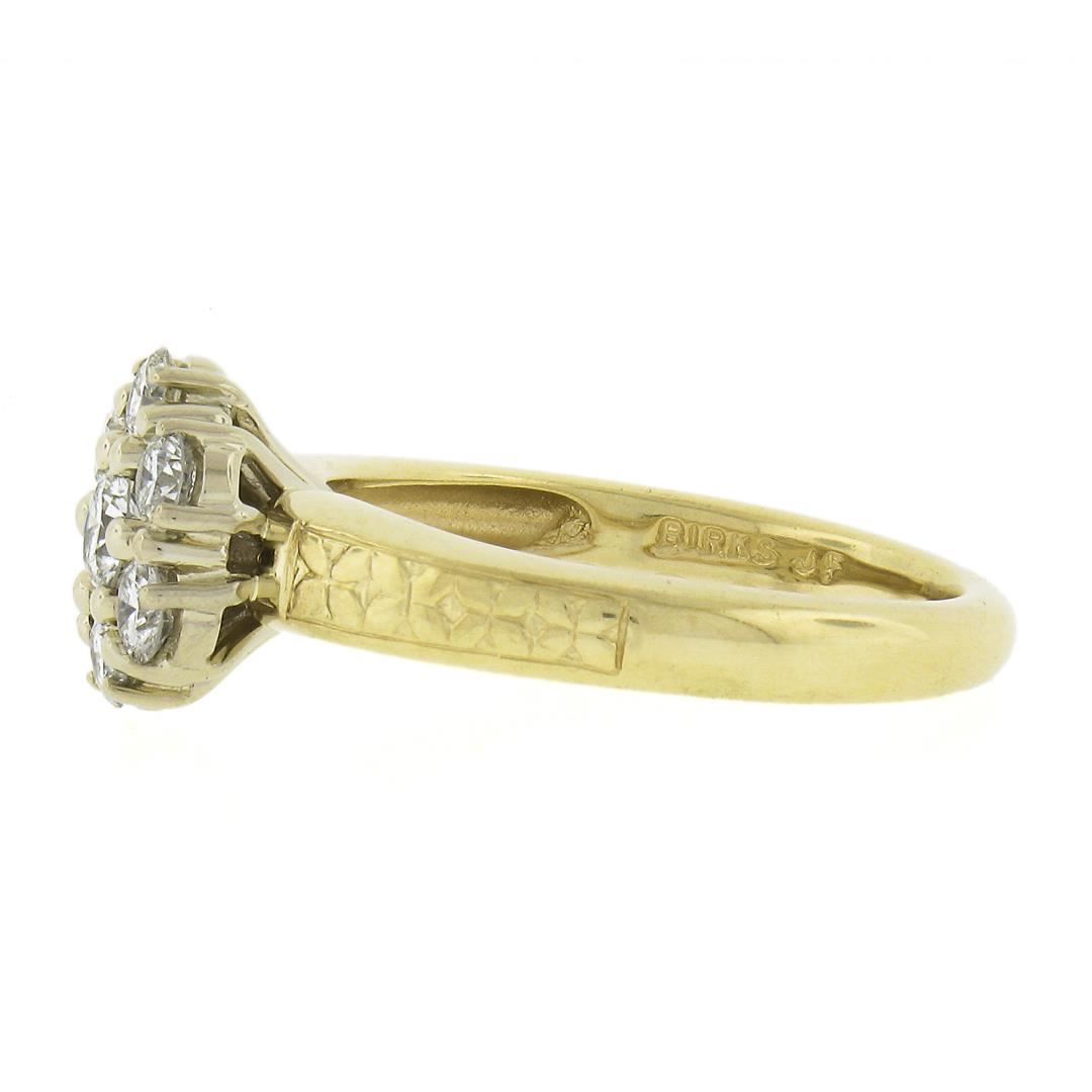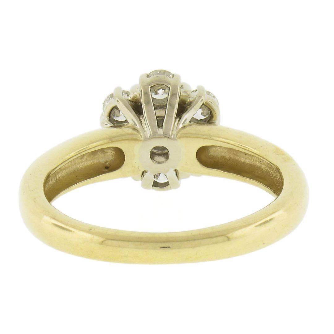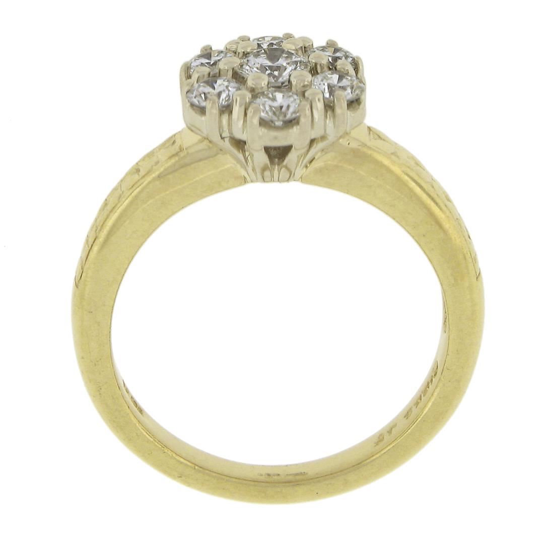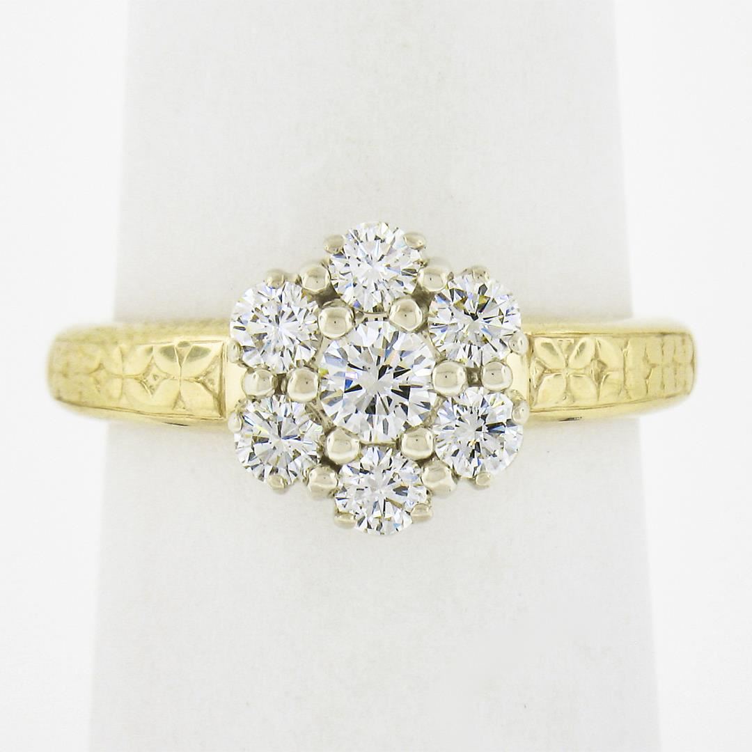 A vintage solid 18k yellow & white gold flower cluster ring, with 7 round cut natural diamonds (G/H - VS1/VS2 ; 0.80ctw). The ring is size 6.75, weighs a total of 5.83 grams, and measures 9.6mm wide.