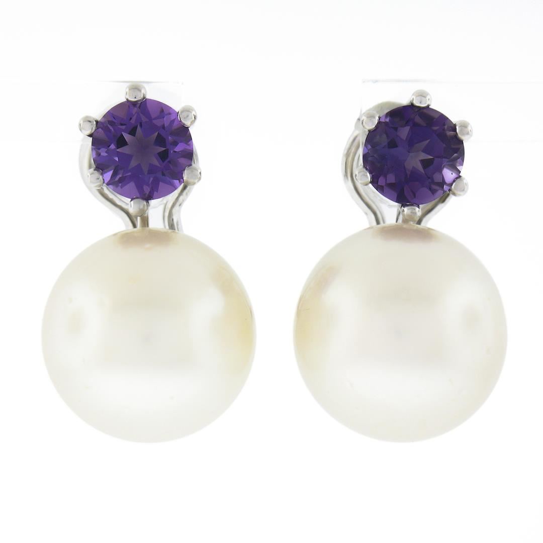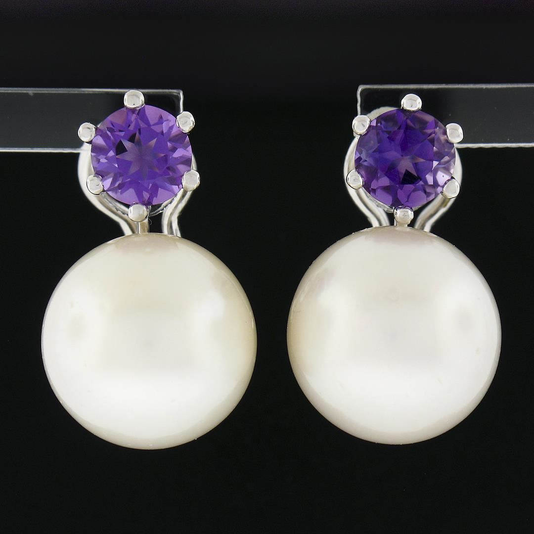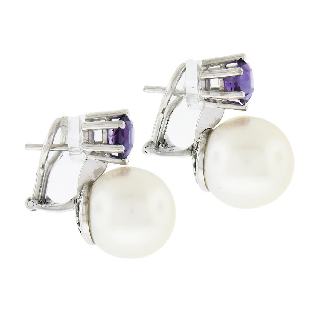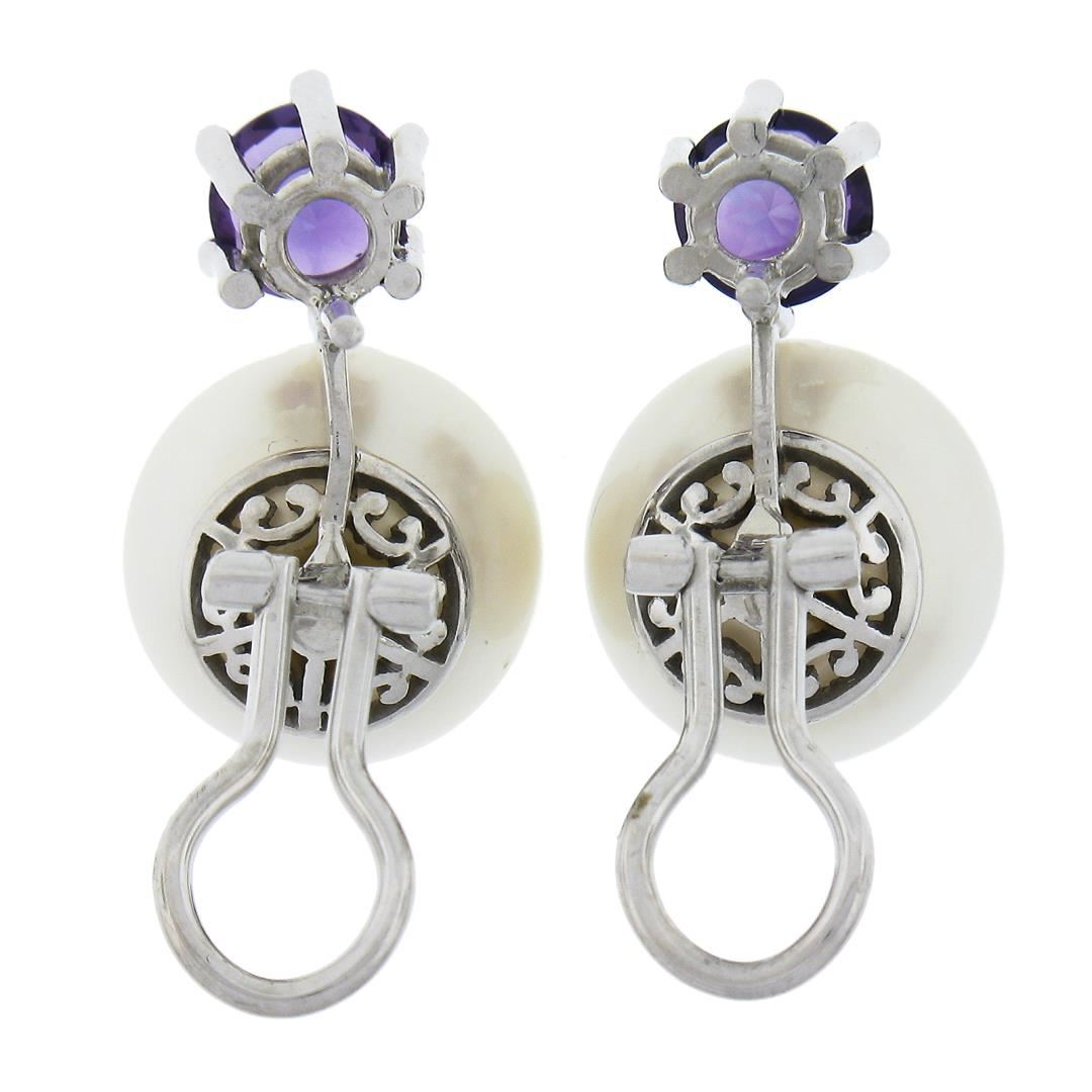 A vintage solid 18k white gold earrings, with 2 round shape cultured pearls (14mm), and 2 round cut natrual amethysts (1.87ctw). The earrings measure approximately 23.4x14mm and weigh a total of 14.62 grams.