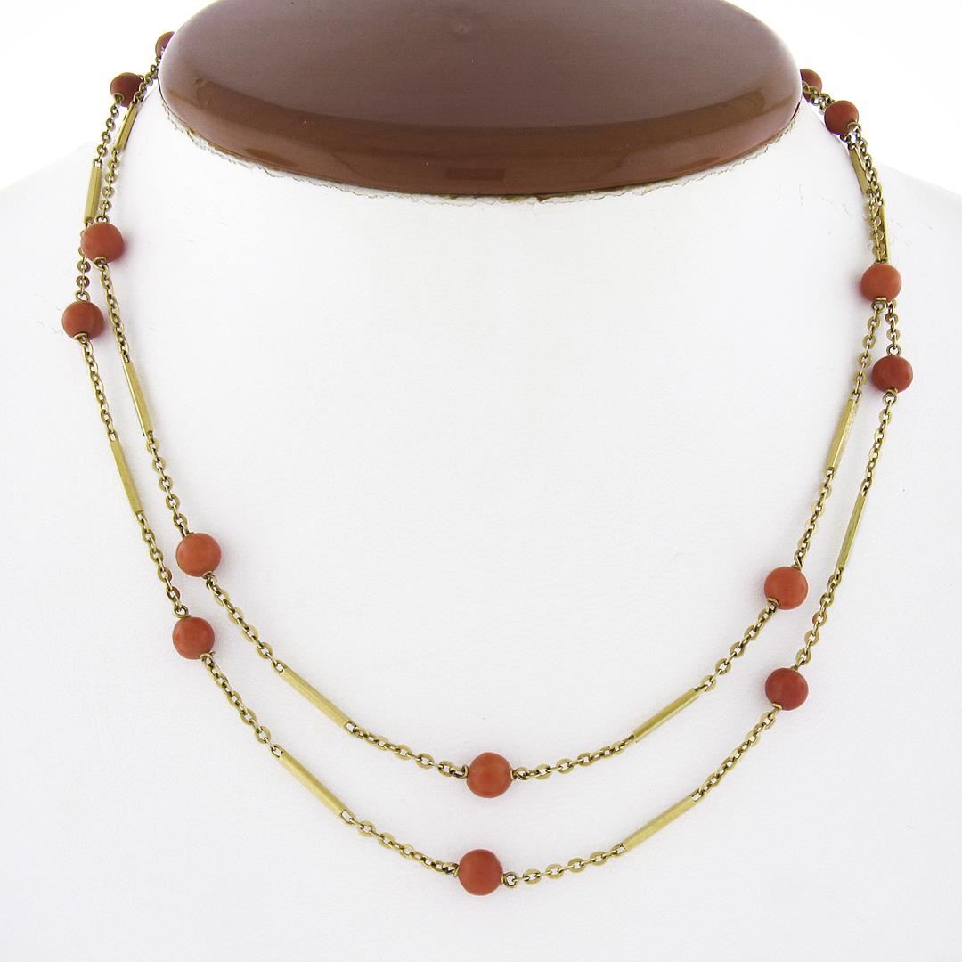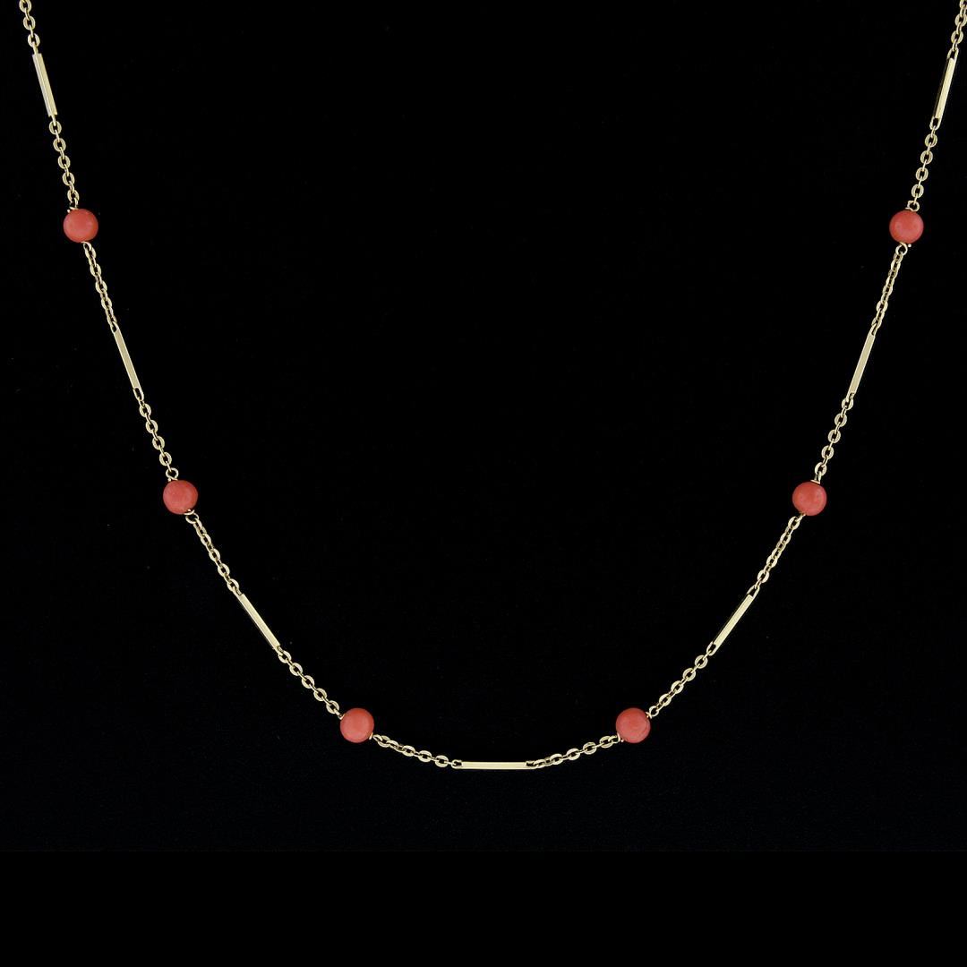 A vintage solid 18k yellow gold station link necklace, featuring 18 bead shape natural corals (5.1mm each). It weighs a total of 10.33 grams, measures 5.1mm wide, and measures 30 inches in length.