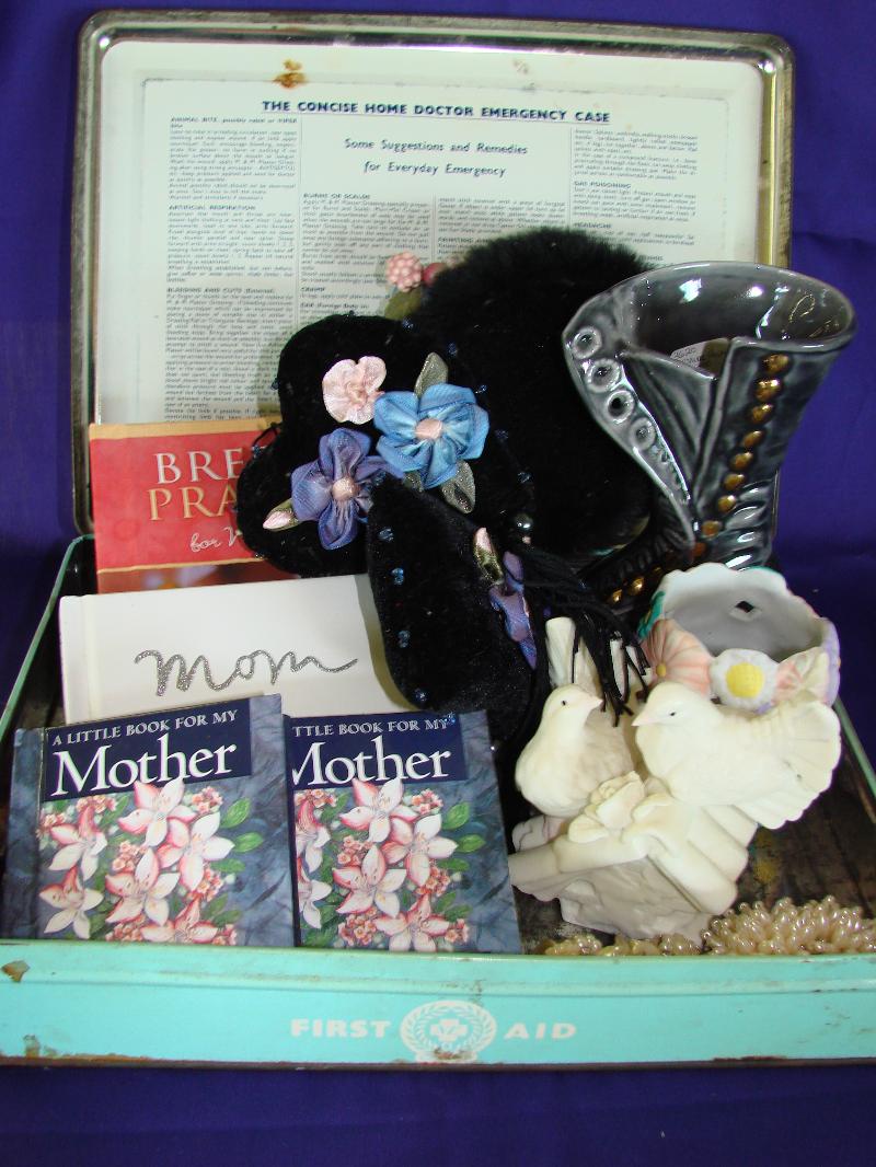 Vintage First Aid Box w/contents:mini books, figurines, earings, misc.
