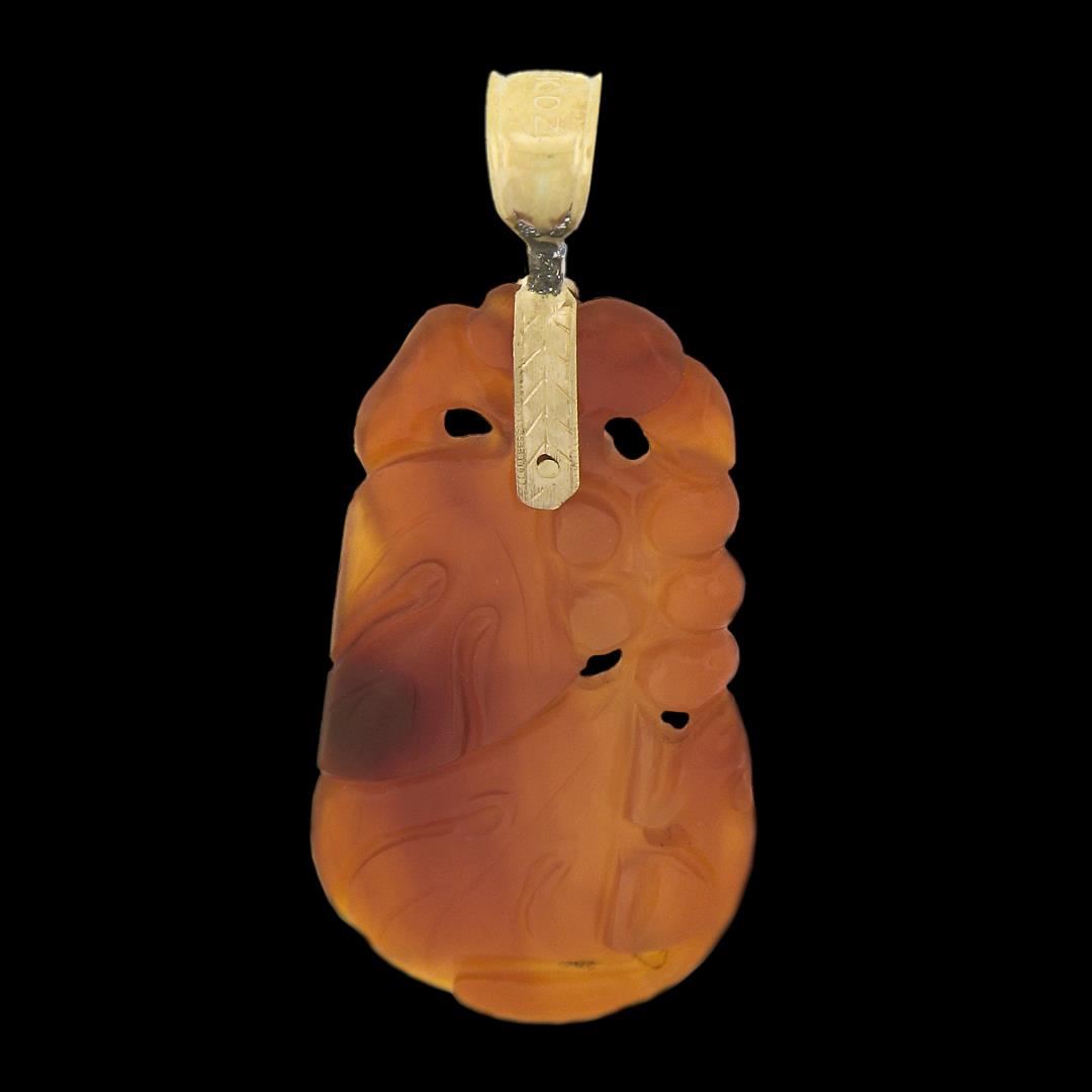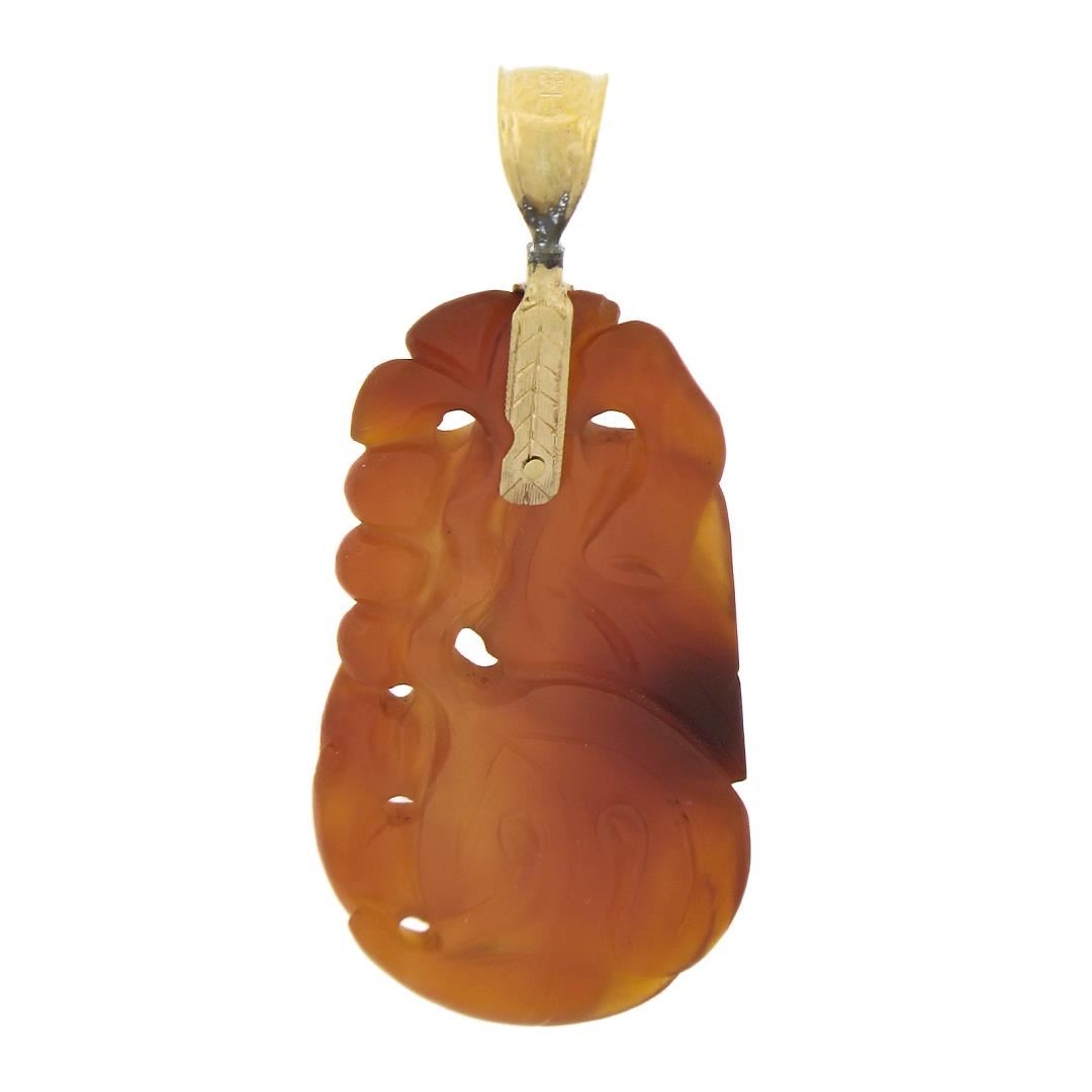 A vintage solid 14k yellow gold pendant, featuring a carved jade ( 33.4x18.1mm). The pendant weighs a total of 3.73 grams, measures 42.7x18.1mm including the bail.