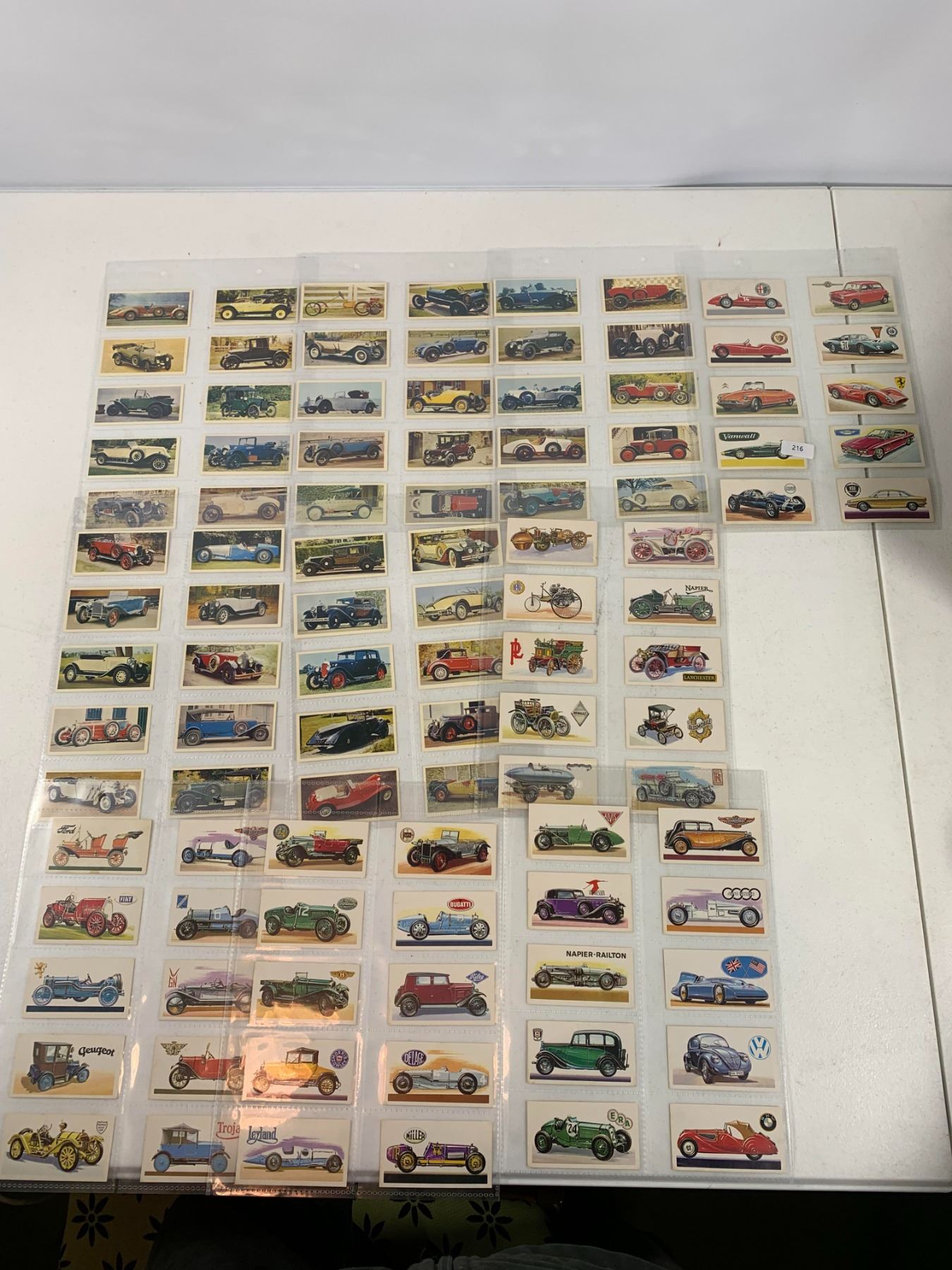 Extensive multi‑page collection of vintage automobile cigarette cards featuring early racing cars, luxury marques and classic motoring history. Clean artwork; stored in sleeves. Appears complete or mostly complete based on included cards.