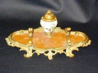 Vintage Brass & Mahogany Inlaid Ink Well/Stand - well has been broken & repaired