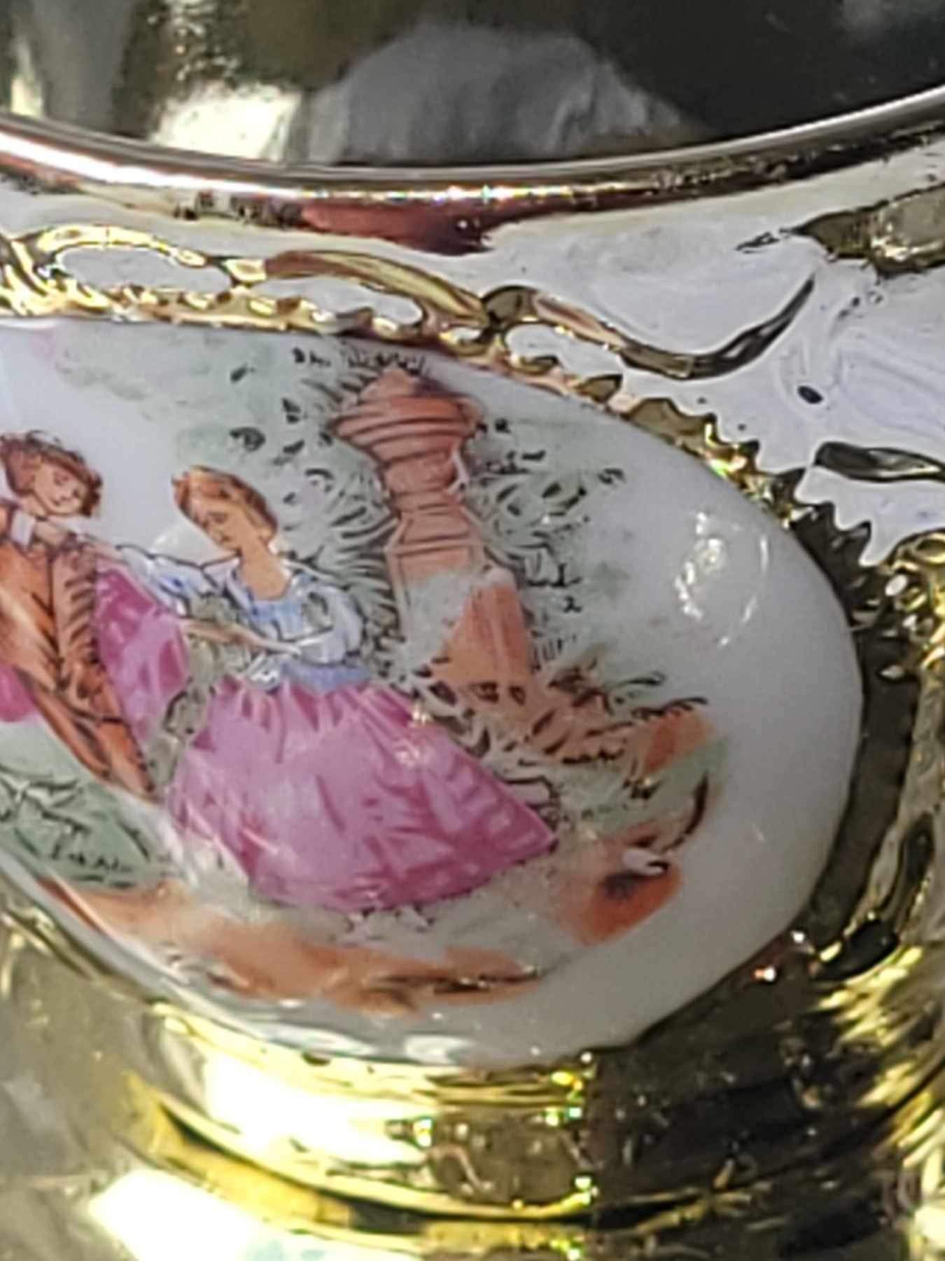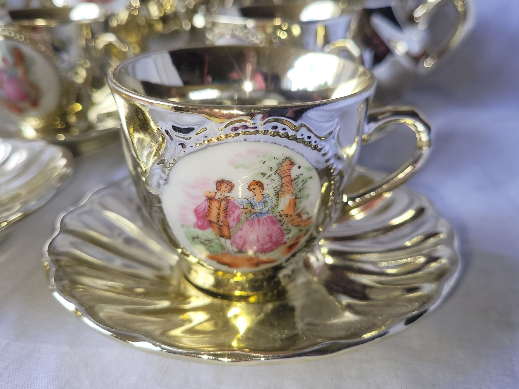 Gold with hand painted motif coffee set. Teapot 8 ", cream, sugar and 6 cup and saucers. Made in Japan. Pickup at 9 am