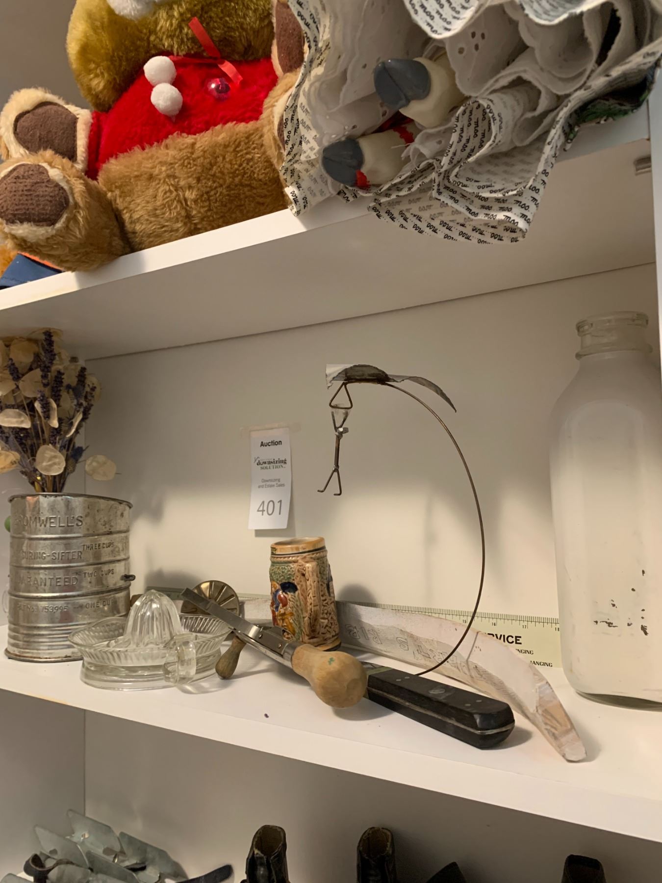 Mostly vintage decor includes Bromwell sifter, milk bottle, hand mixer, vase with flowers, and more. Pickup at 10 am