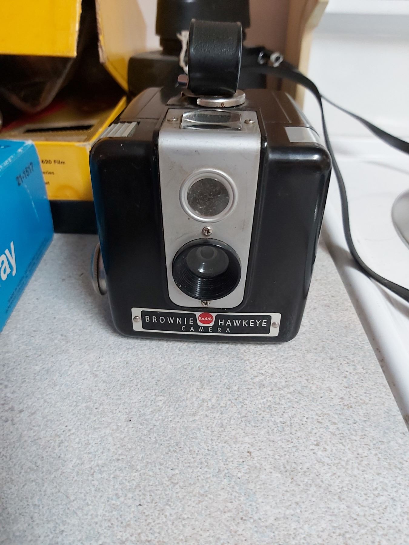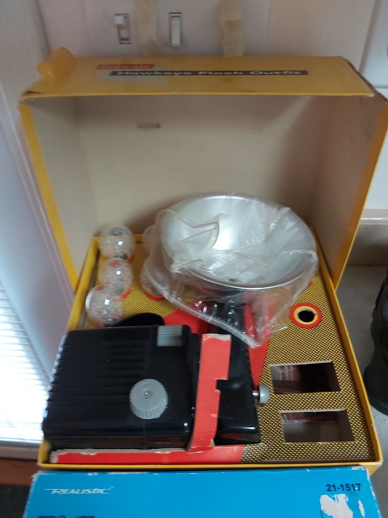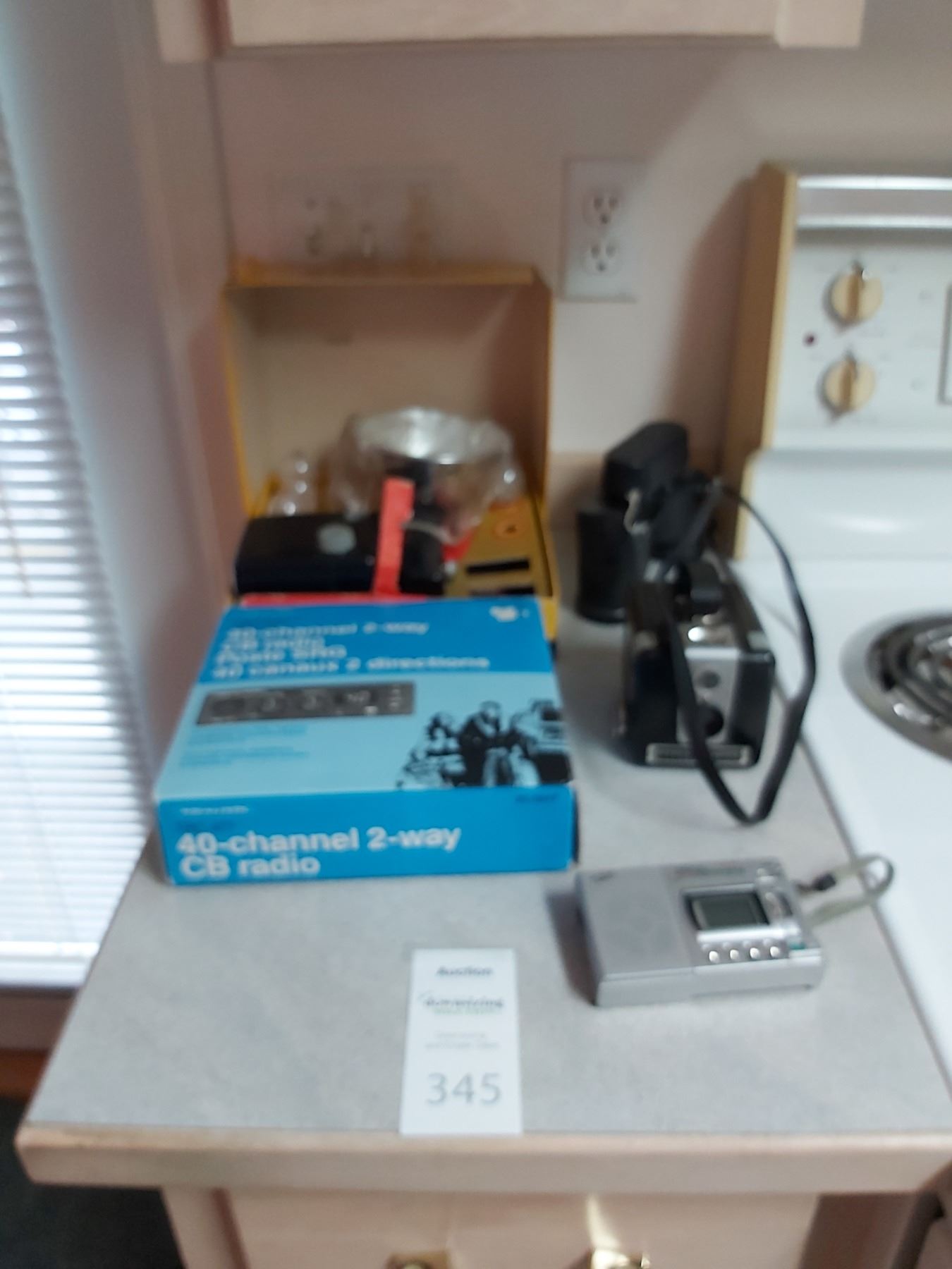 Vintage CB radio, Brownie camera, digital receiver, Hawkeye flash, and Sears binoculars included. Pickup 9 am cat. A.