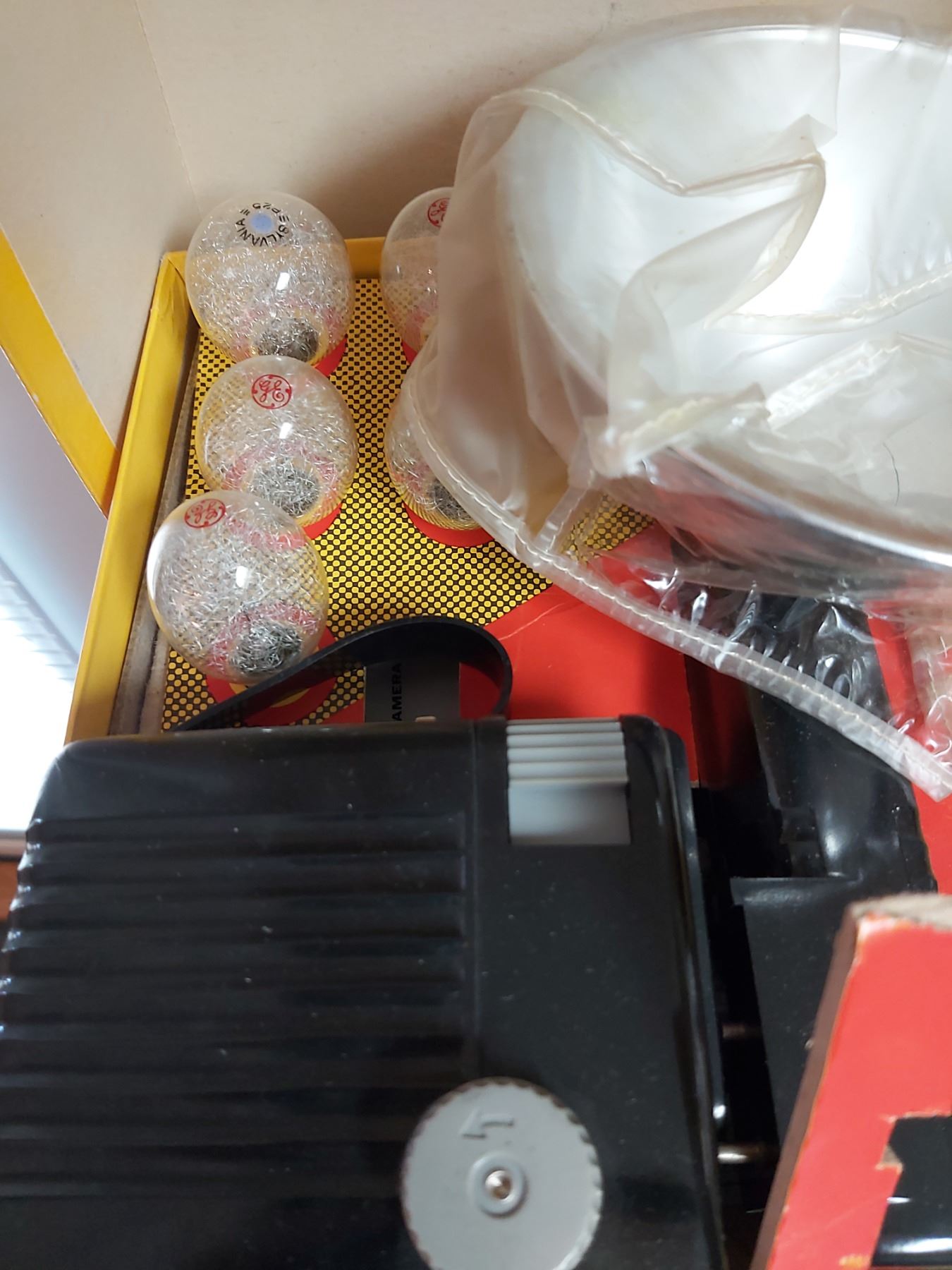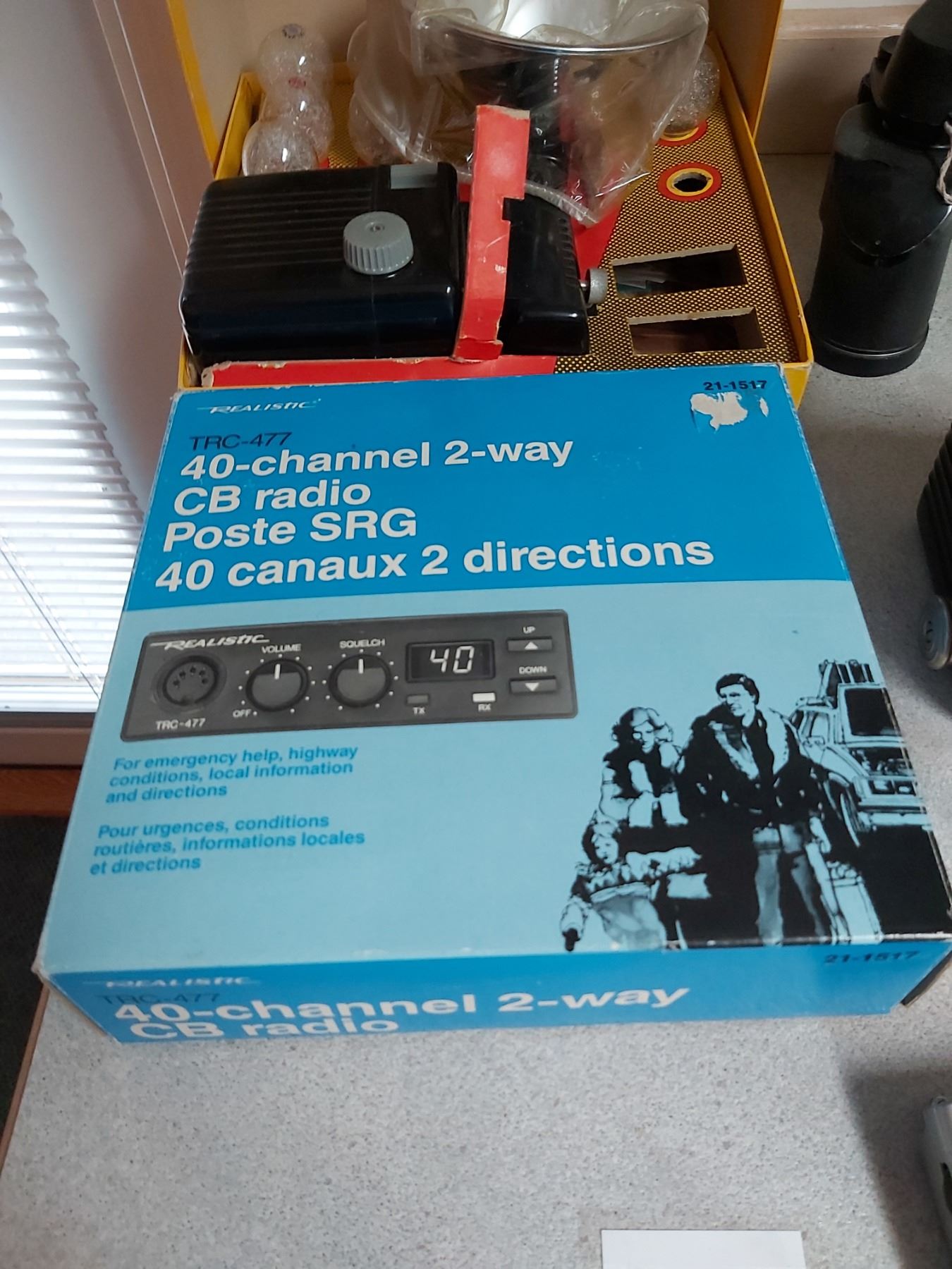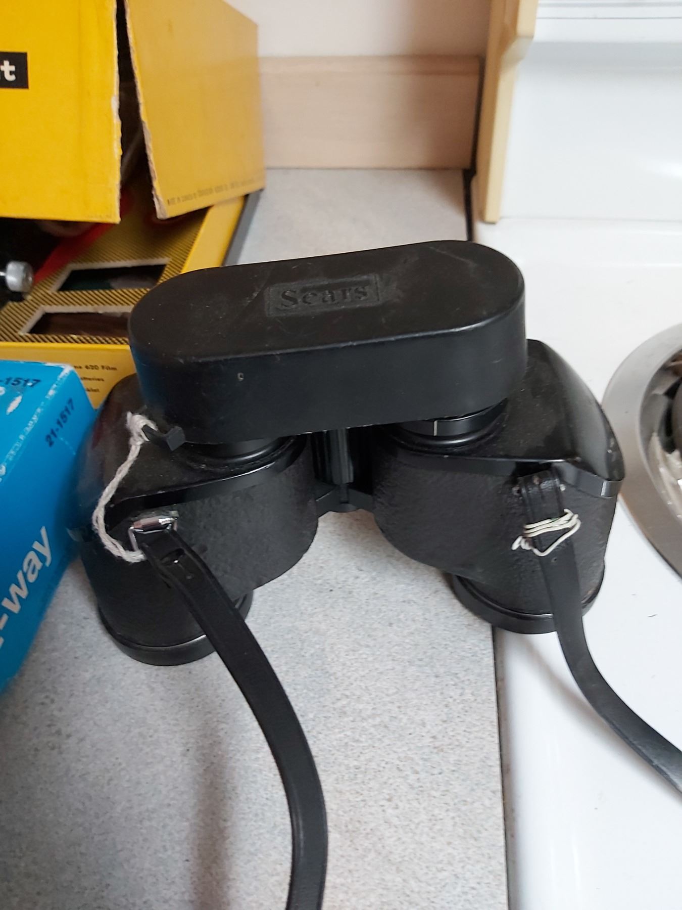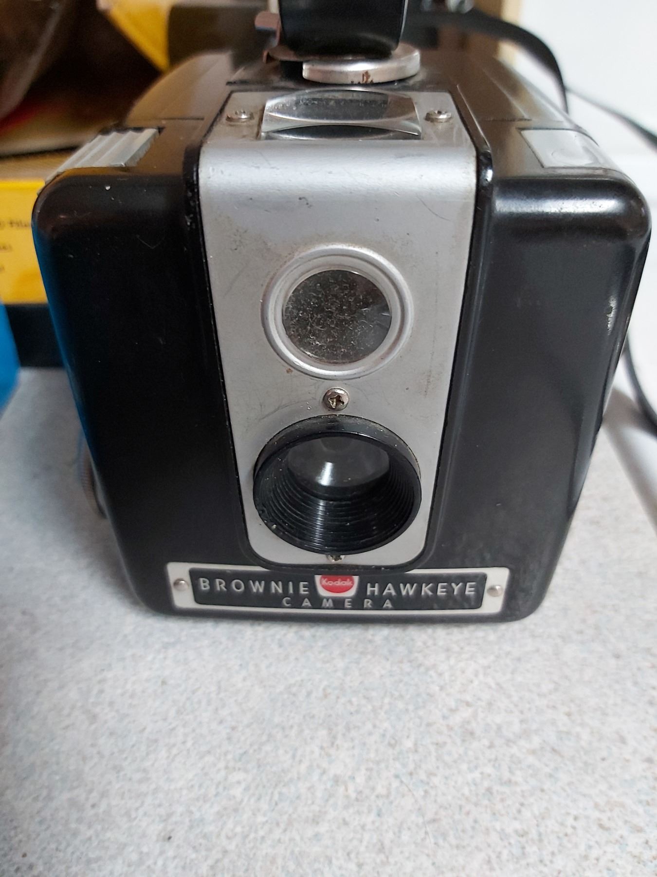 Vintage CB radio, Brownie camera, digital receiver, Hawkeye flash, and Sears binoculars included. Pickup 9 am cat. A.