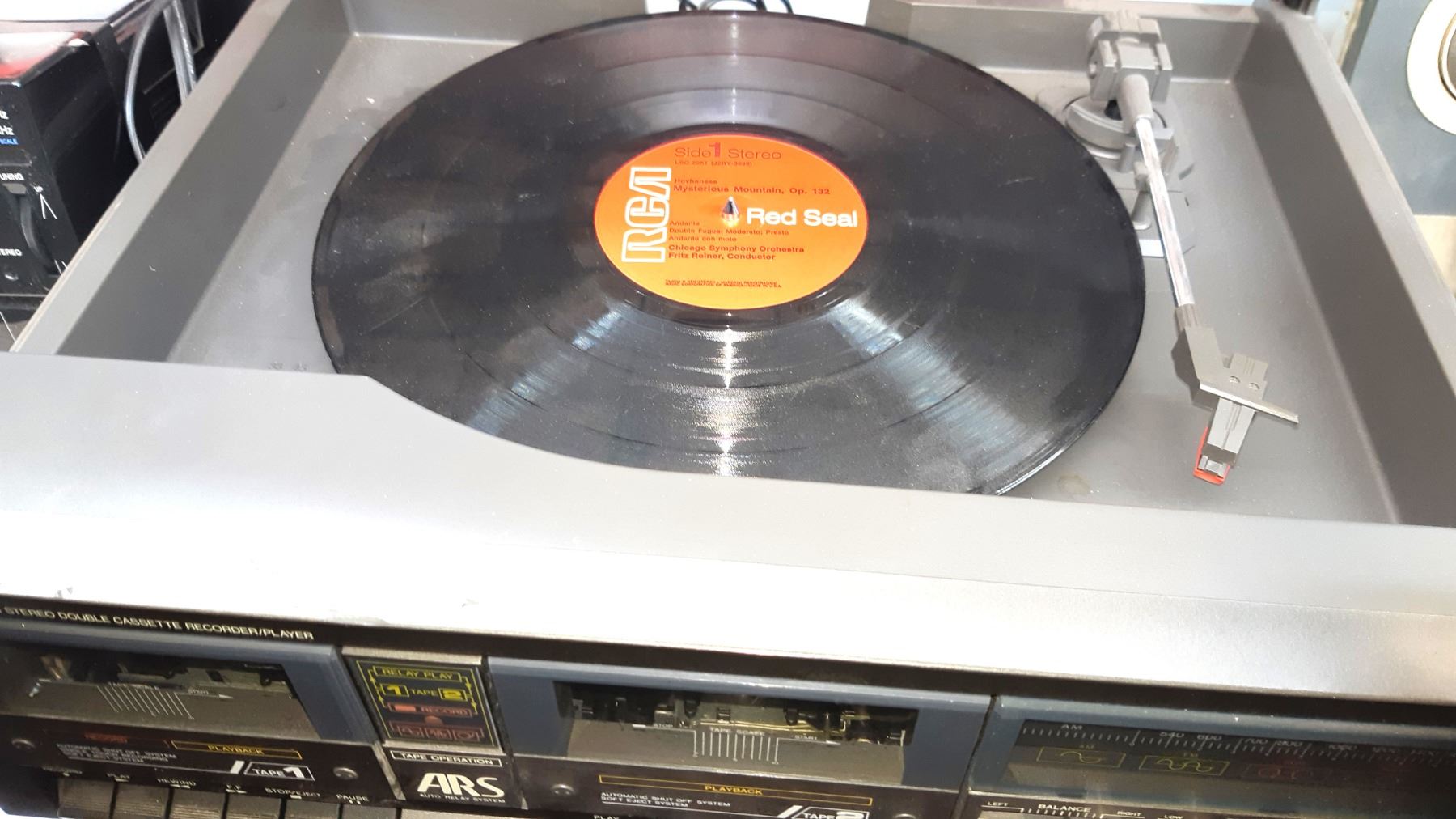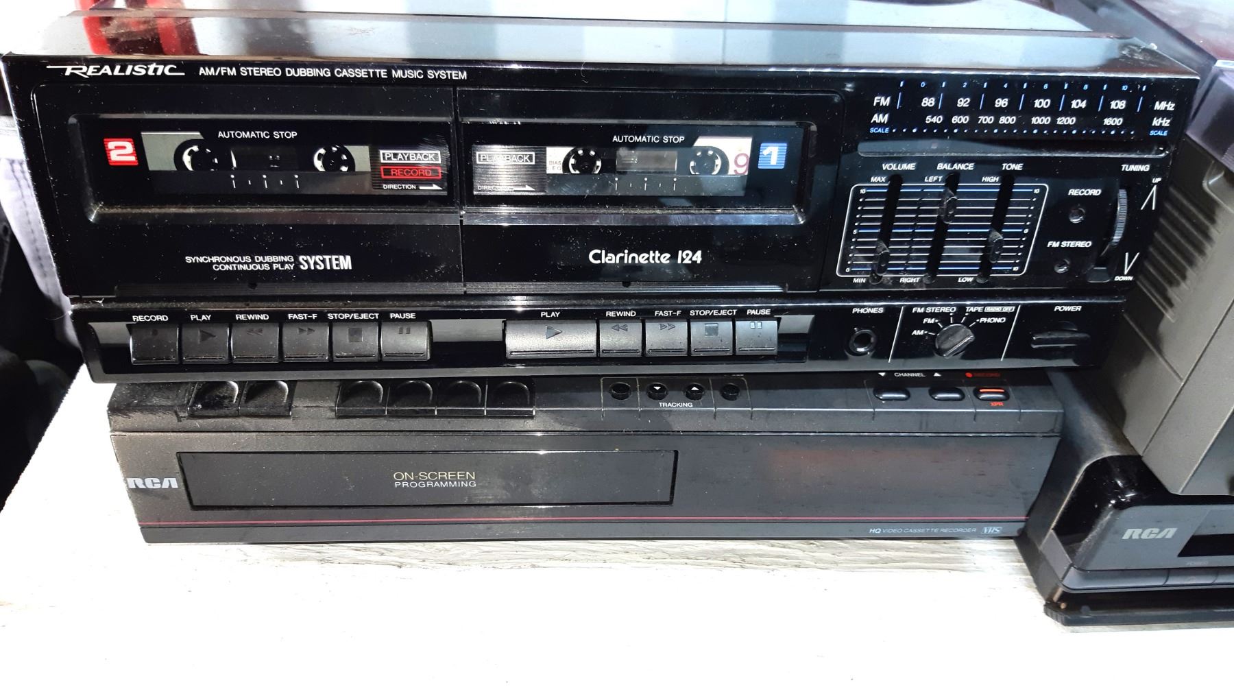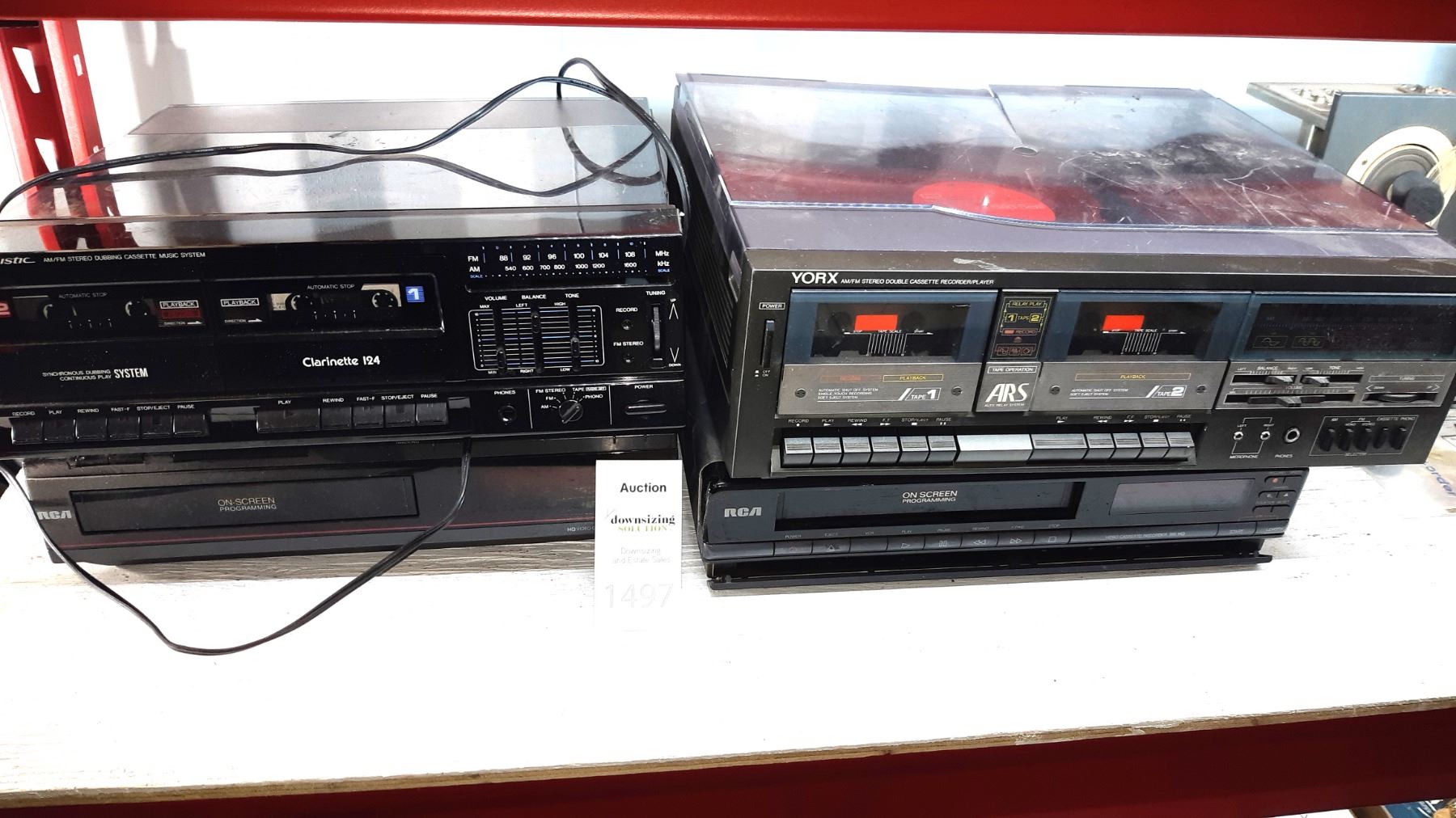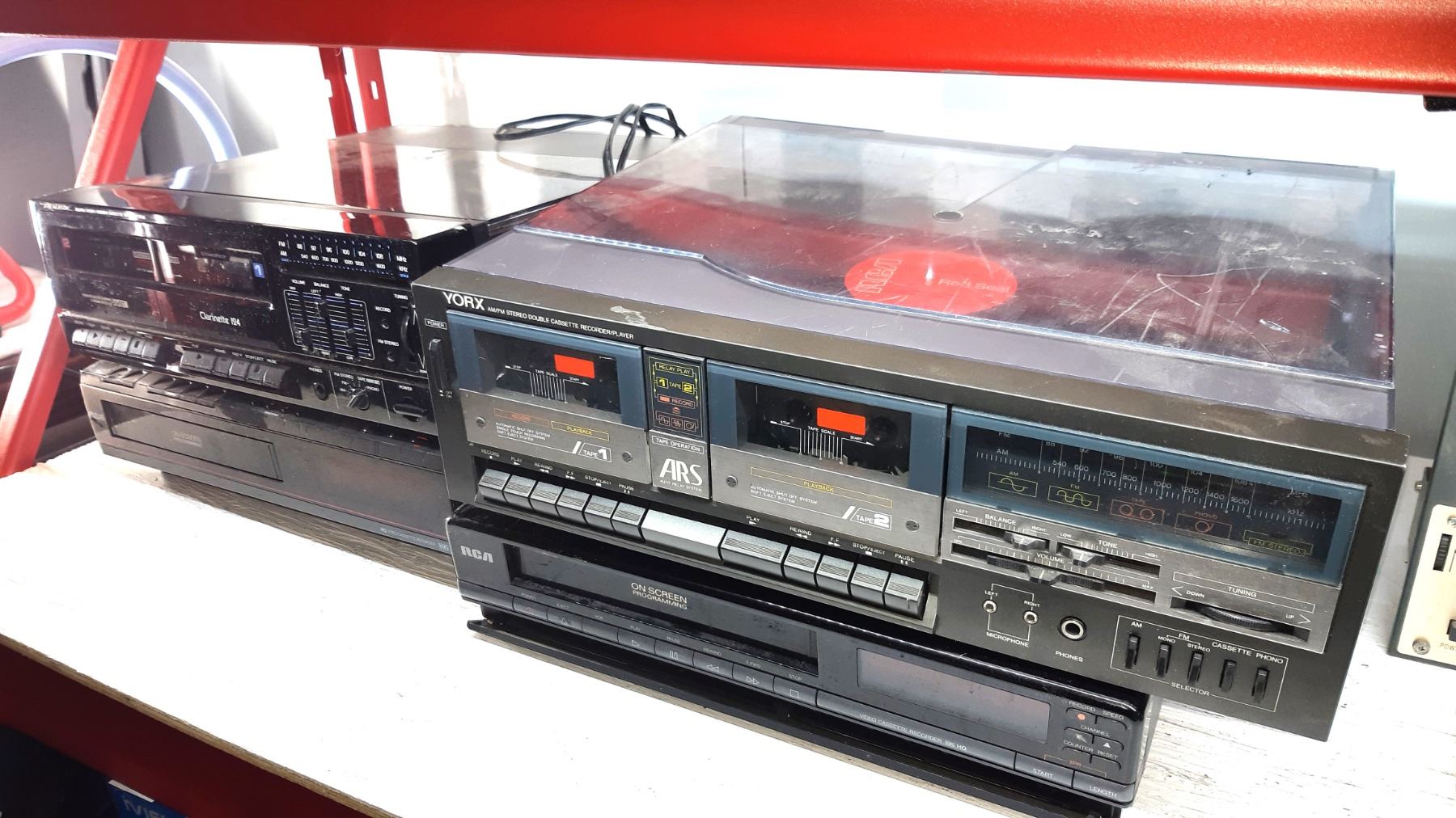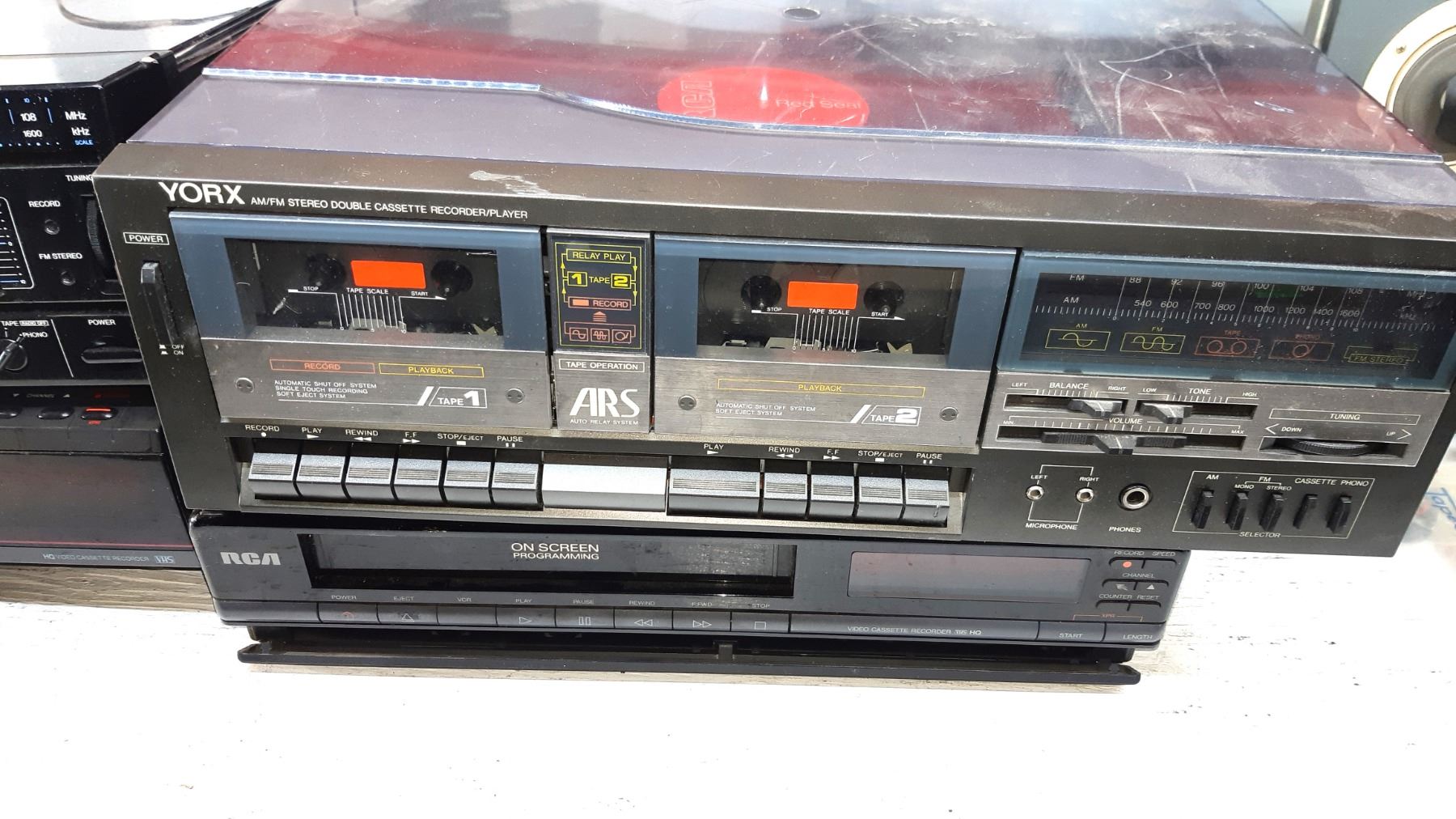 Realistic dual tape deck, RCA video player, York Turntable with dual tape players, RCA Player. Untested pickup at 10 am