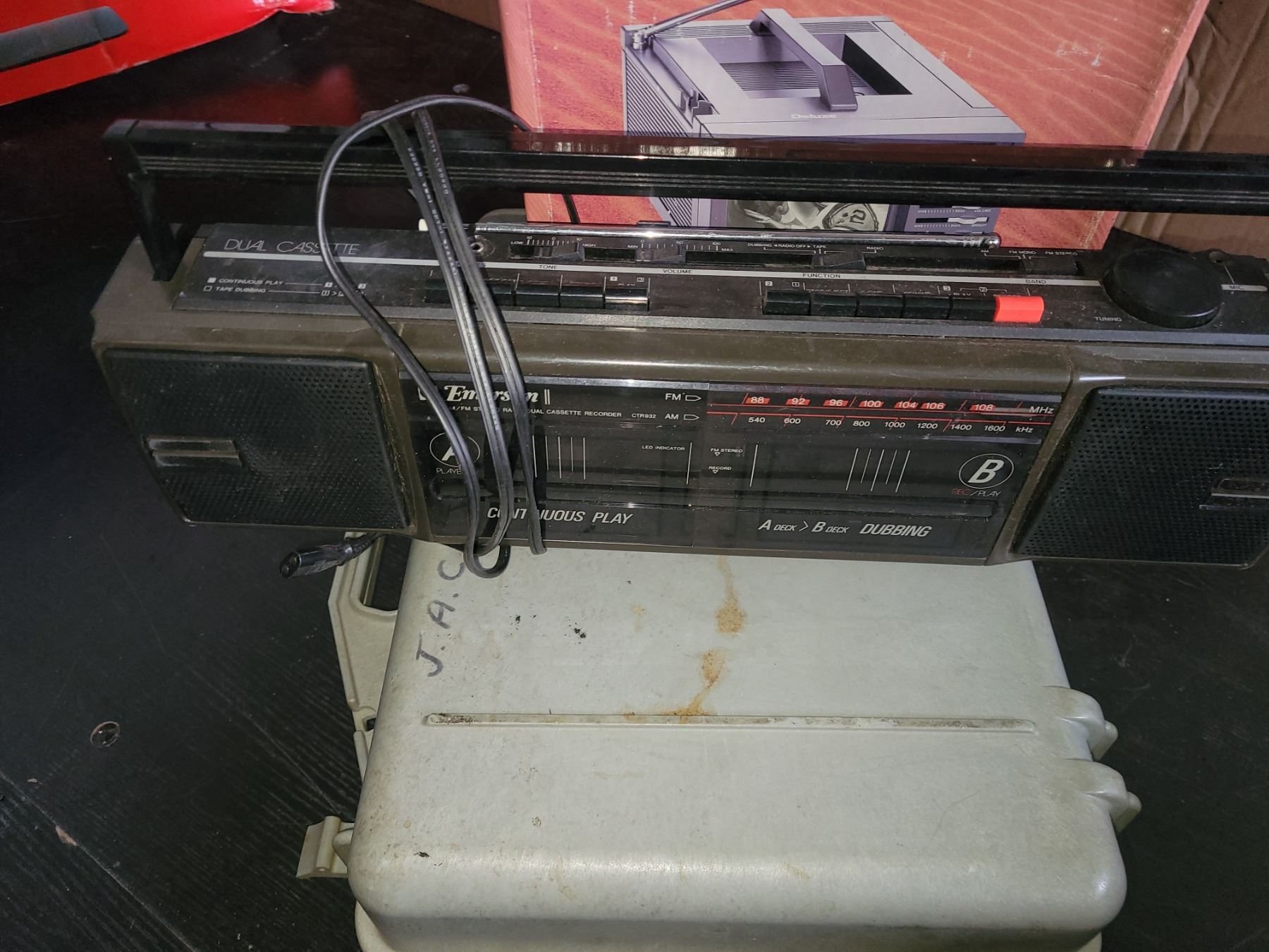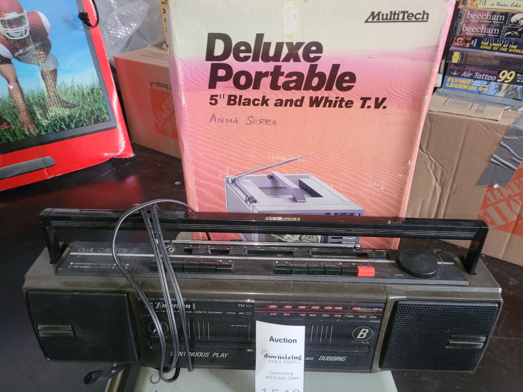 Emerson dual cassette tape deck and radio, MultiTec Deluxe Portable 5" B&W tv. Untested. Pickup at 10 am