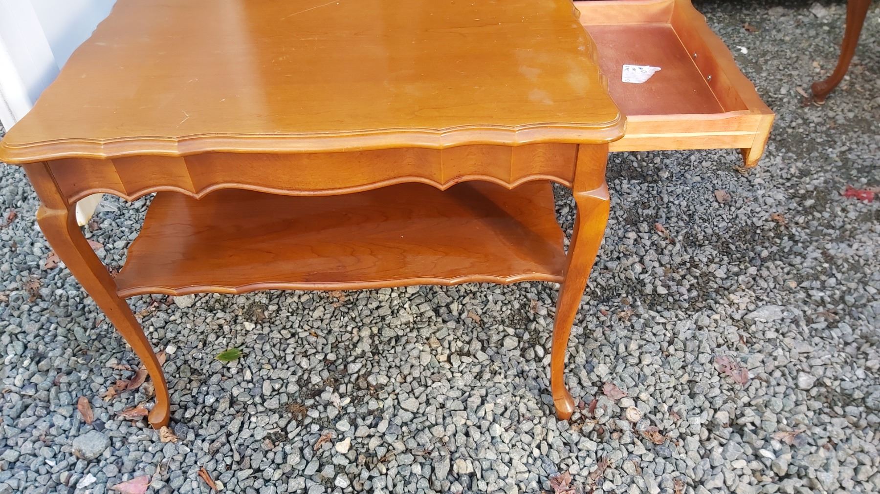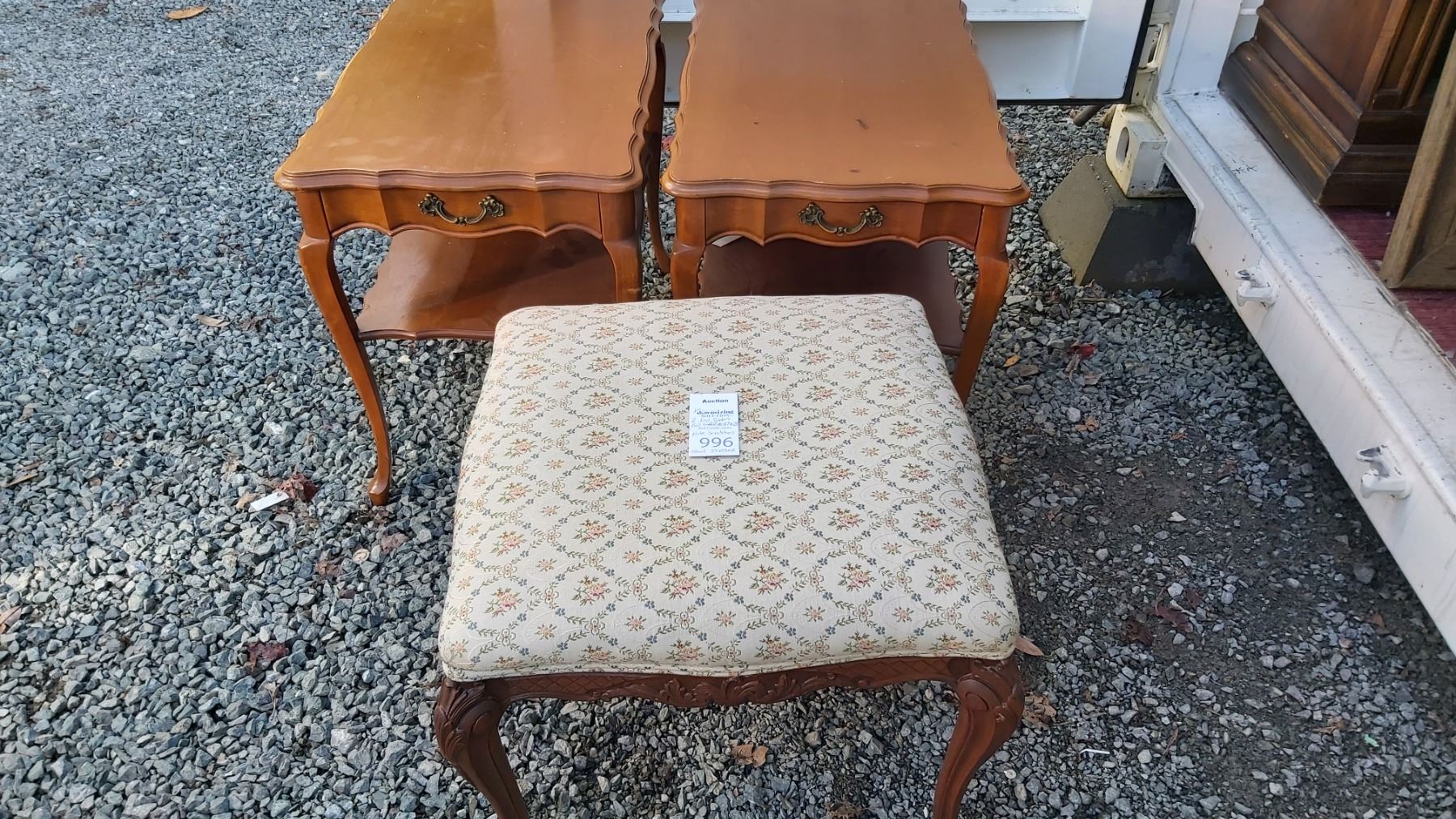 2 vintage end tables with drawers, note cigarette burns and scratches on both. one stool. Pickup at 11 am