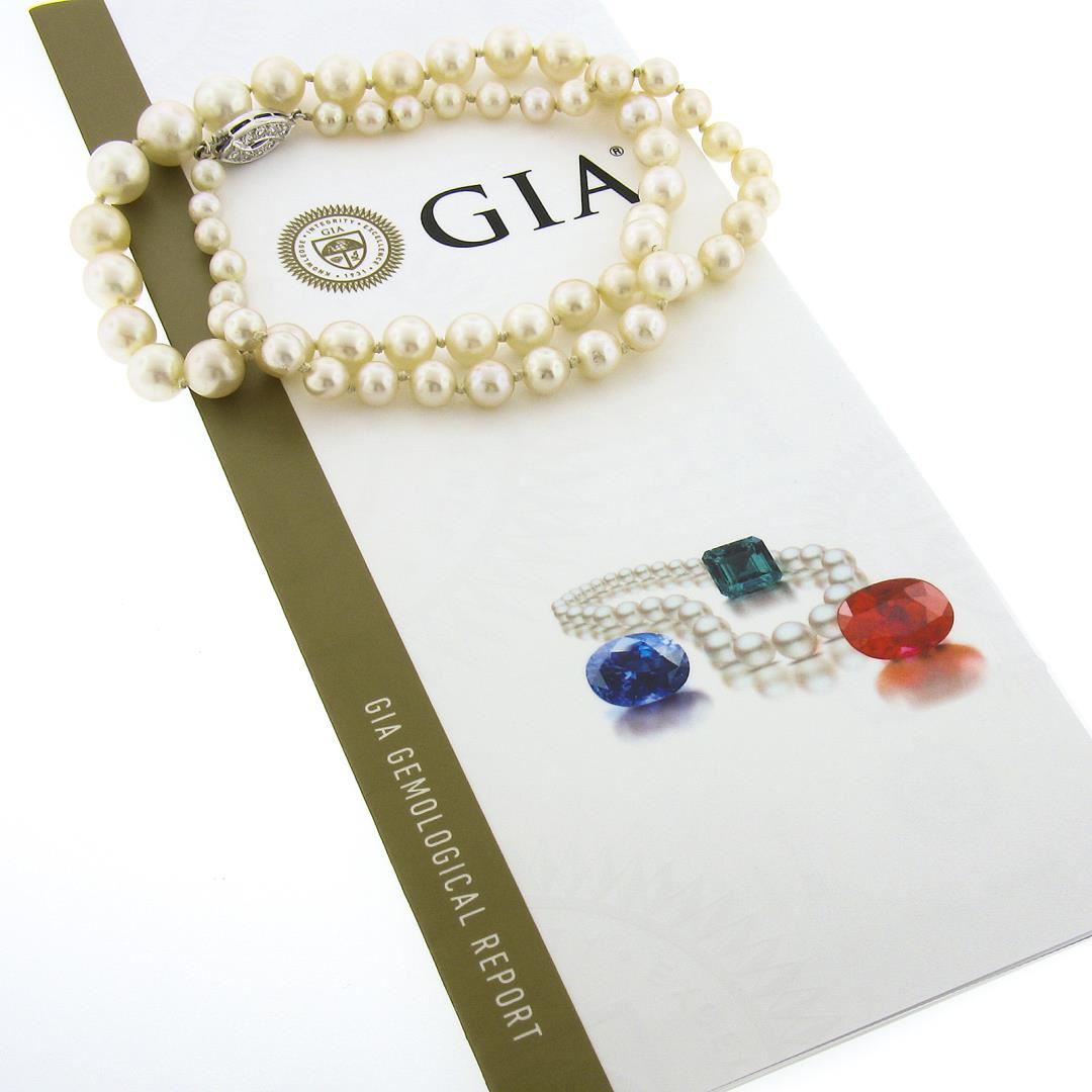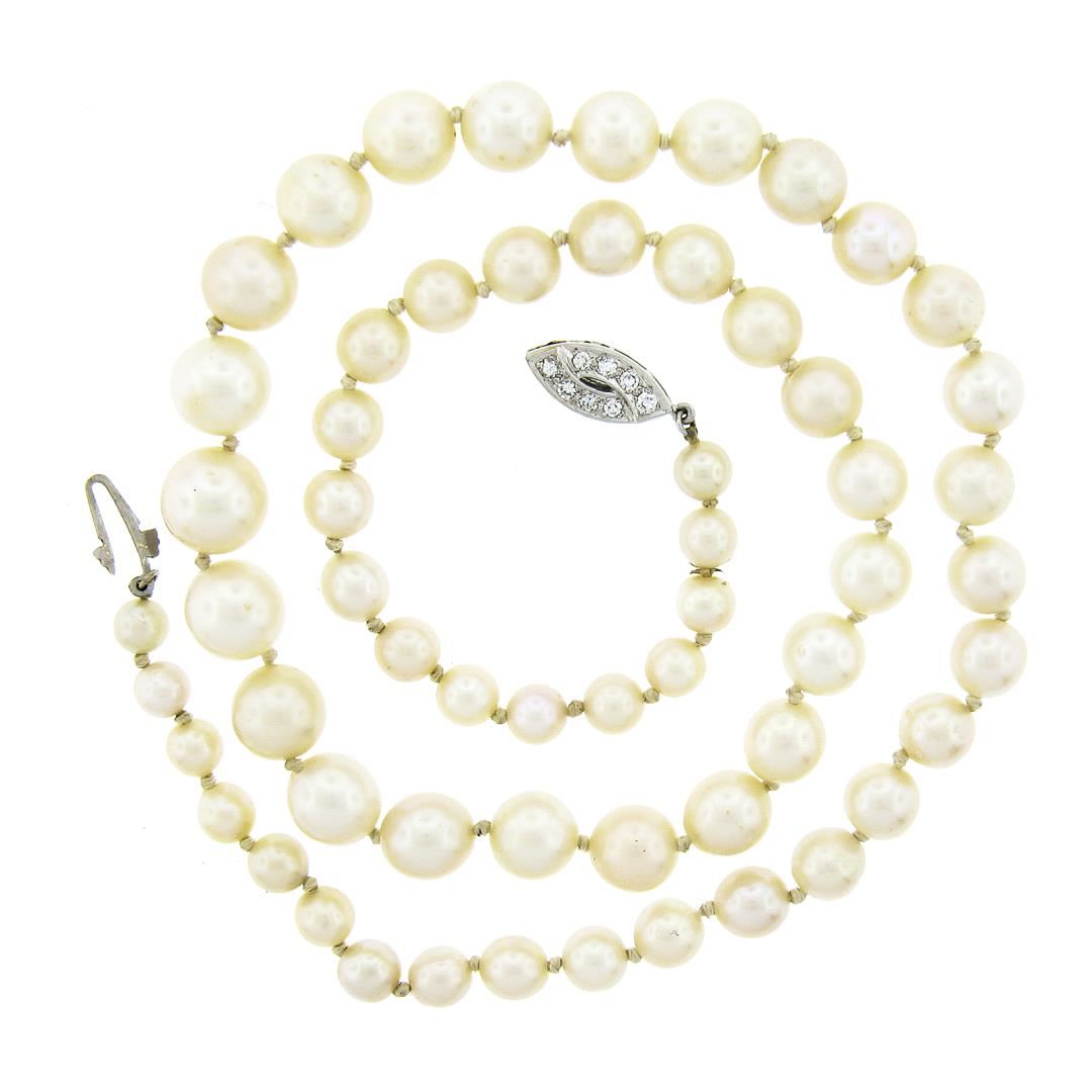 A vintage strand necklace with 14k white gold clasp, featuring 59 GIA graded near round shape cultured akoya pearls (5.34 mm to 10.20 mm), and 16 old single cut natural diamonds (F/G - VS1/VS2 ; 0.64ctw). 21 inch strand link chain, 37.80 grams total weight. Comes with all original relevant certifications.