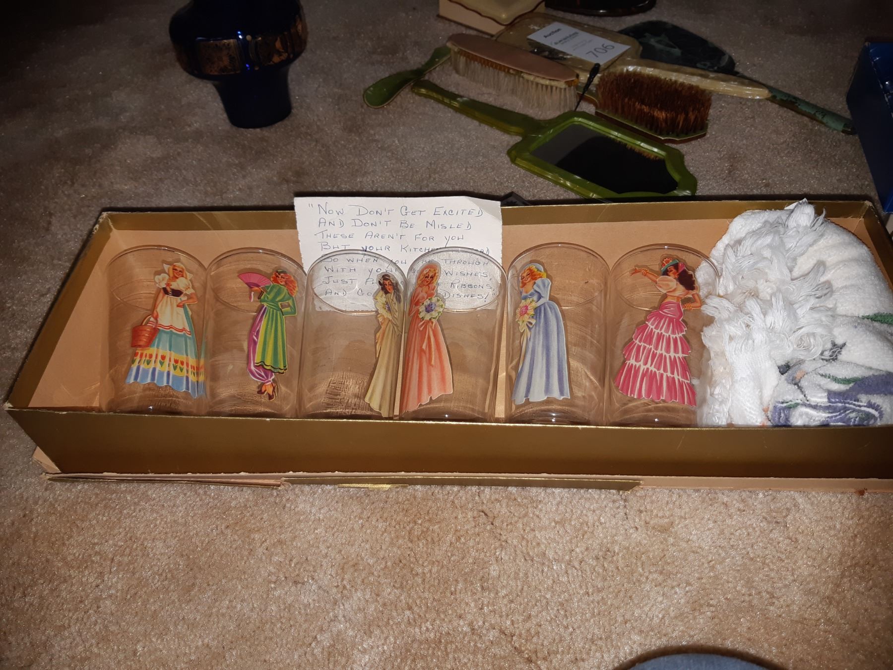 Set of vintage drinking glasses with ladies featured on the front. 2 sets of small drinking classes, 2 blue/gold decanters & chrome cake stand. Bring packing and pickup at 9 am
