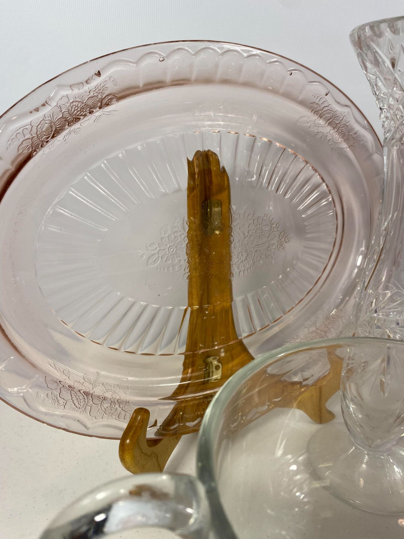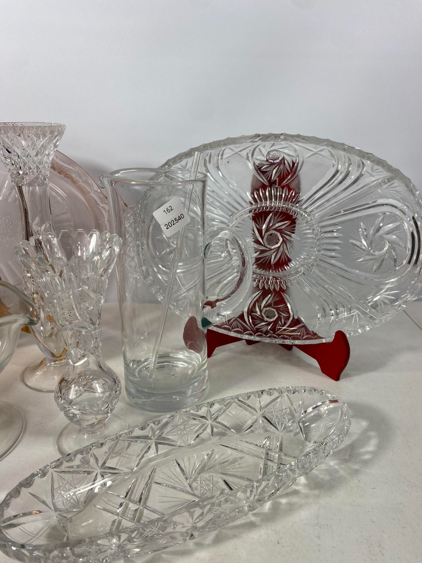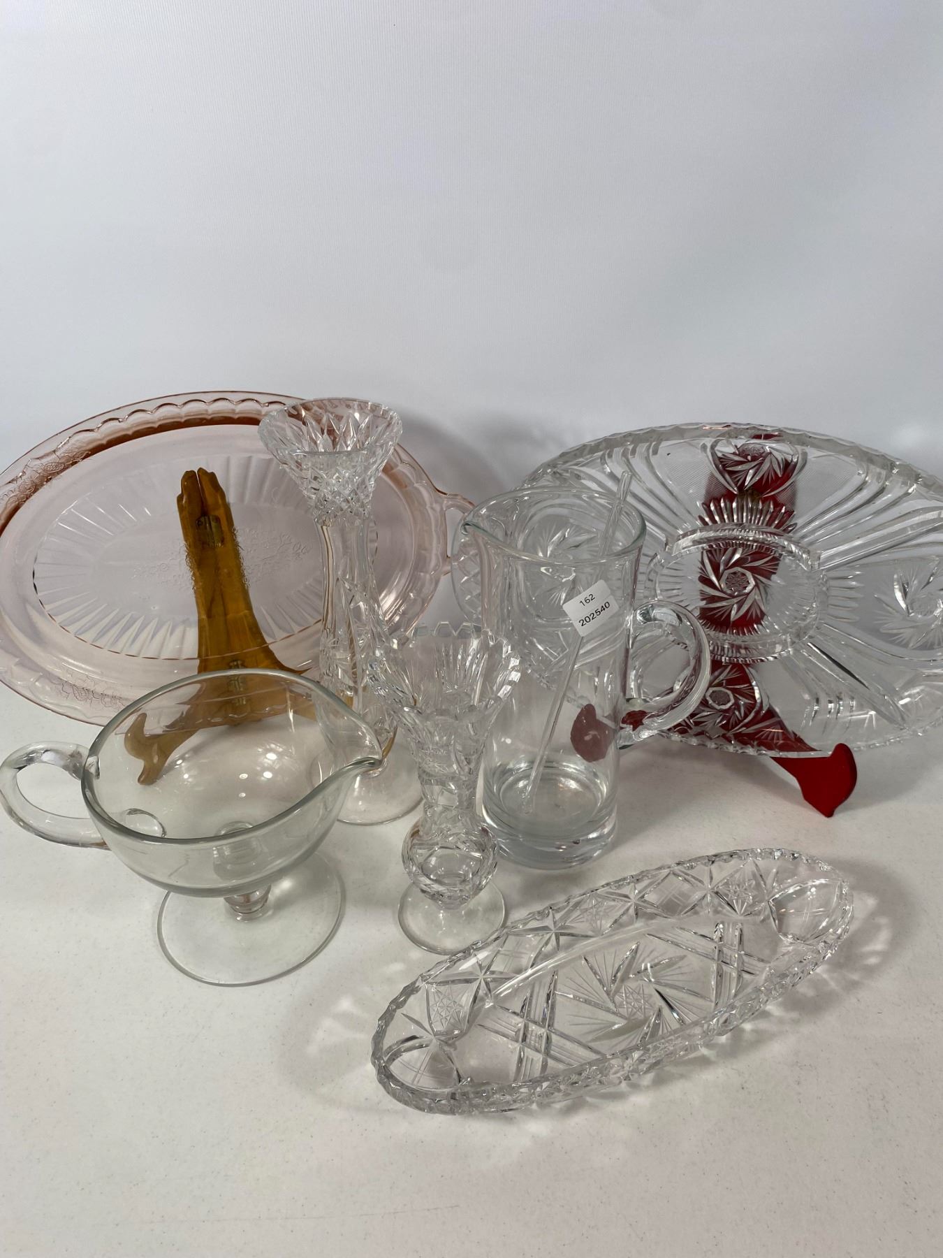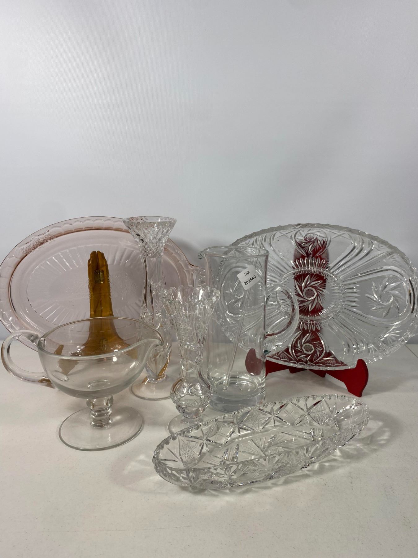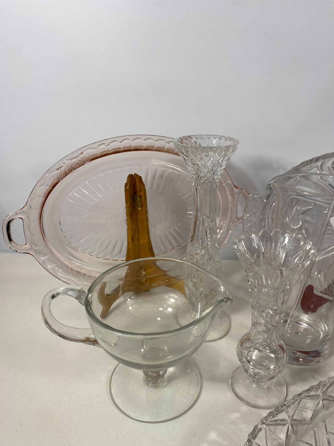Assorted vintage glassware including pink depression-style platter, cut crystal vases, clear pitchers, and serving pieces. A charming decorative variety with mid-century appeal. Light wear typical for age. A great addition for collectors or resale.