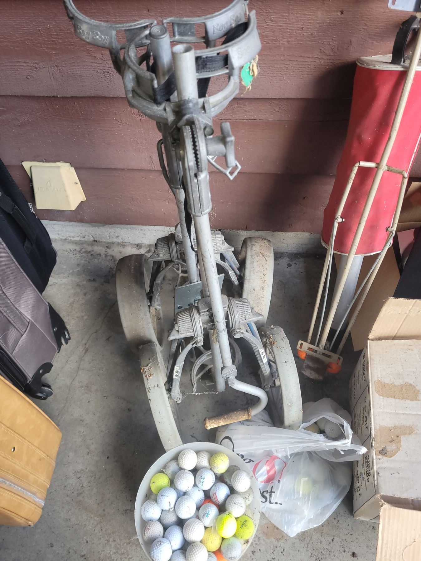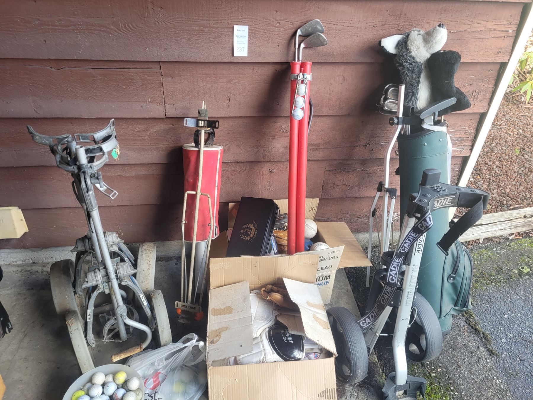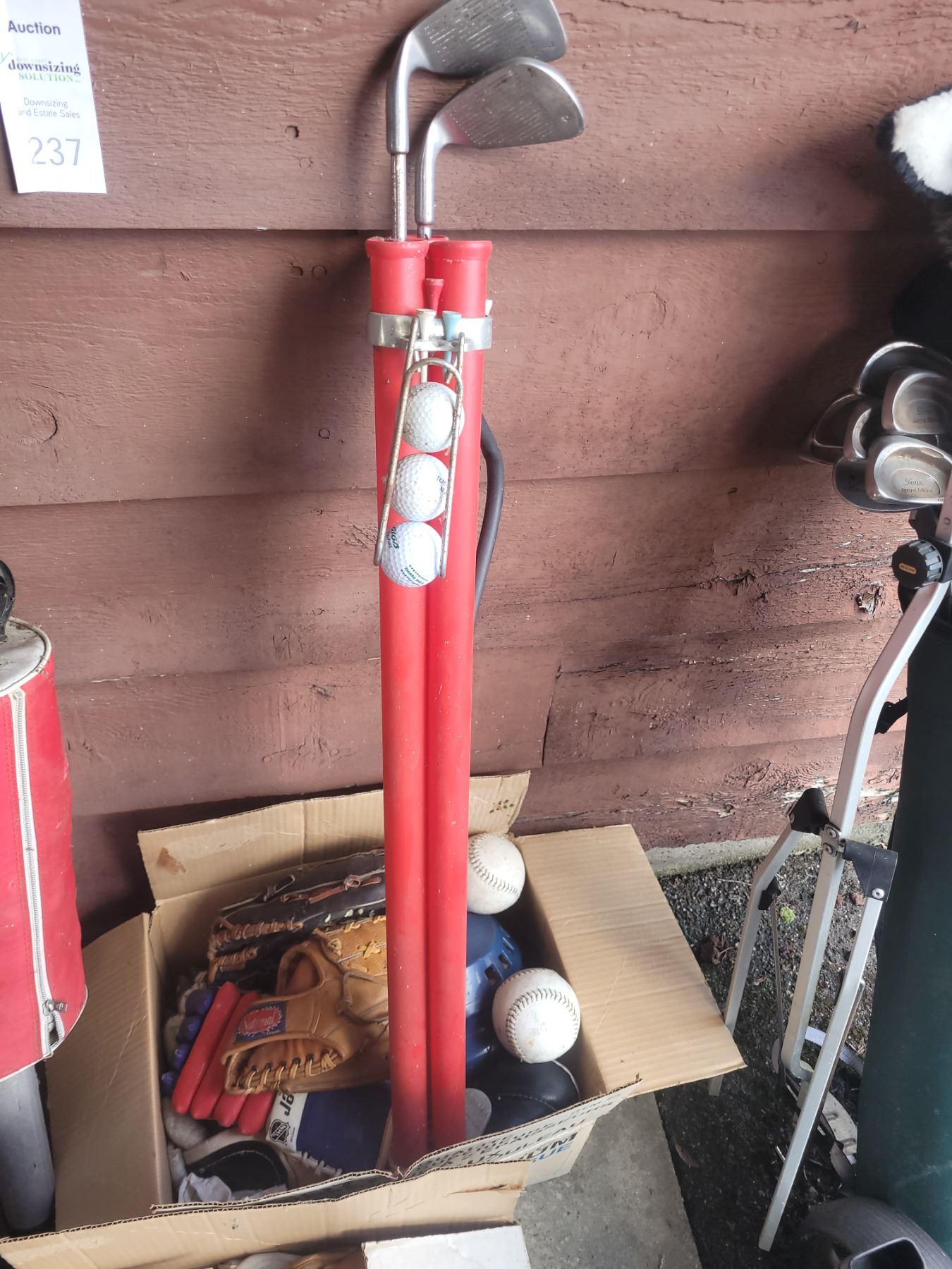 Golf bag and carts, balls, clubs, baseball gloves, balls. Pickup at 10 am
