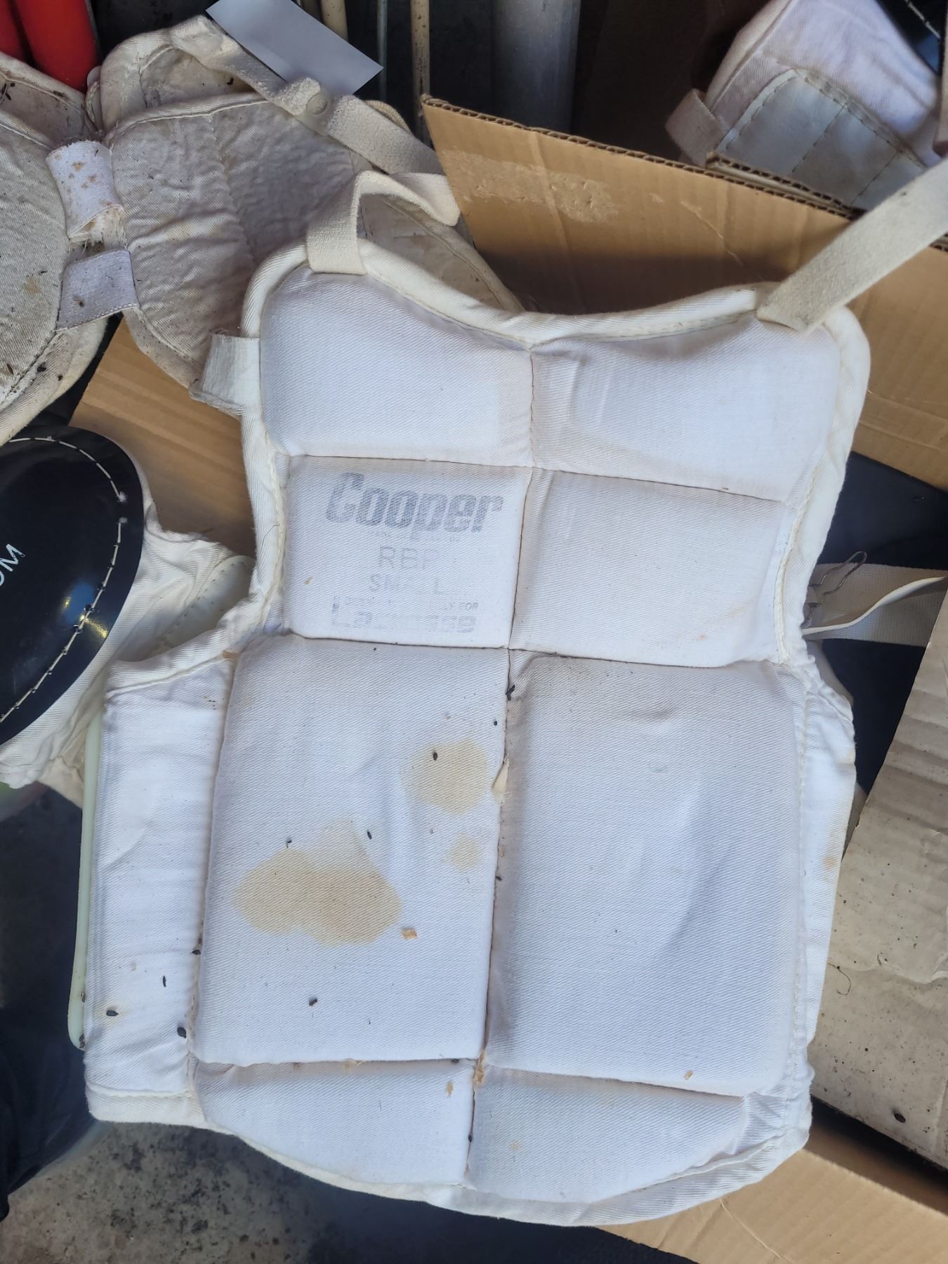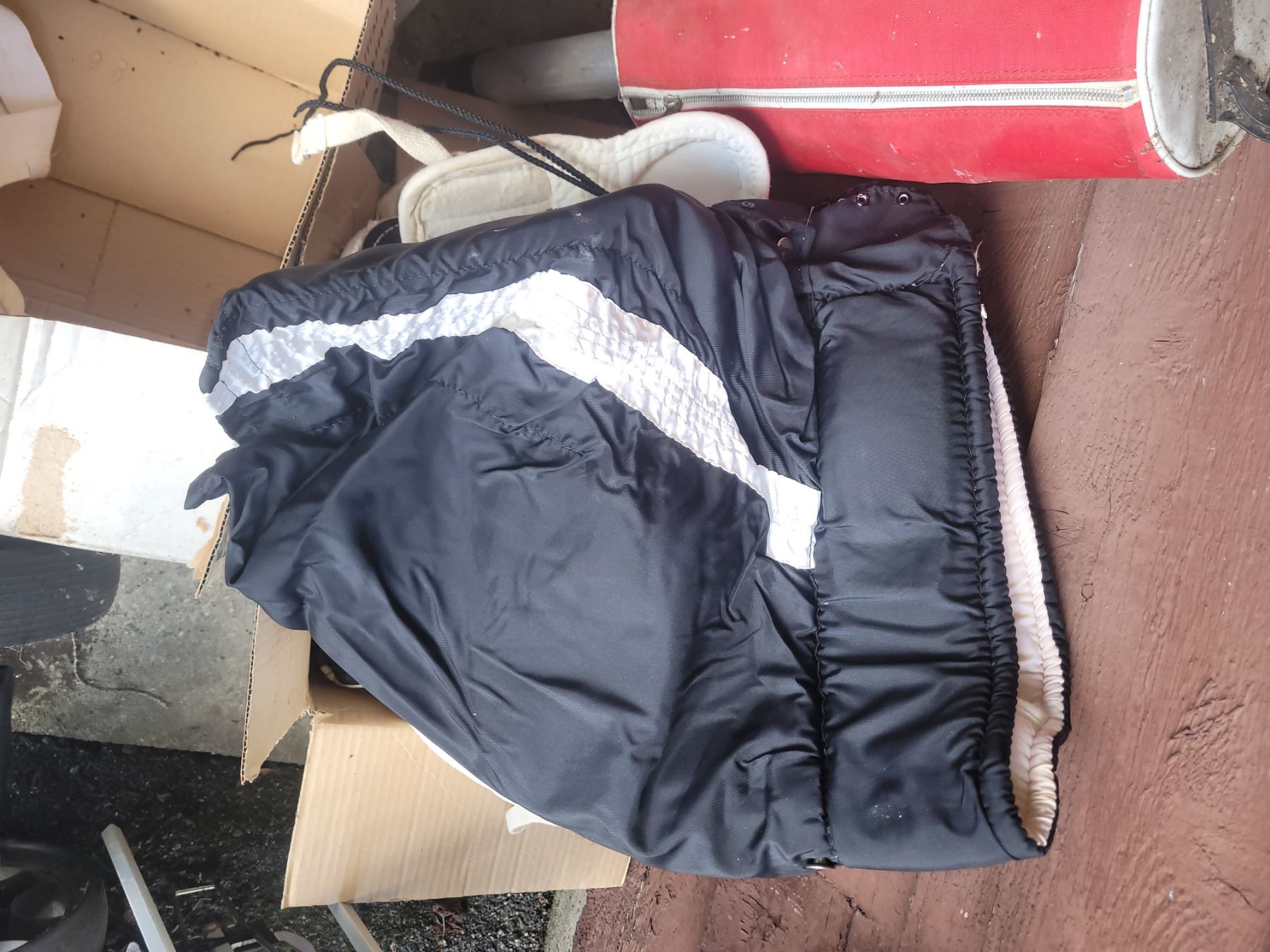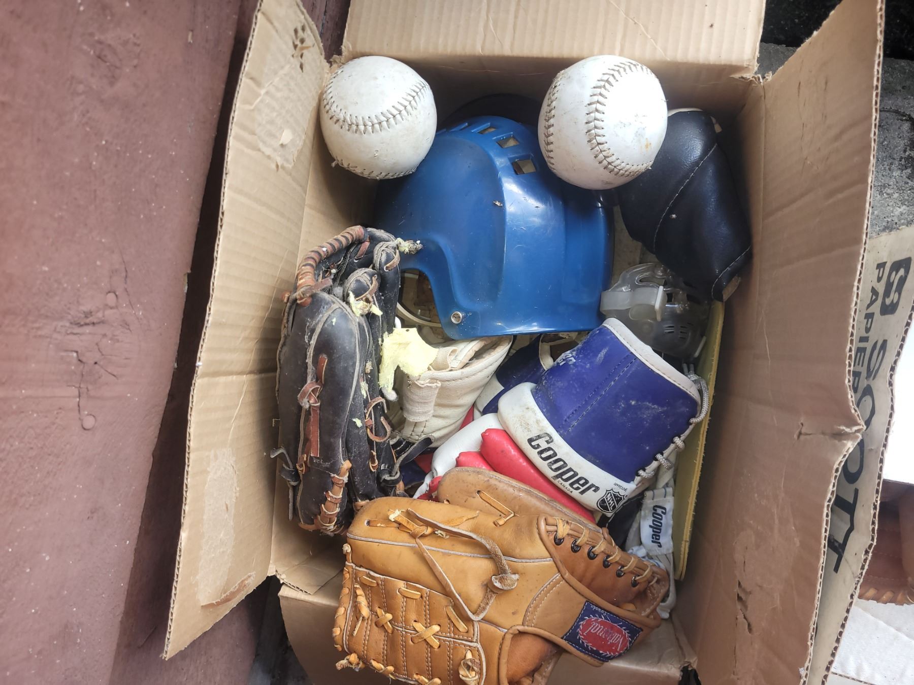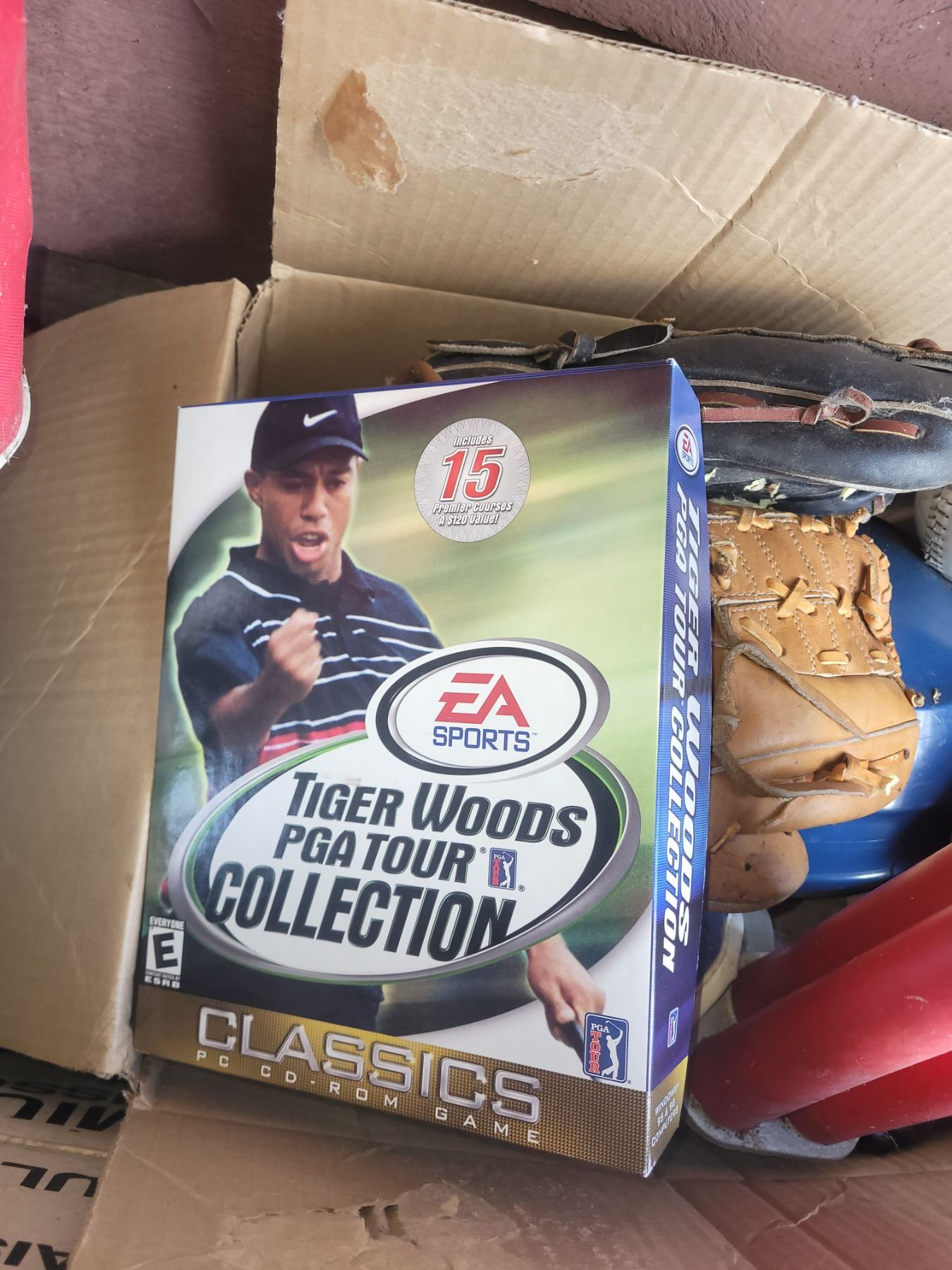 Golf bag and carts, balls, clubs, baseball gloves, balls. Pickup at 10 am