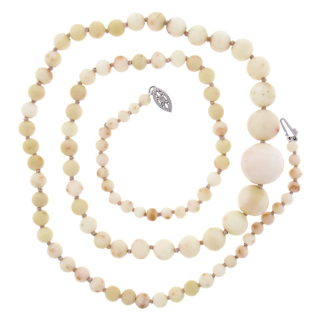 A vintage coral strand necklace with 14k white golf clasp, featuring 97 round bead shape natural corals. It weighs a total of 44.46 grams, graduated from 4.75-16mm wide, and measures 26.5 inches in length.
