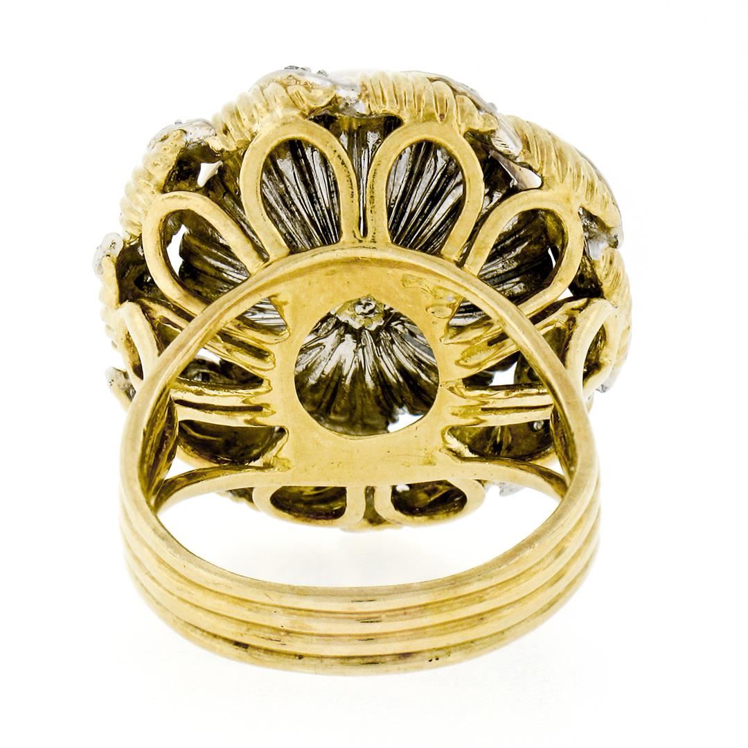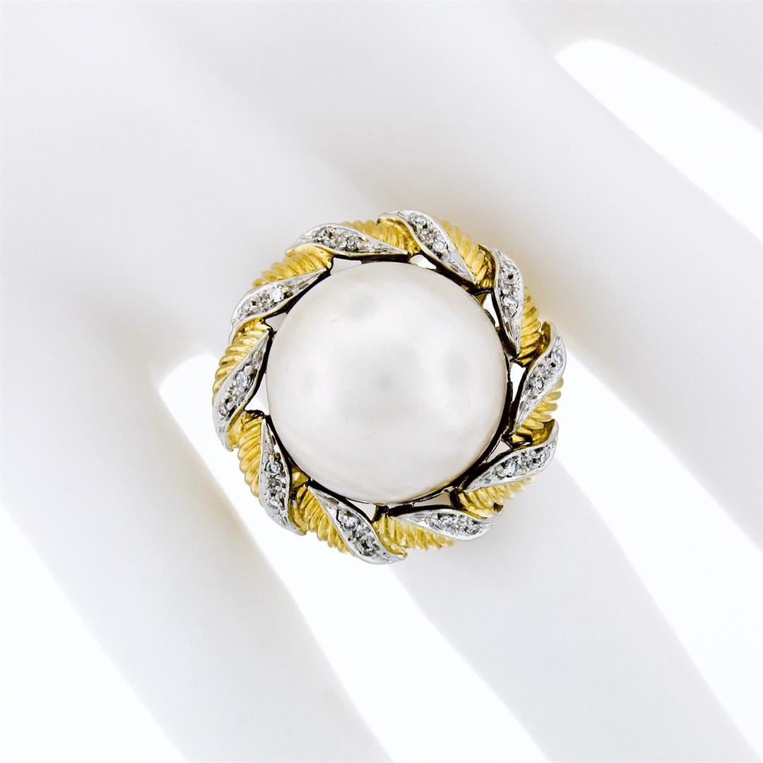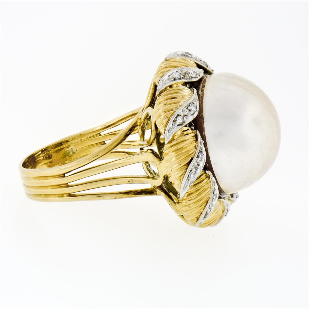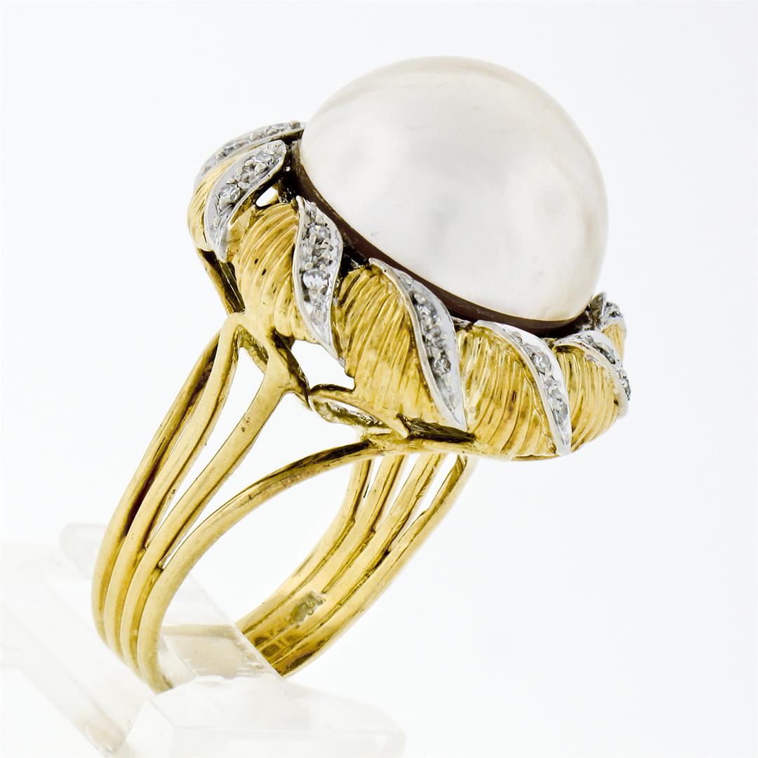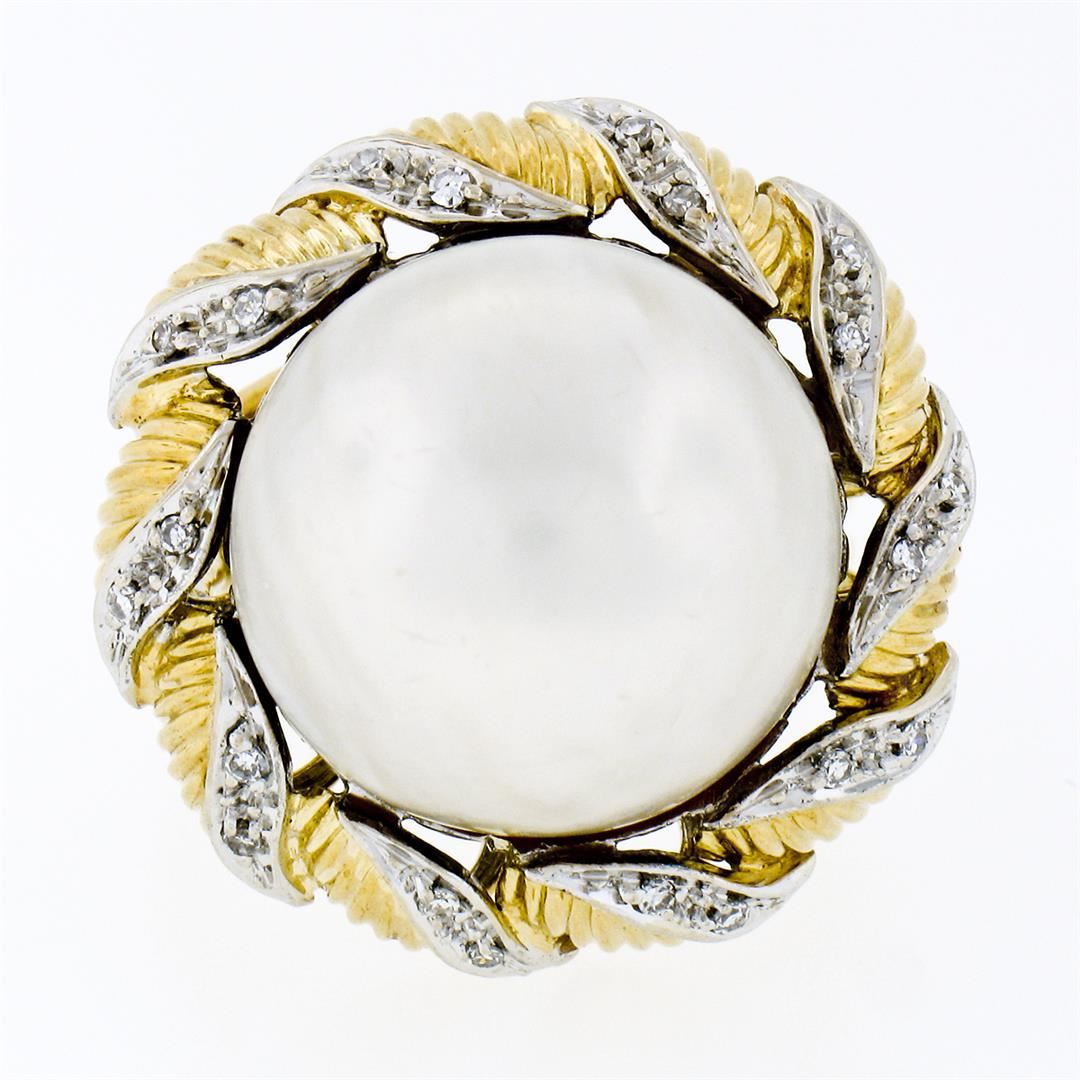 A vintage handmade 18k yellow and white gold swirl ring featuring a round white cultured mabe pearl (16.0mm) and 20 round single cut diamonds (G/H - VS2; 0.25ctw). The ring is size 7.5, weighs a total of 15.13 grams, and measures 23.7mm wide.