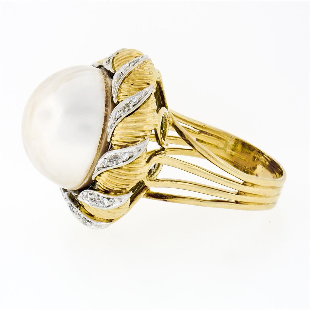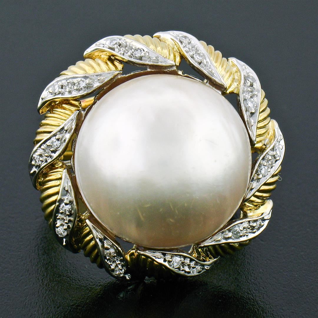 A vintage handmade 18k yellow and white gold swirl ring featuring a round white cultured mabe pearl (16.0mm) and 20 round single cut diamonds (G/H - VS2; 0.25ctw). The ring is size 7.5, weighs a total of 15.13 grams, and measures 23.7mm wide.