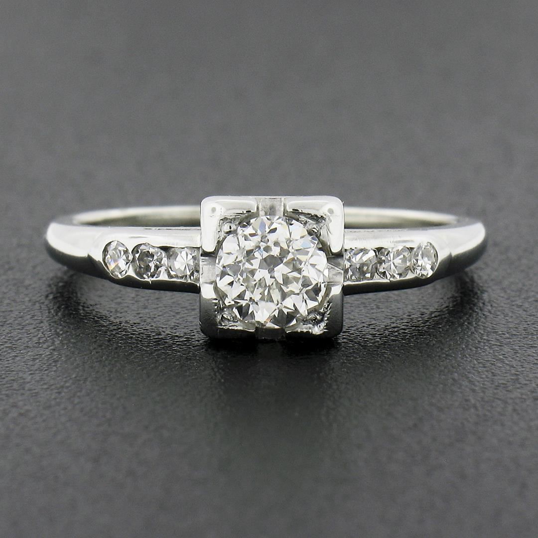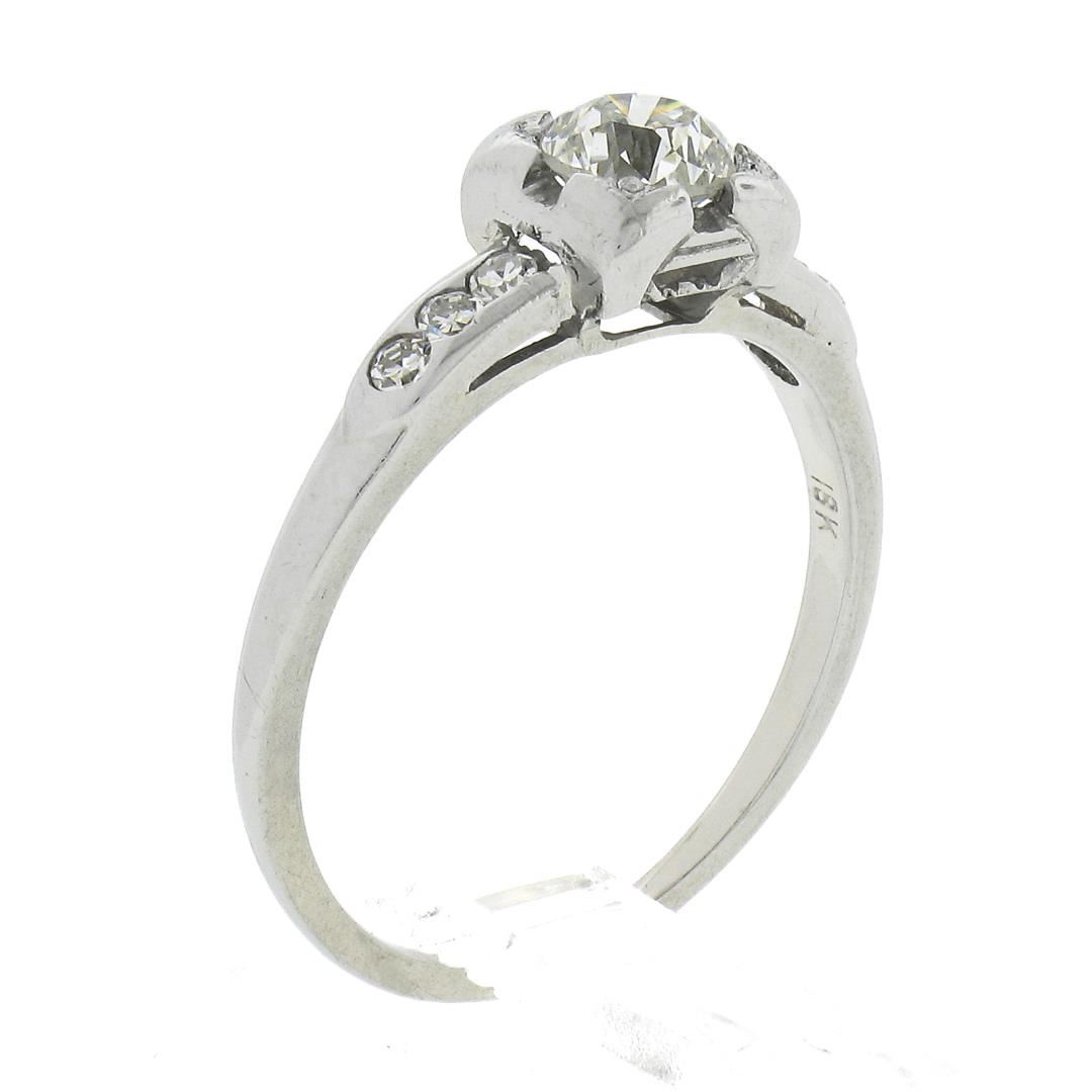 A vintage solid 18k white gold engagement ring by JABEL, featuring 1 GIA graded old European cut natural diamond (J - SI1 ; 0.49ct), and 6 old single cut natural diamonds (G-H - VS2-SI1 ; 0.08ctw). The ring is size 6.0, weighs a total of 2.05 grams, and measures 6mm wide. Comes with all original relevant certifications.