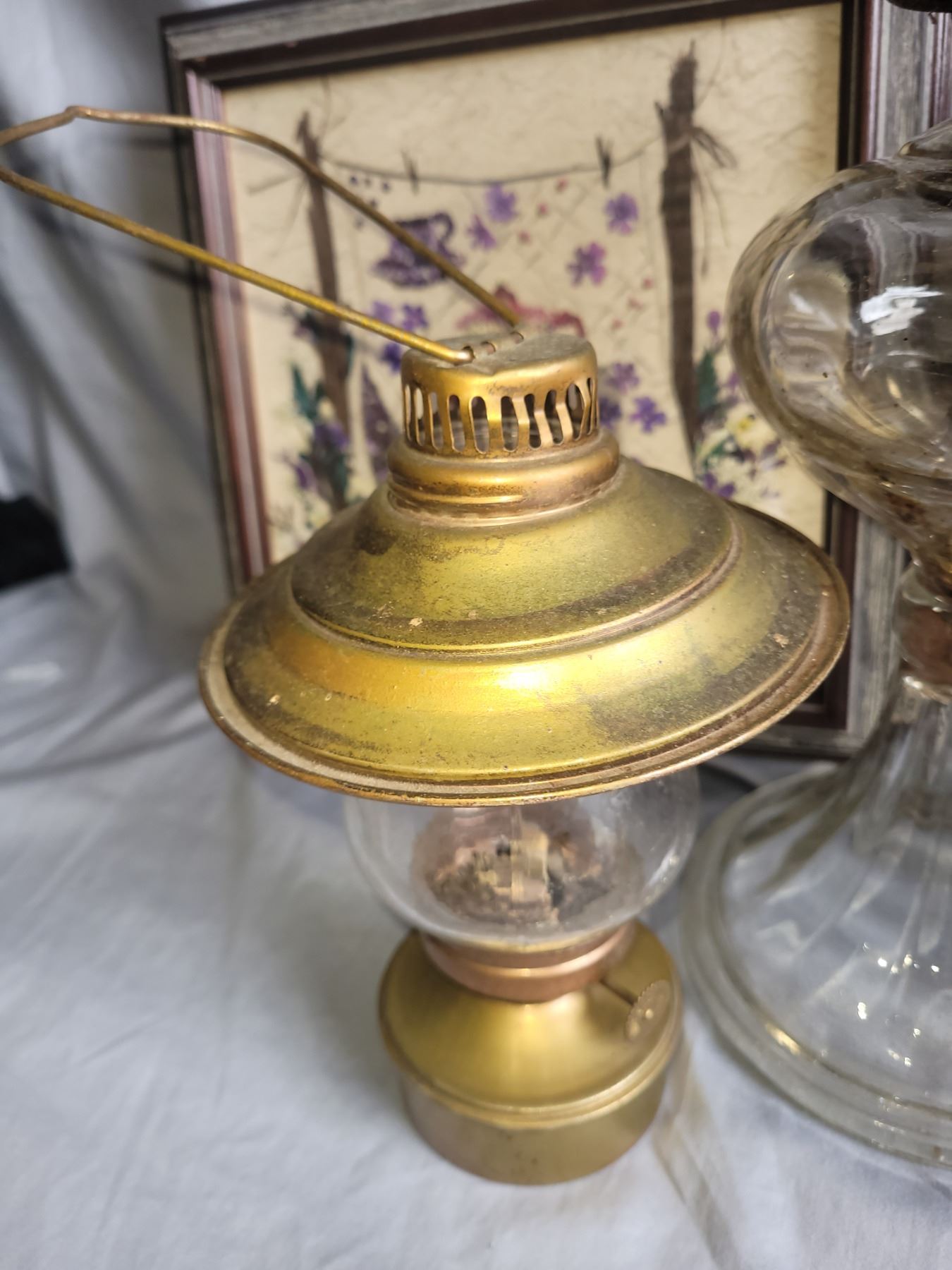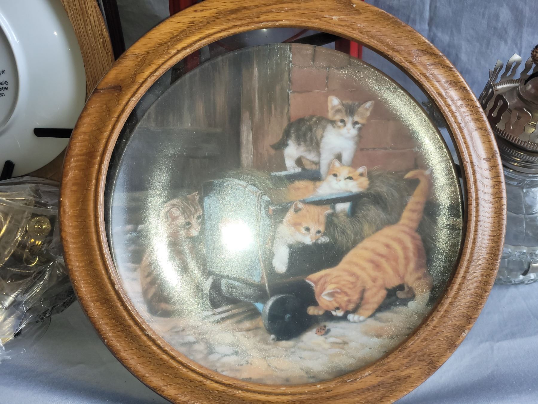 Vintage kerosene lamps, and framed plates of cats. Pickup at 9 am