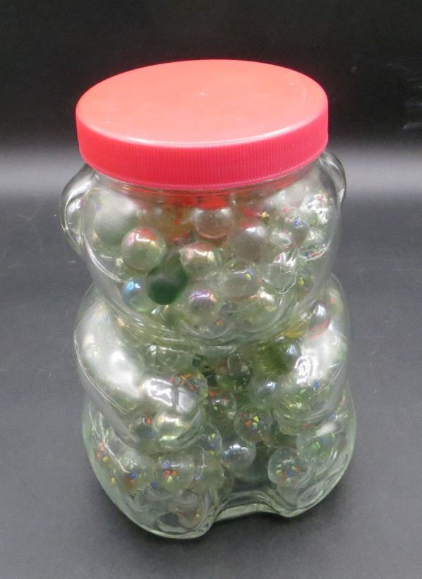 Vintage Kraft Glass Peanut Butter Bear 7.5" Tall Jar Full Of Vintage Marbles