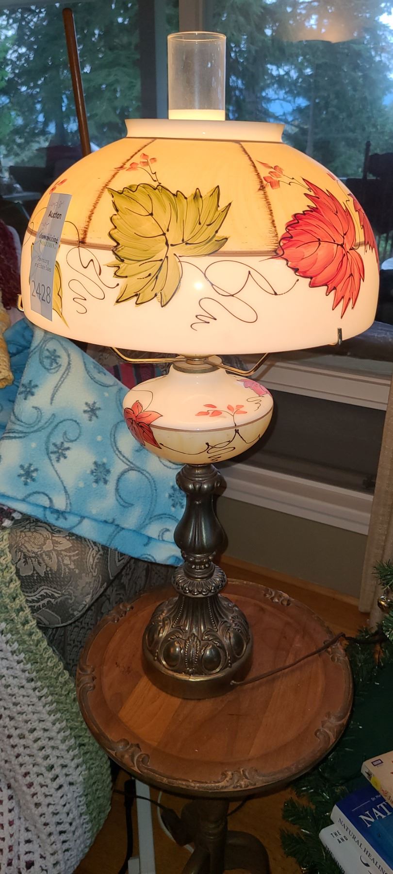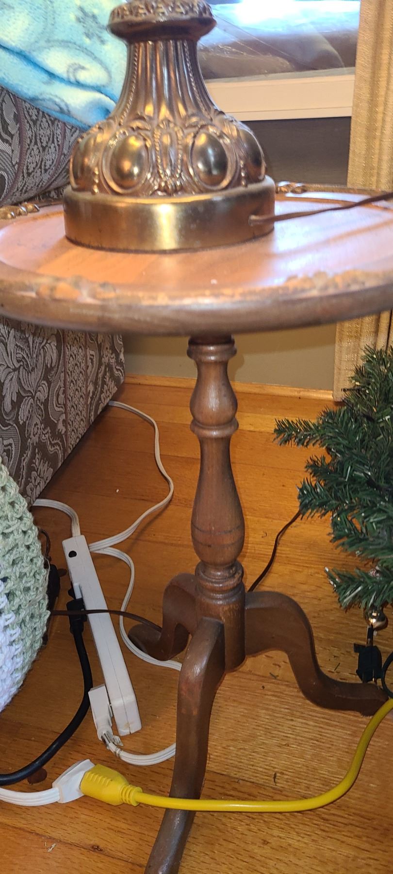 Vintage 30" glass lamp on metal base and small round wood table with tri foot pedestal. Pickup at 10 am