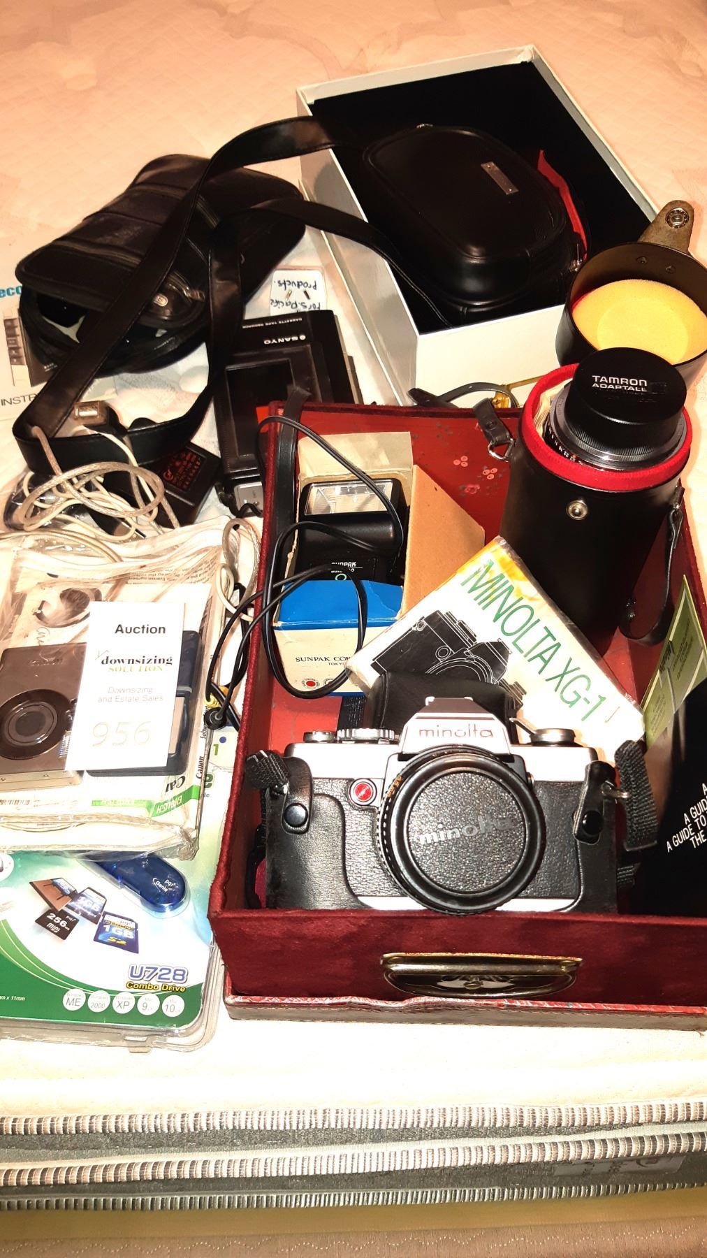 Vintage Minolta Film Camera and Tamrin Zoom lens. Digital Canon Camera and s and more electronics. Category A. Pick up at 9am.