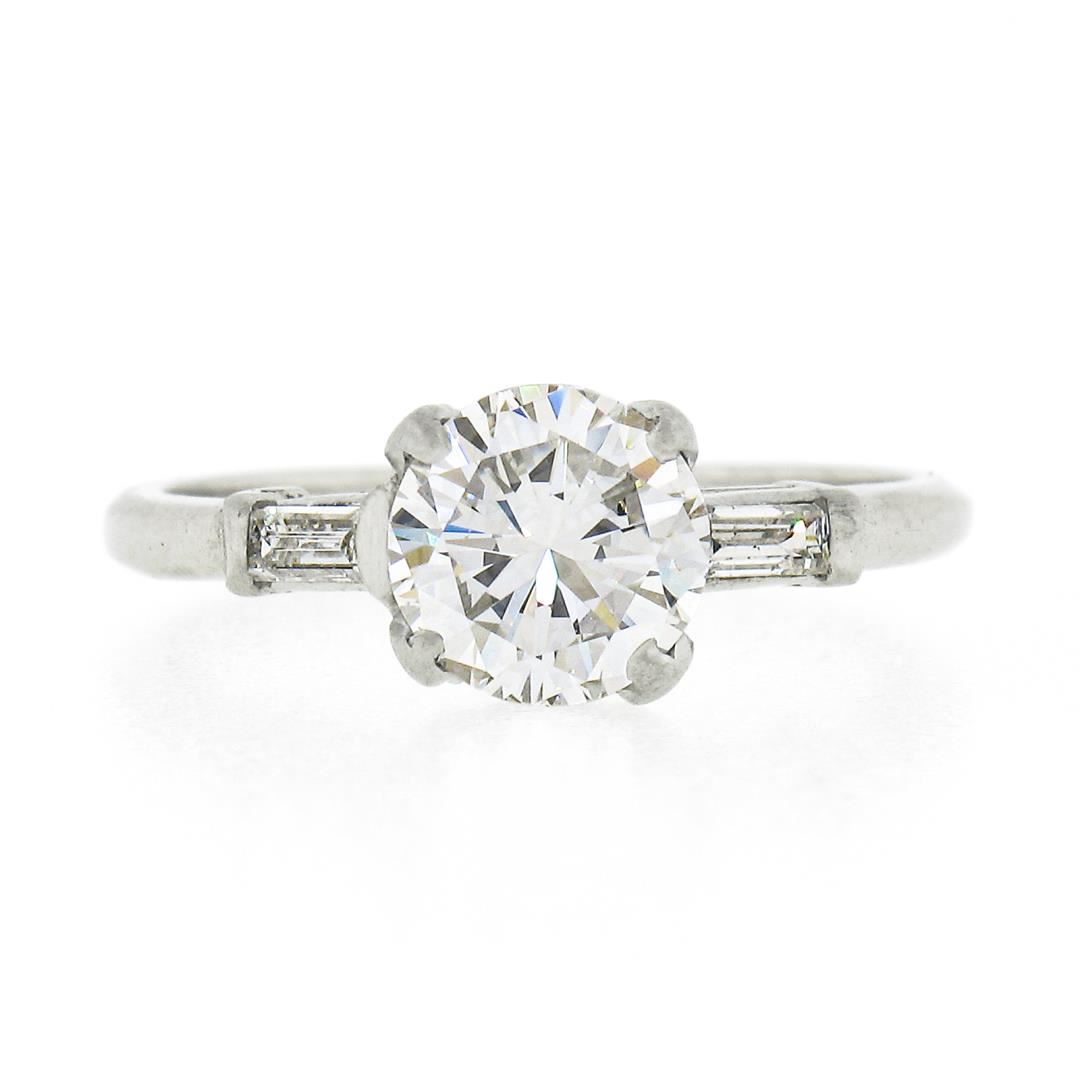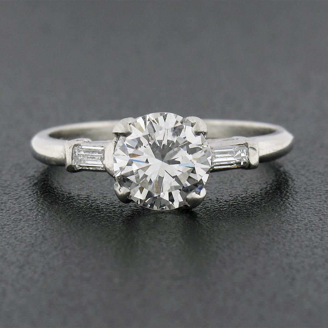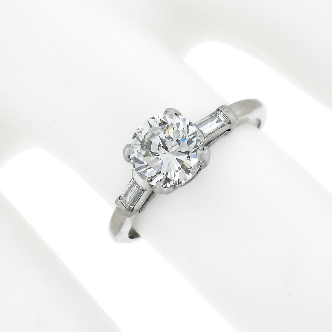 A vintage solid platinum engagement ring, with 1 GIA graded round brilliant cut natural diamond (F - VS1 ; 0.94ct), and 2 straight baguette cut natural diamonds (F/G - VS1/VS2 ; 0.20ctw). The ring is size 4.5, weighs a total of 2.79 grams, and measures 6.3mm wide. Comes with all original relevant certifications.