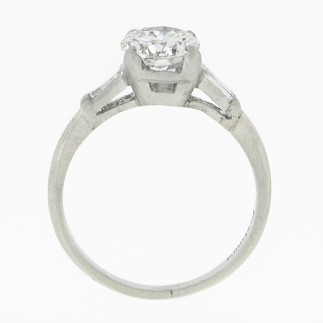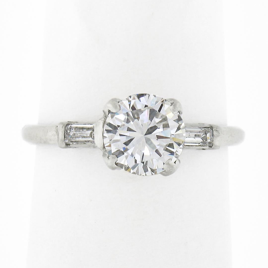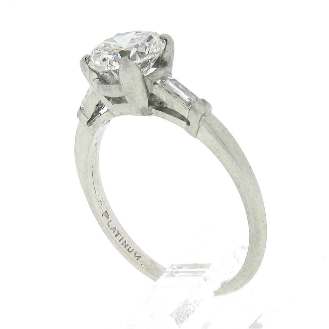 A vintage solid platinum engagement ring, with 1 GIA graded round brilliant cut natural diamond (F - VS1 ; 0.94ct), and 2 straight baguette cut natural diamonds (F/G - VS1/VS2 ; 0.20ctw). The ring is size 4.5, weighs a total of 2.79 grams, and measures 6.3mm wide. Comes with all original relevant certifications.