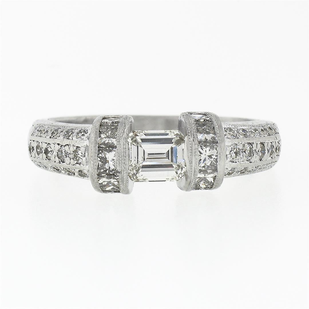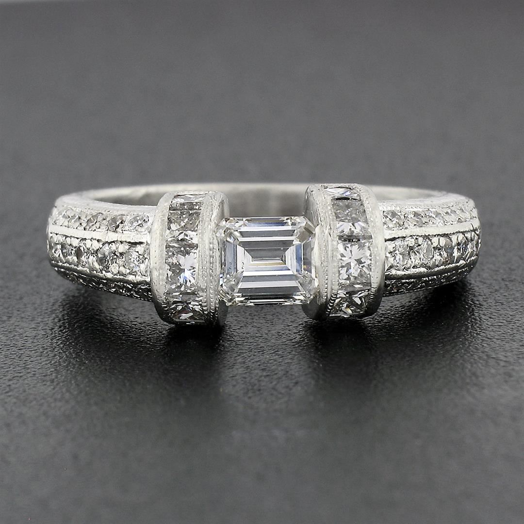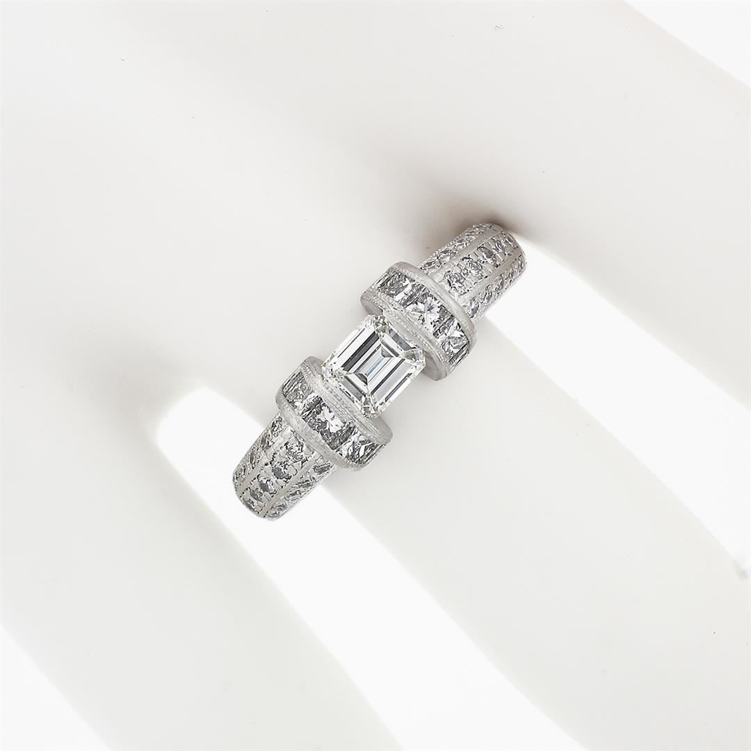 A vintage solid platinum floating band ring, with 1 emerald cut natural diamond (G - VS1 ; 0.50ct ), and 10 princess cut natural diamonds (G/H - VS1/VS2 ; 0.50ct), with 30 round brilliant cut natural diamonds (G/H - VS1/VS2 ; 0.35ct). The ring is size 6.5, weighs a total of 7.76 grams, and measures 6.6mm wide.